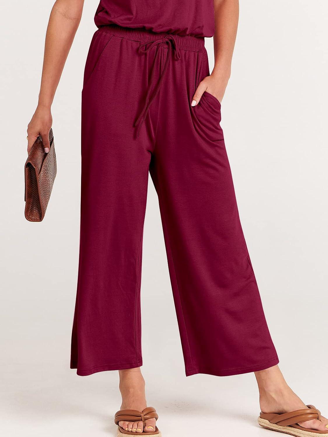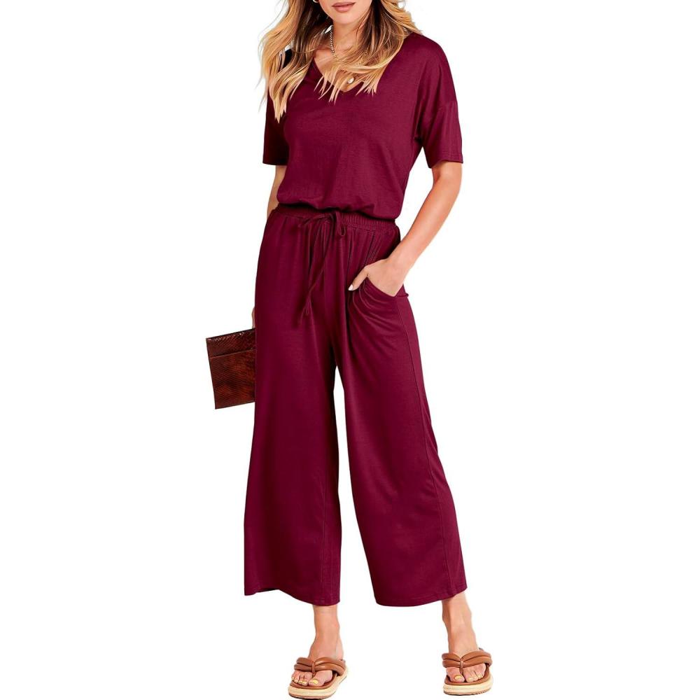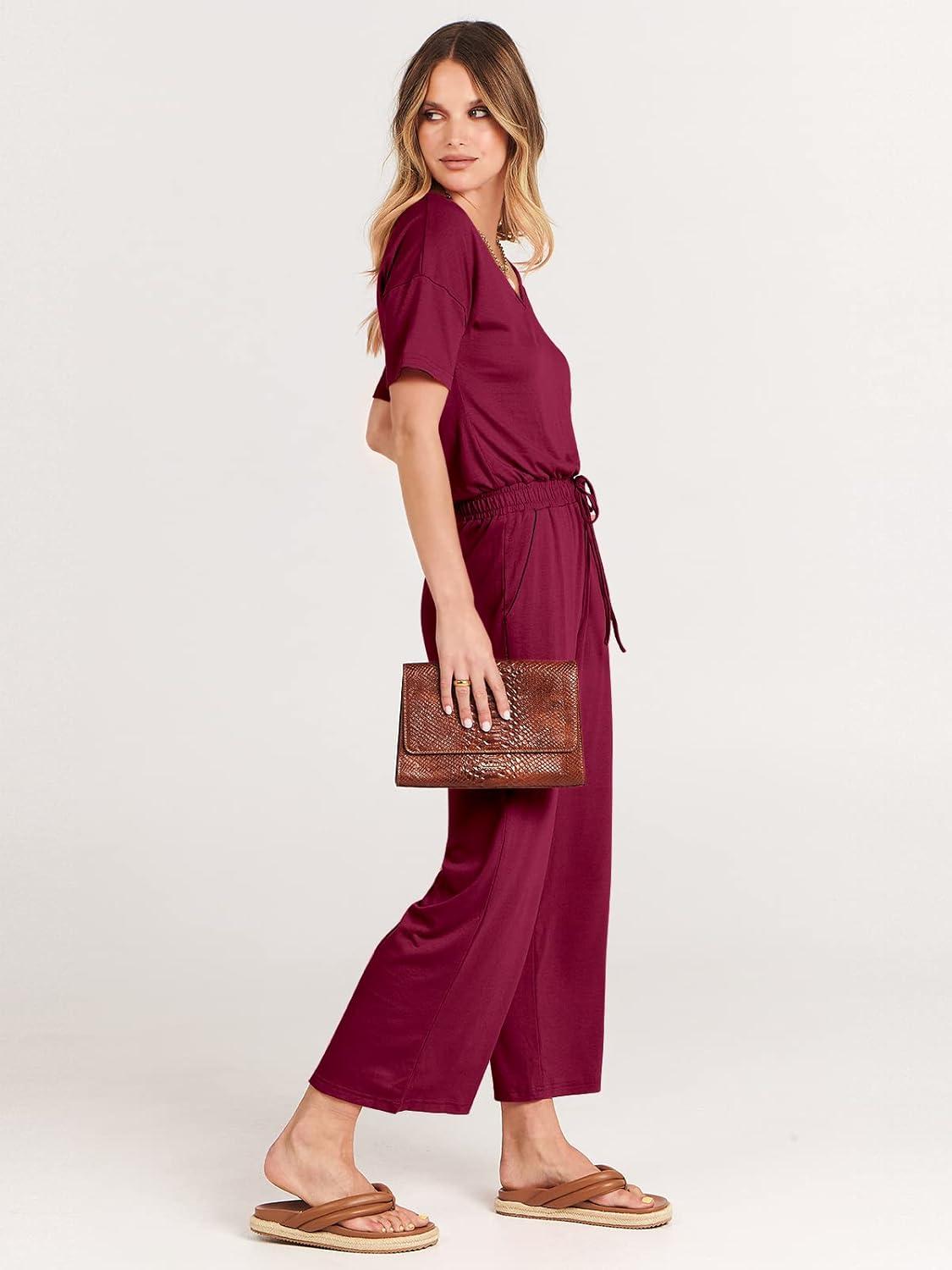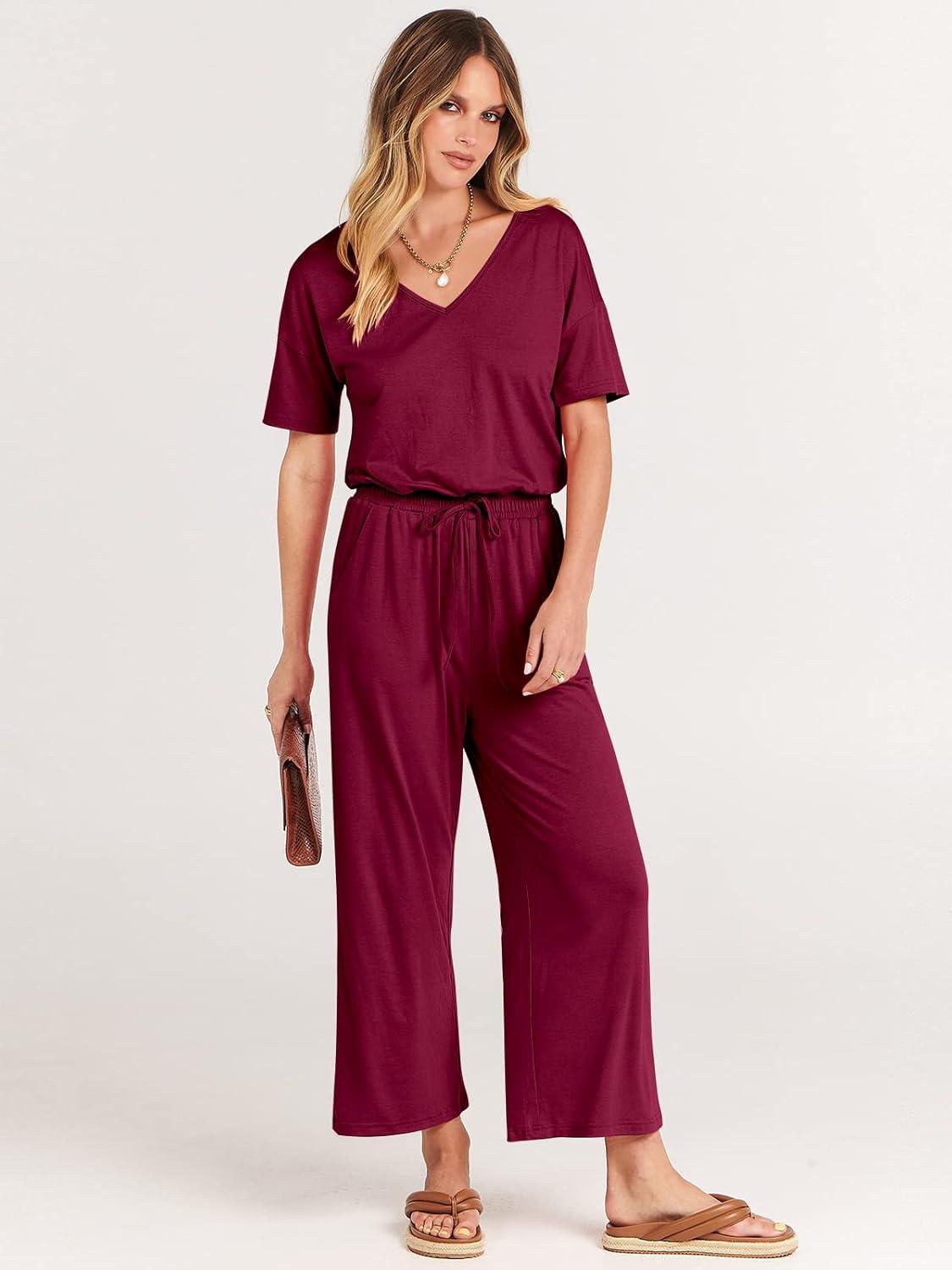 imageANRABESS Women Summer Casual Short Sleeve V Neck Elastic Waist Wide Leg Cropped Pants Jumpsuits Rompers with Pockets02wine Red