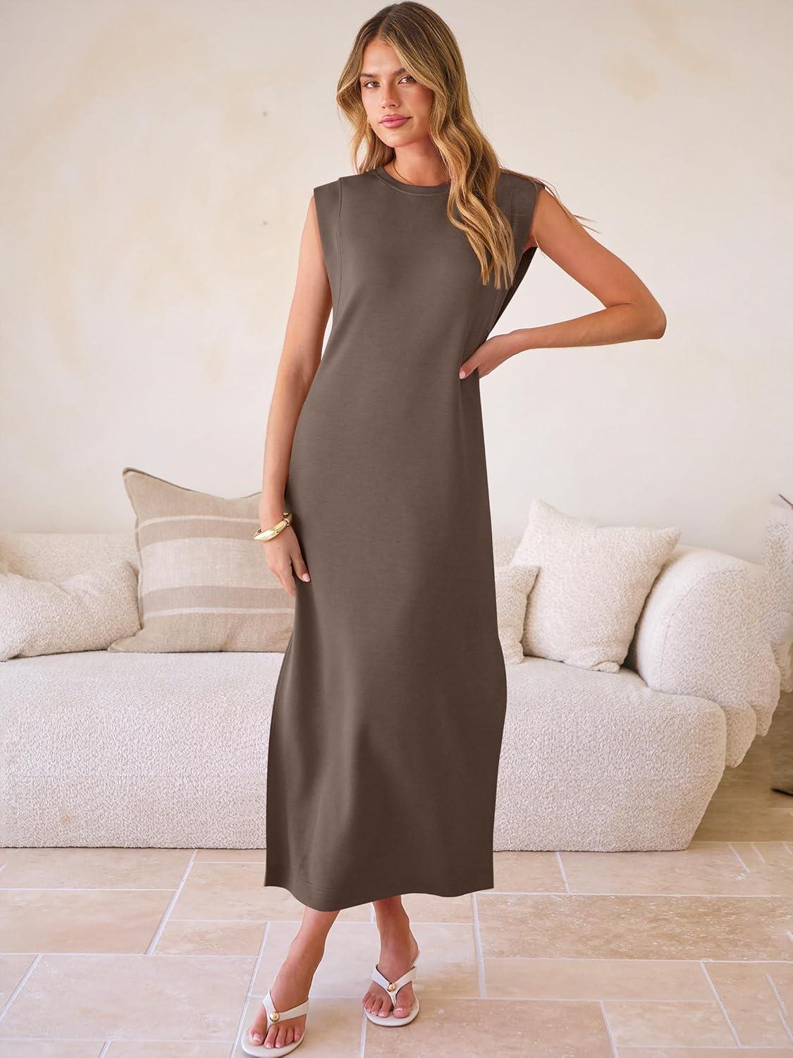 ANRABESS Women Summer Casual Sleeveless Maxi Dress 2026 Crewneck Loose Split Wrinkle-Free Beach Travel Vacation Long Sundress(Brown)