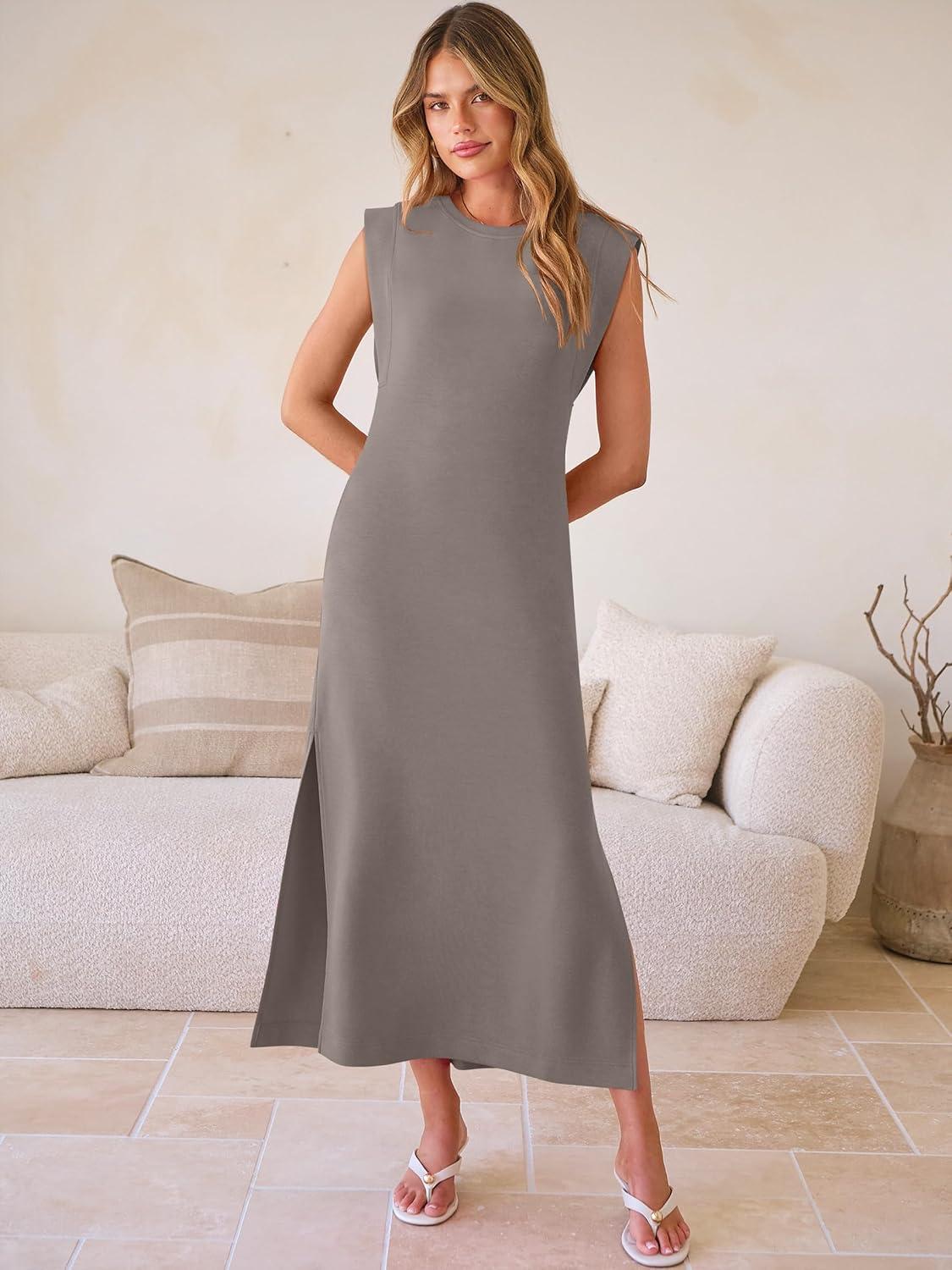 ANRABESS Women Summer Casual Sleeveless Maxi Dress 2026 Crewneck Loose Split Wrinkle-Free Beach Travel Vacation Long Sundress(Deep Grey)