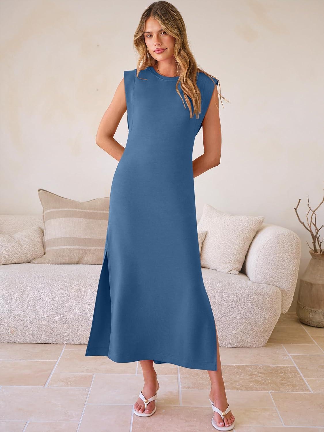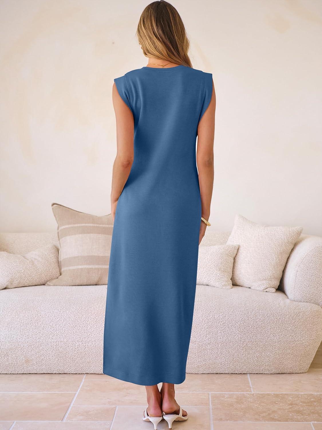 ANRABESS Women Summer Casual Sleeveless Maxi Dress 2026 Crewneck Loose Split Wrinkle-Free Beach Travel Vacation Long Sundress(Deep Blue)