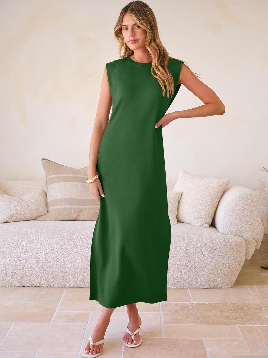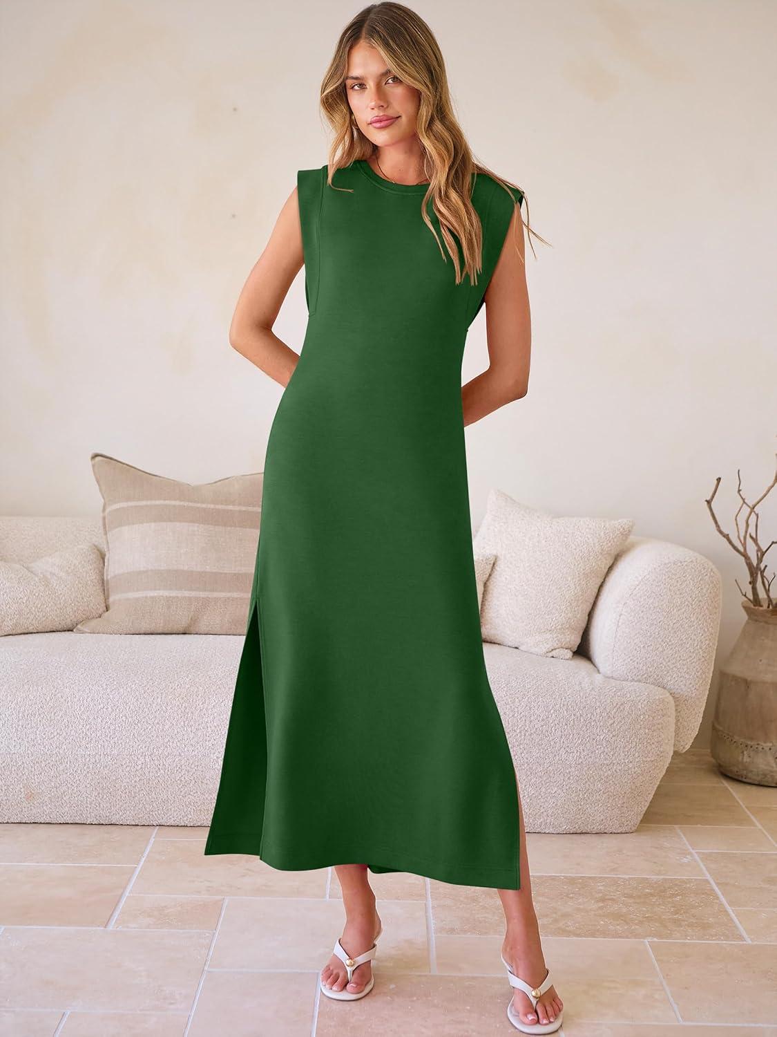 ANRABESS Women Summer Casual Sleeveless Maxi Dress 2026 Crewneck Loose Split Wrinkle-Free Beach Travel Vacation Long Sundress(Forest Green)