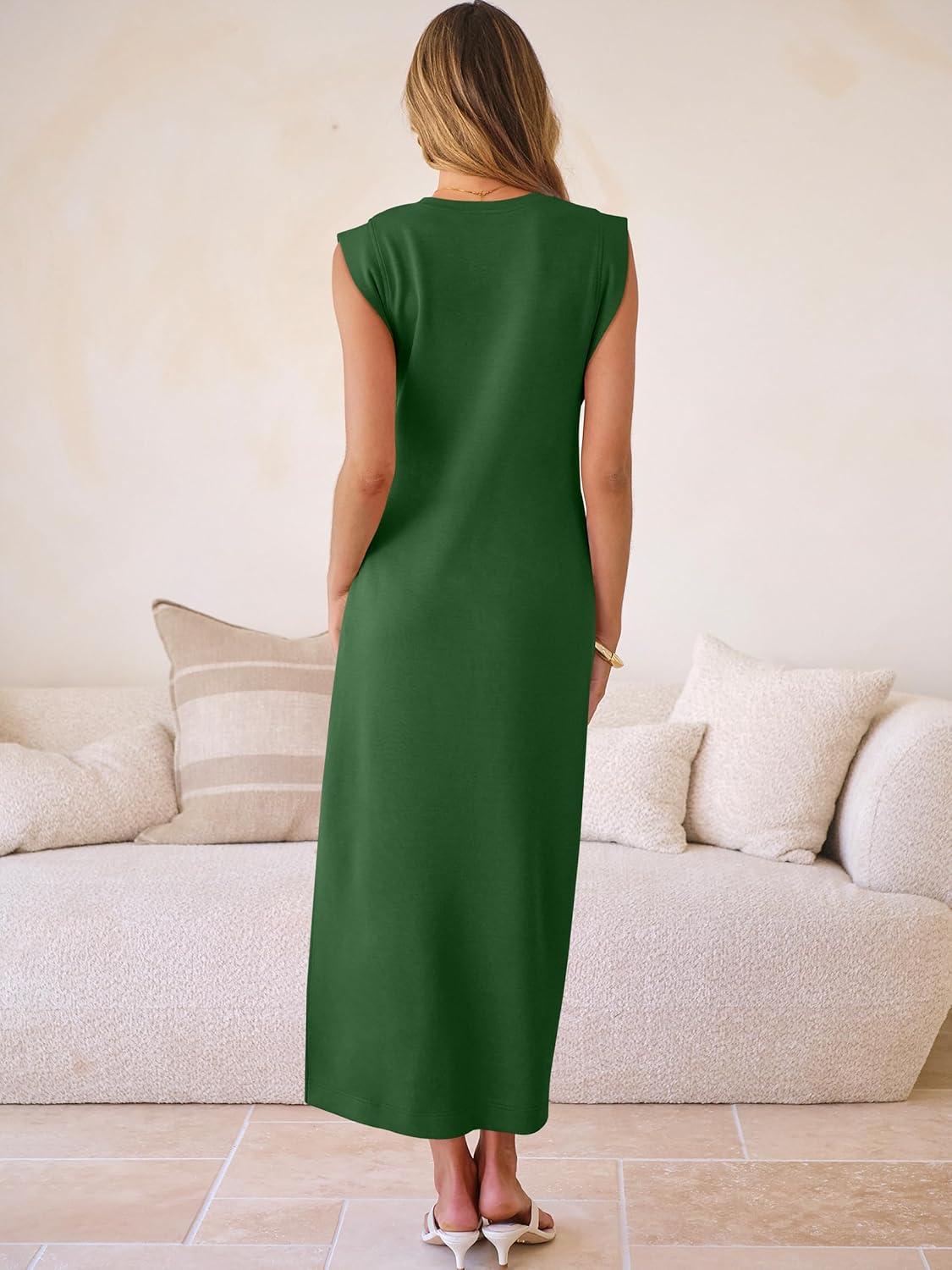 ANRABESS Women Summer Casual Sleeveless Maxi Dress 2026 Crewneck Loose Split Wrinkle-Free Beach Travel Vacation Long Sundress(Deep Green)