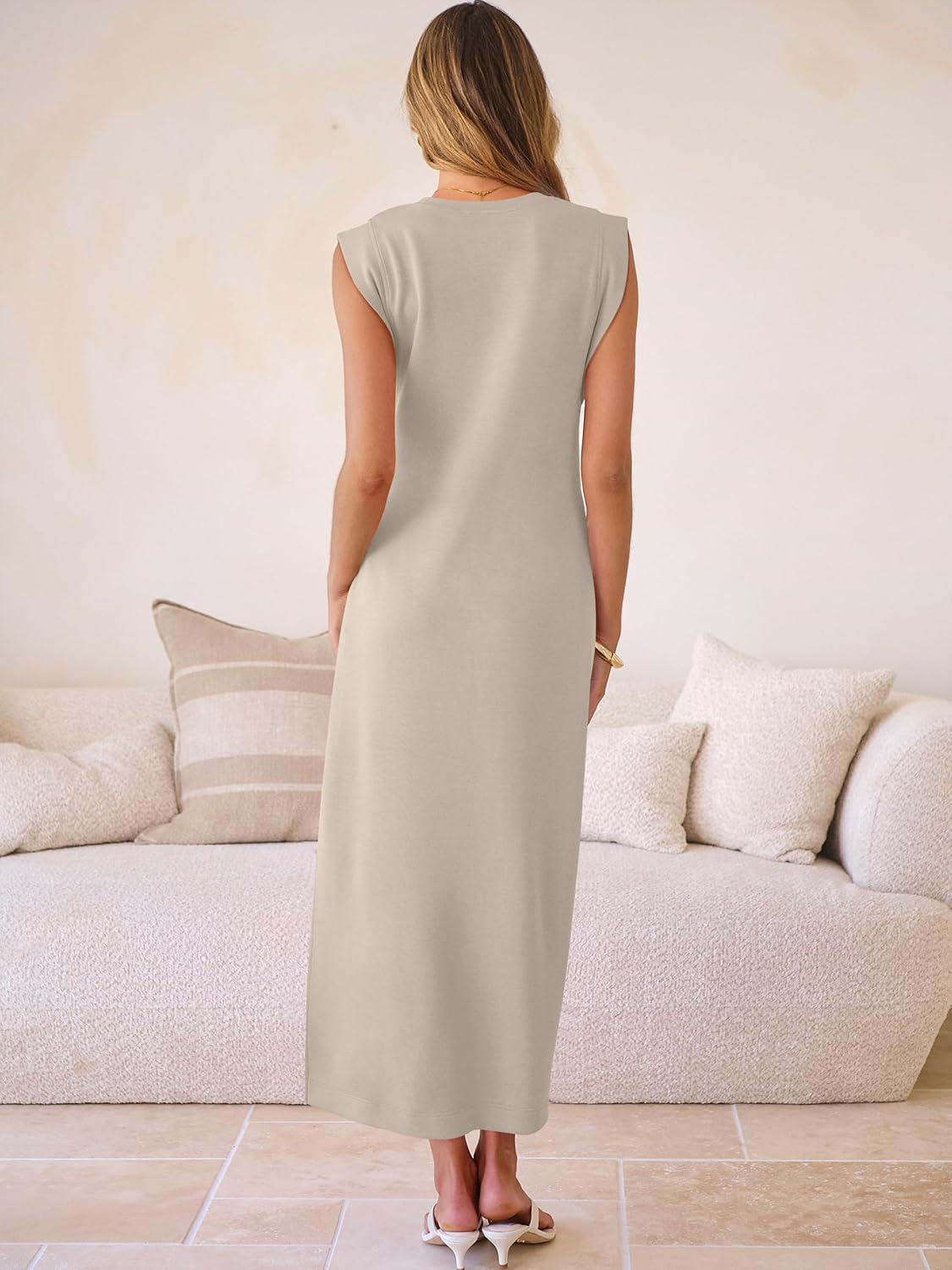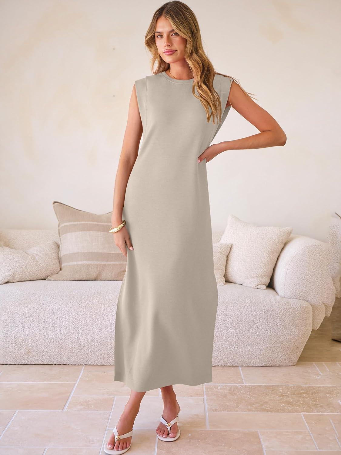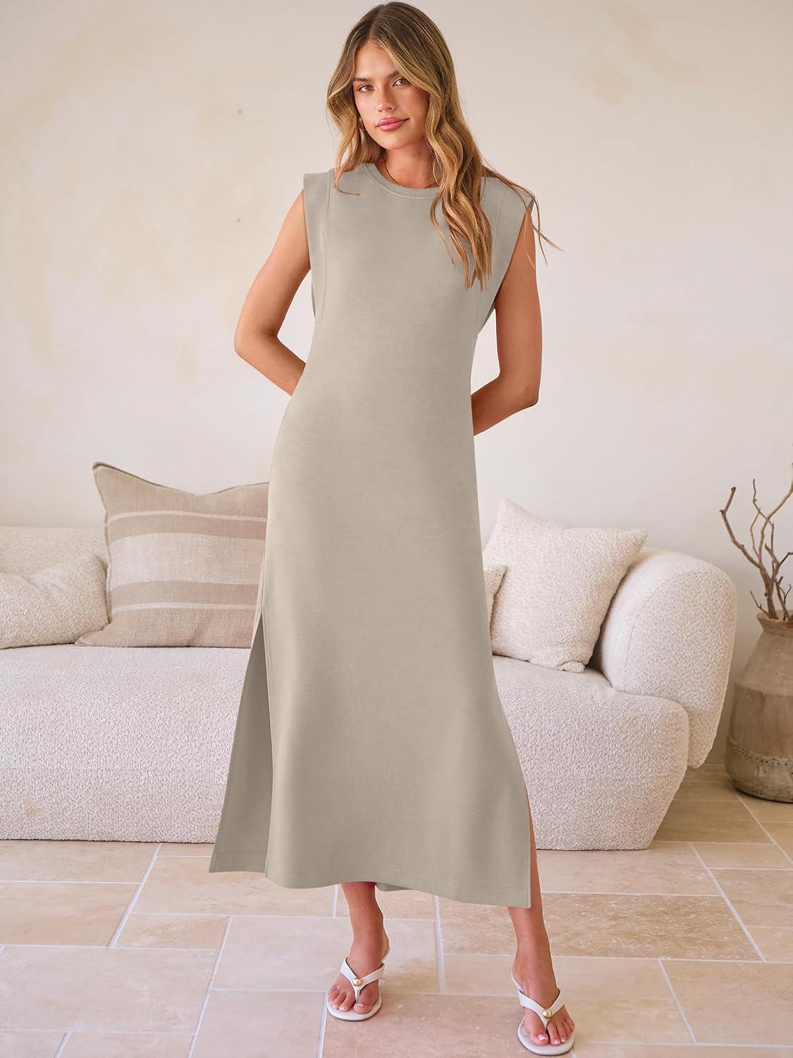 ANRABESS Women Summer Casual Sleeveless Maxi Dress 2026 Crewneck Loose Split Wrinkle-Free Beach Travel Vacation Long Sundress(Light Khaki)
