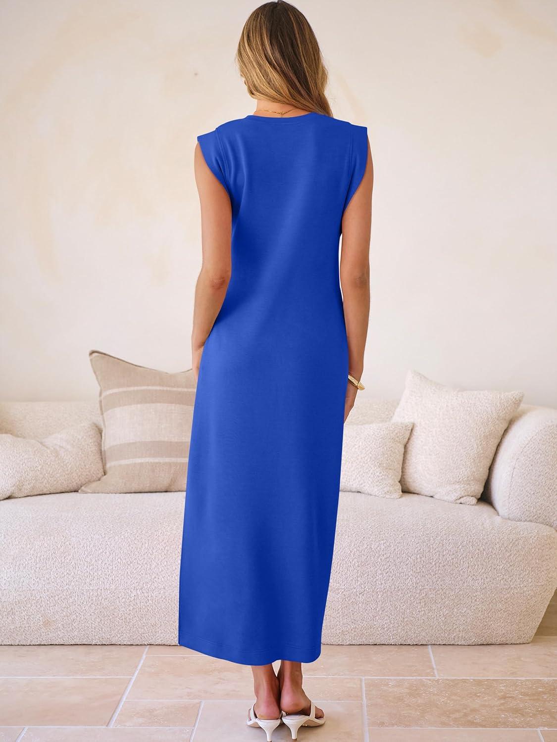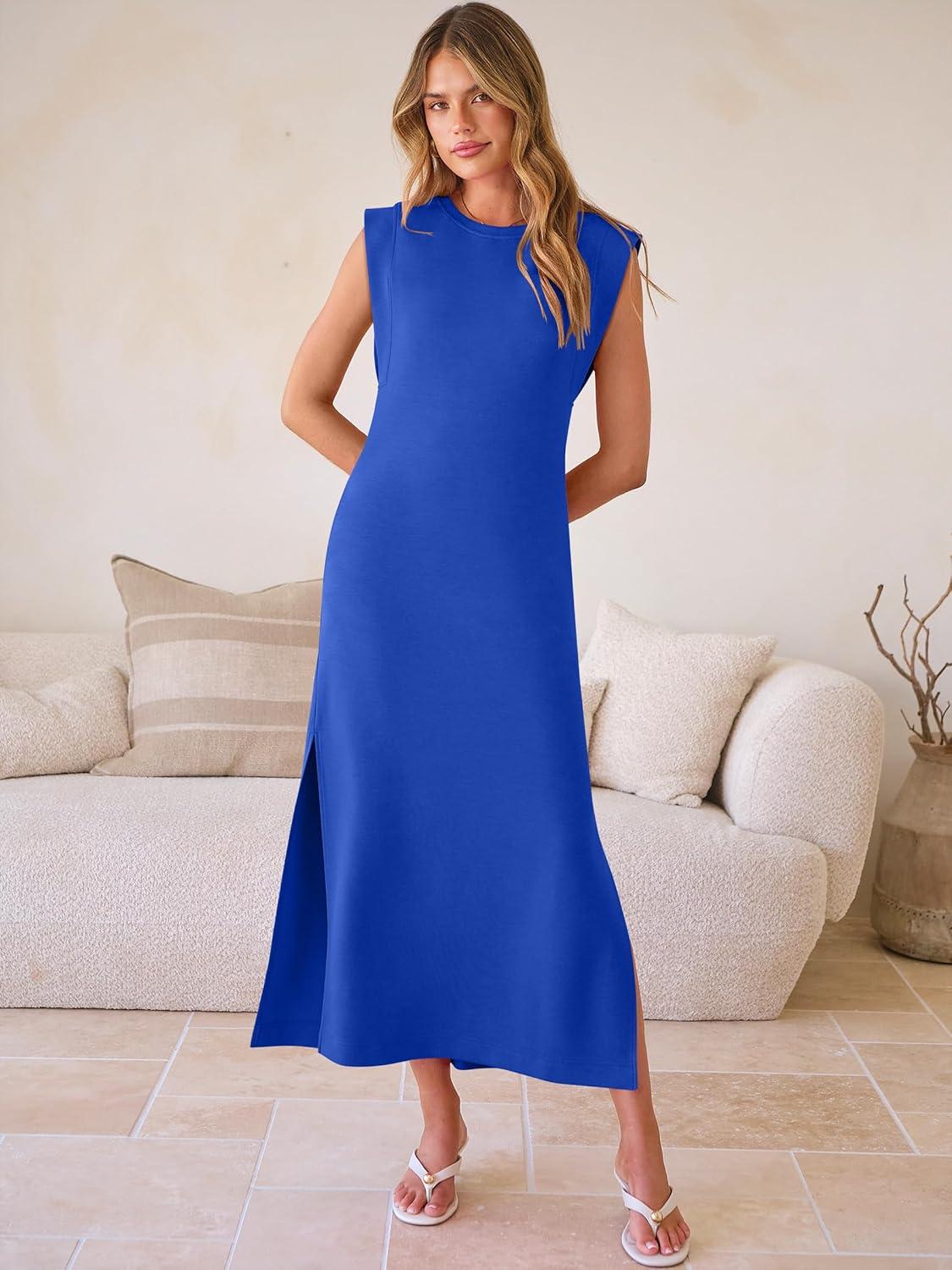 ANRABESS Women Summer Casual Sleeveless Maxi Dress 2026 Crewneck Loose Split Wrinkle-Free Beach Travel Vacation Long Sundress(Royal Blue)
