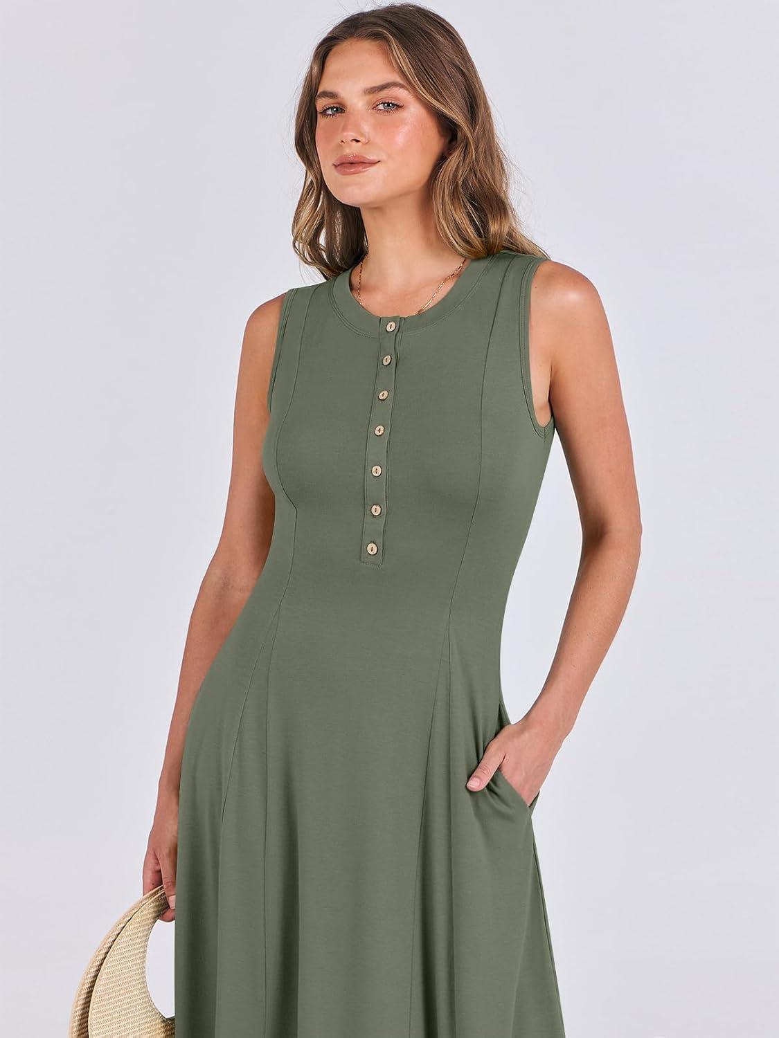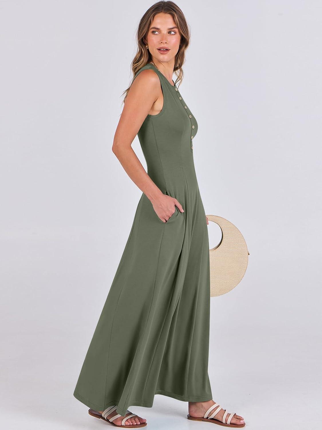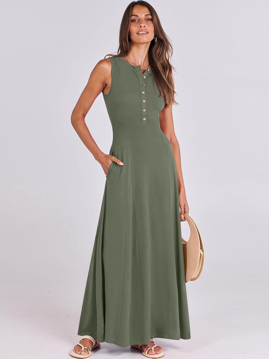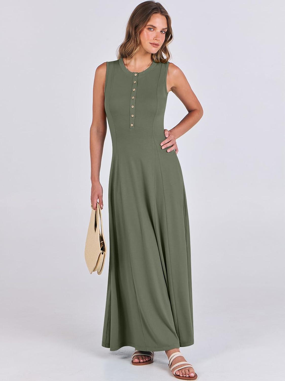 ANRABESS Women Summer Casual Sleeveless Maxi Sundress Button Fit & Flare A-Line Flowy Long Dresses 2026 Beach Outfits(Army Green)