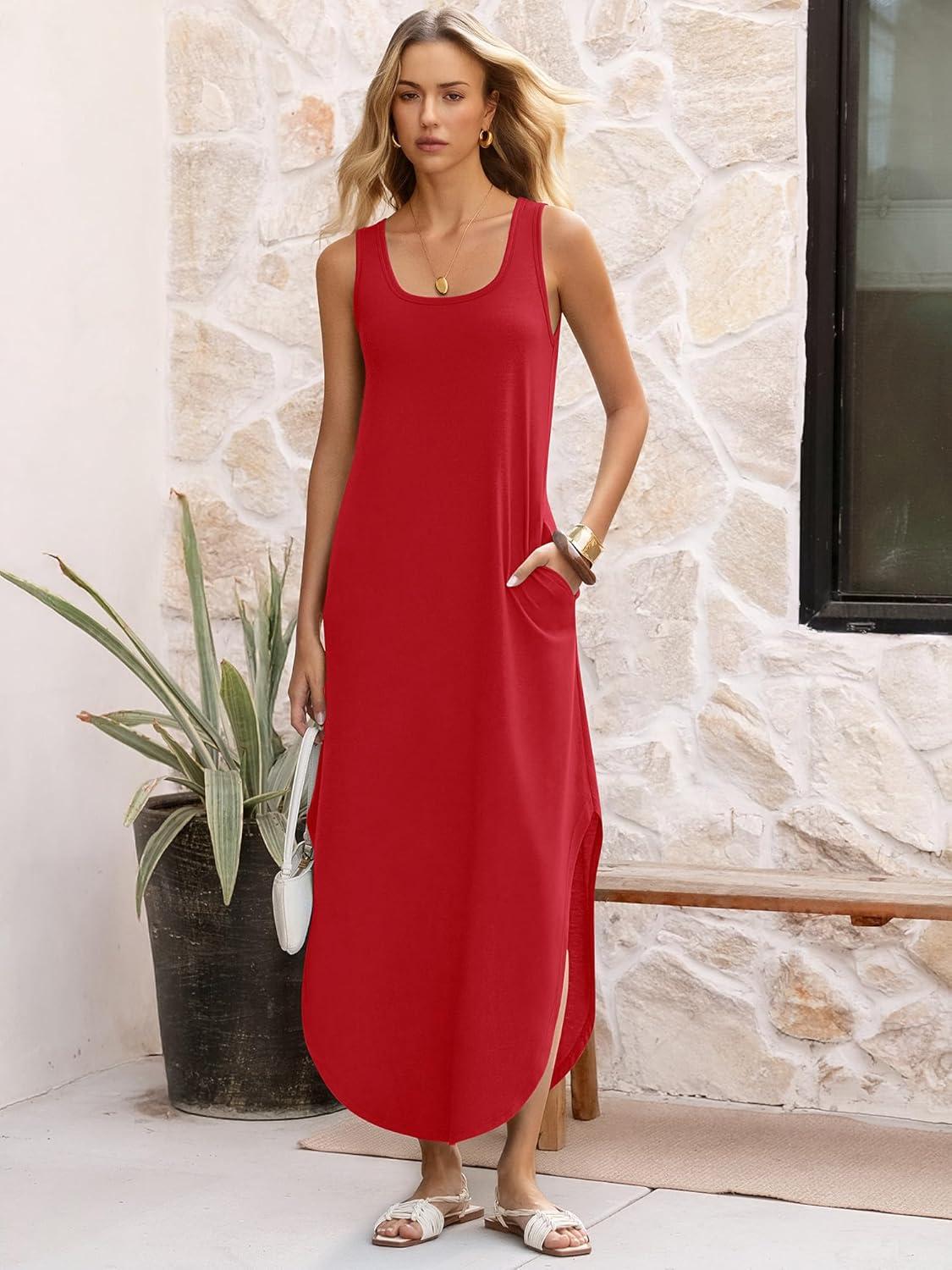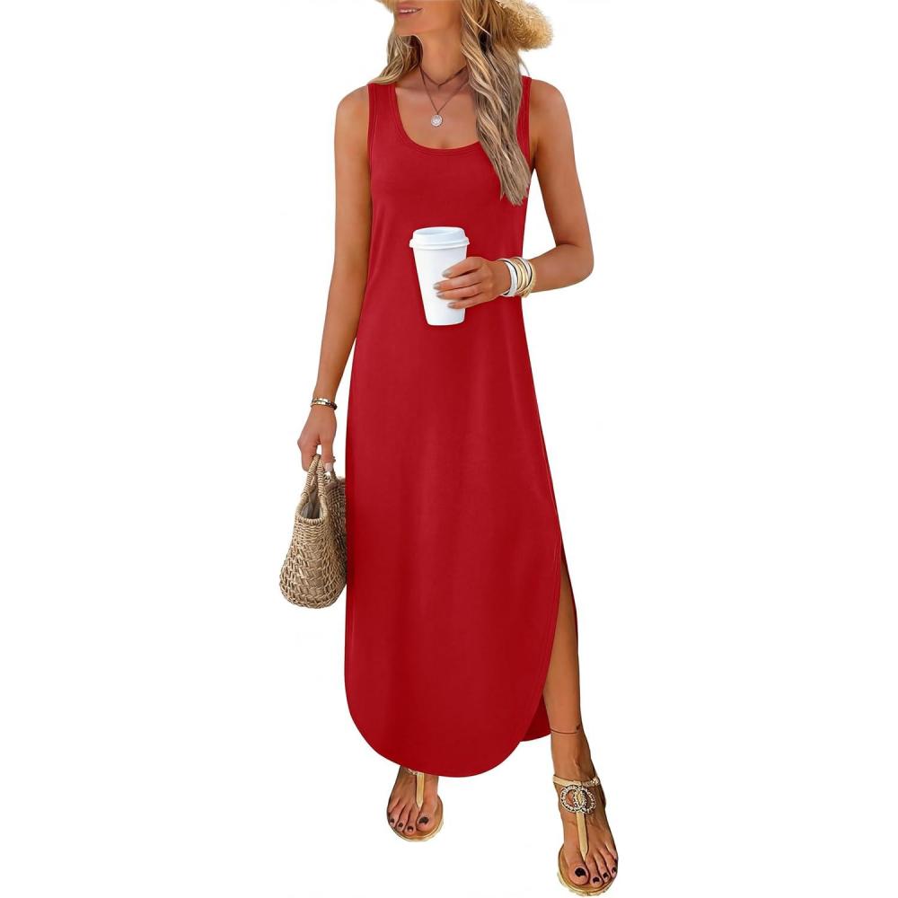 ANRABESS Women Summer Casual Sleeveless Square Neck Beach Maxi Dress 2026 Trendy Loose Fit Split Tank Shirt Vacation Sundress(Red)