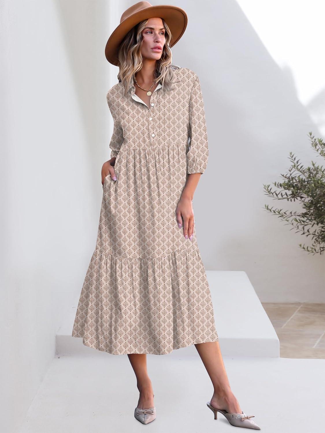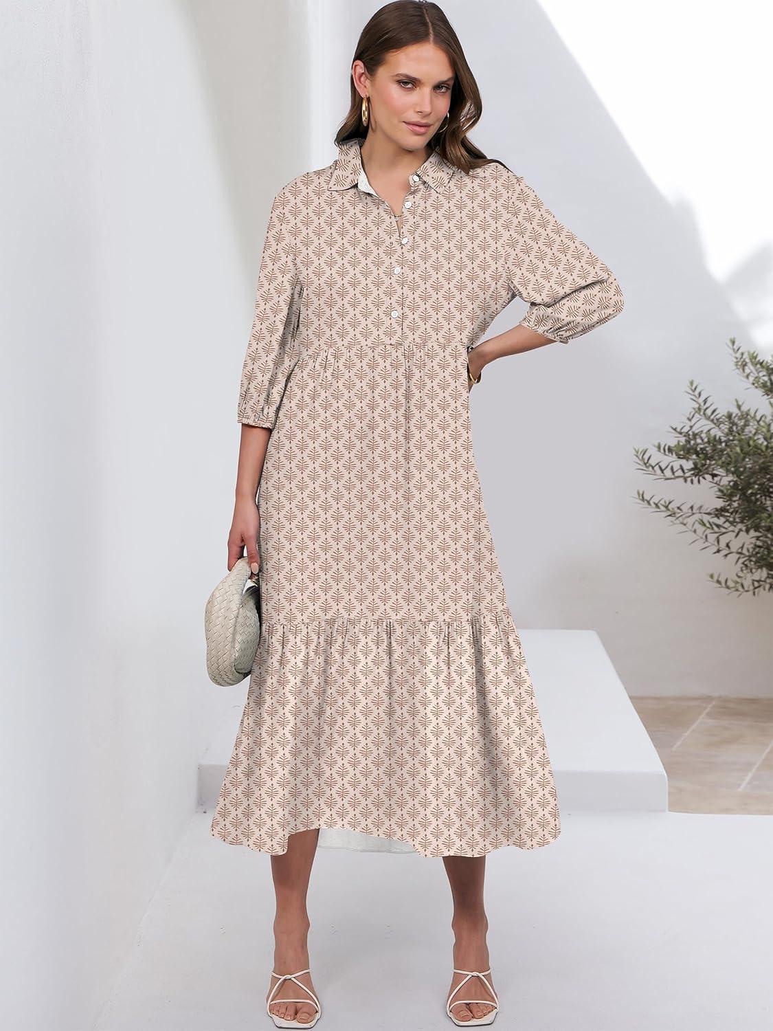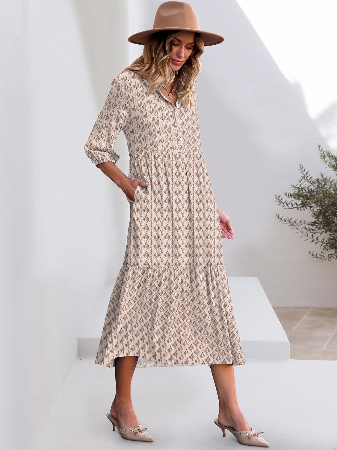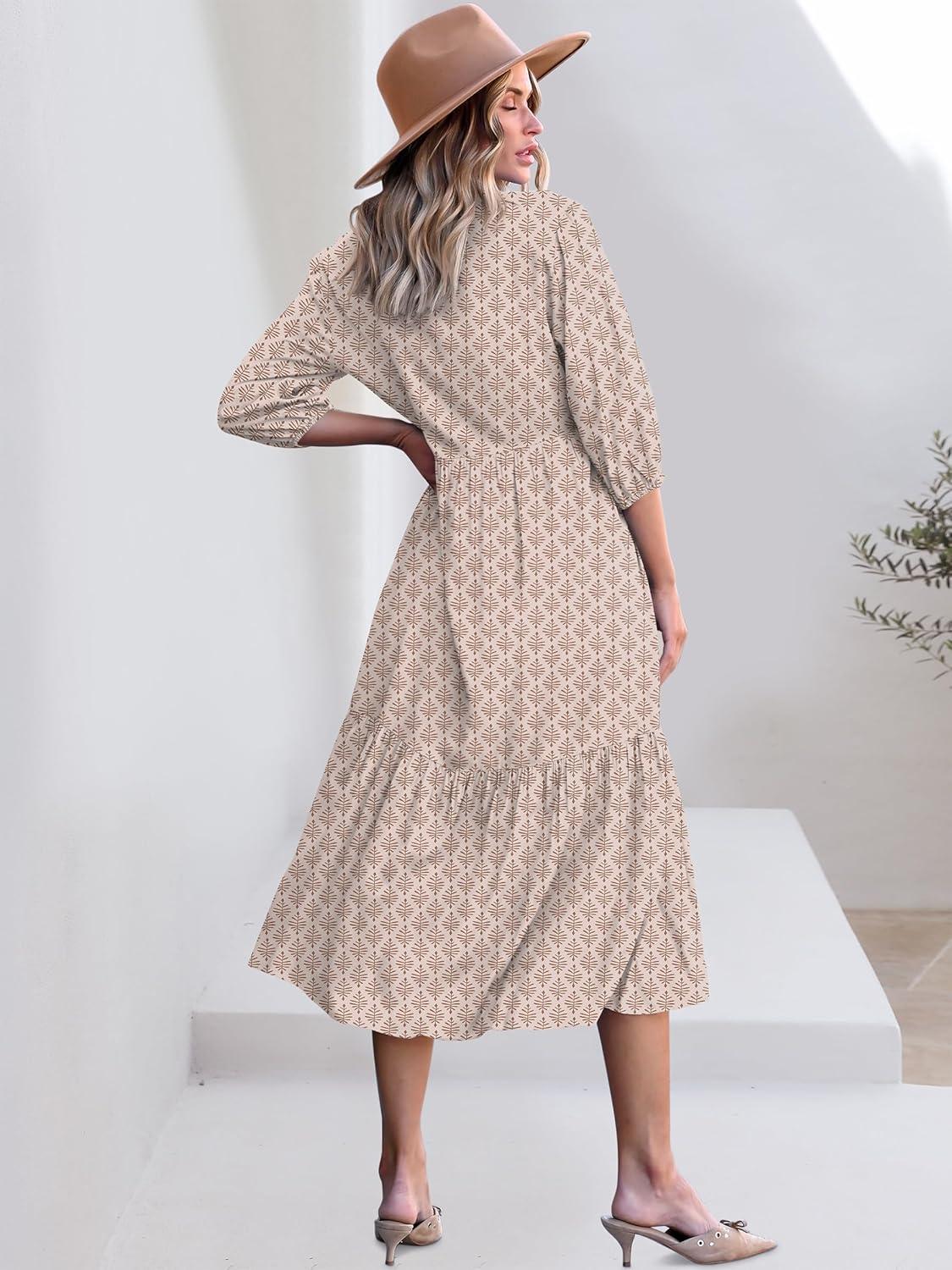 ANRABESS Women Summer Dress 2025 3/4 Puff Sleeve Polo V Neck Floral Print Casual Boho Shirt Maxi Dress Beach Vacation Clothes(Brown Khaki)