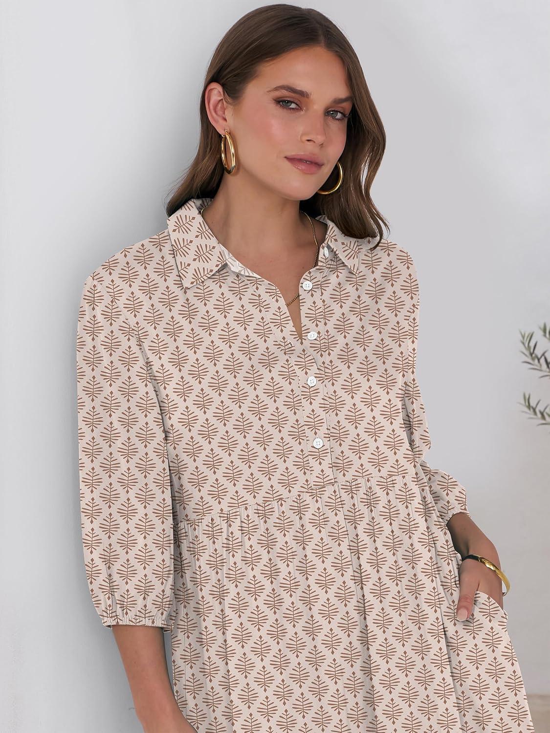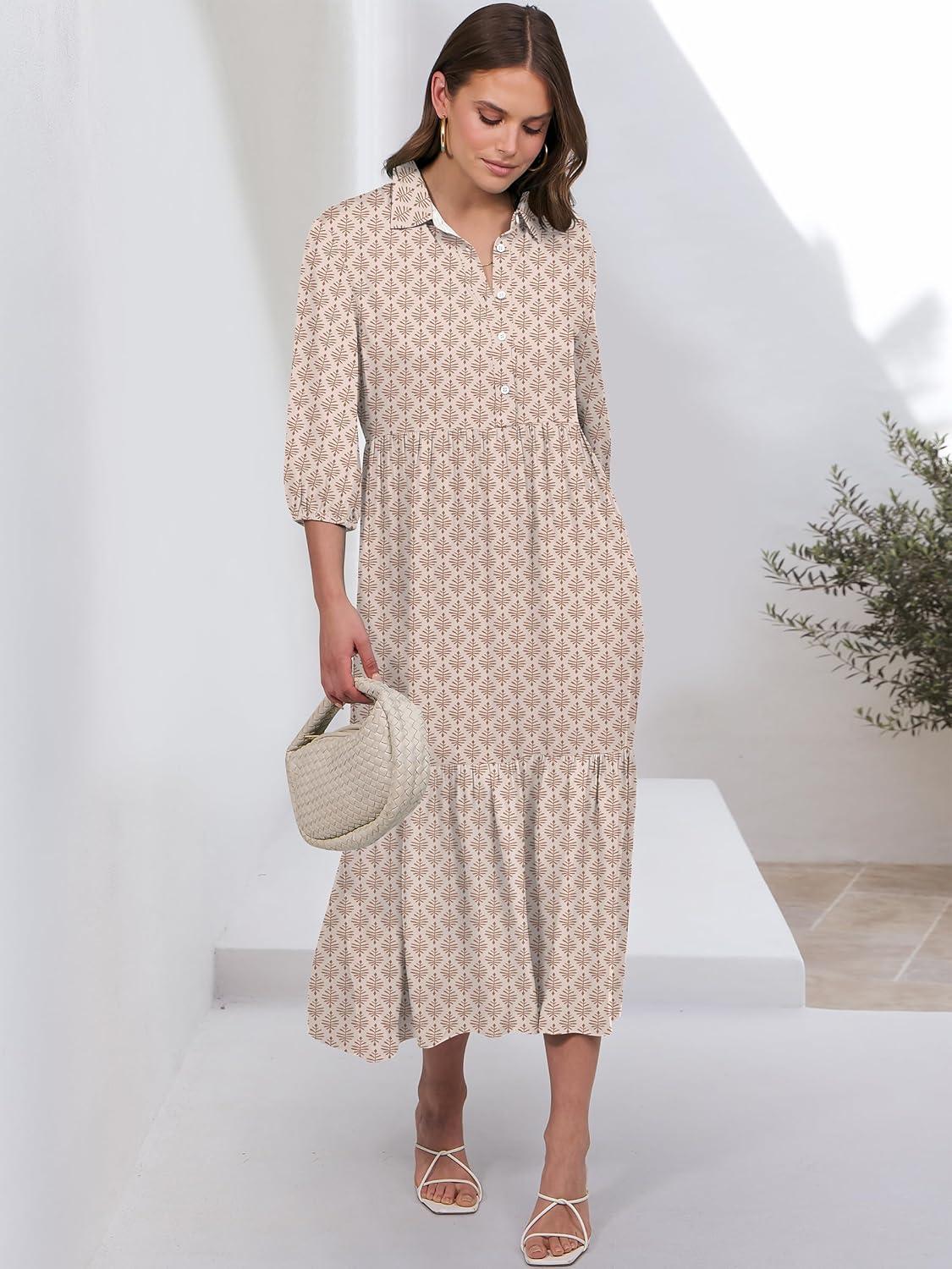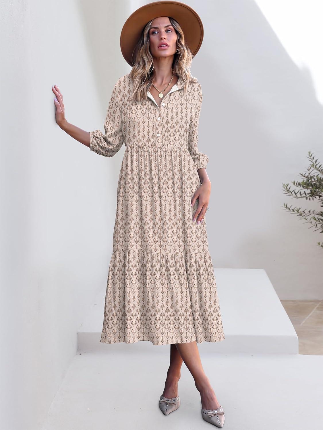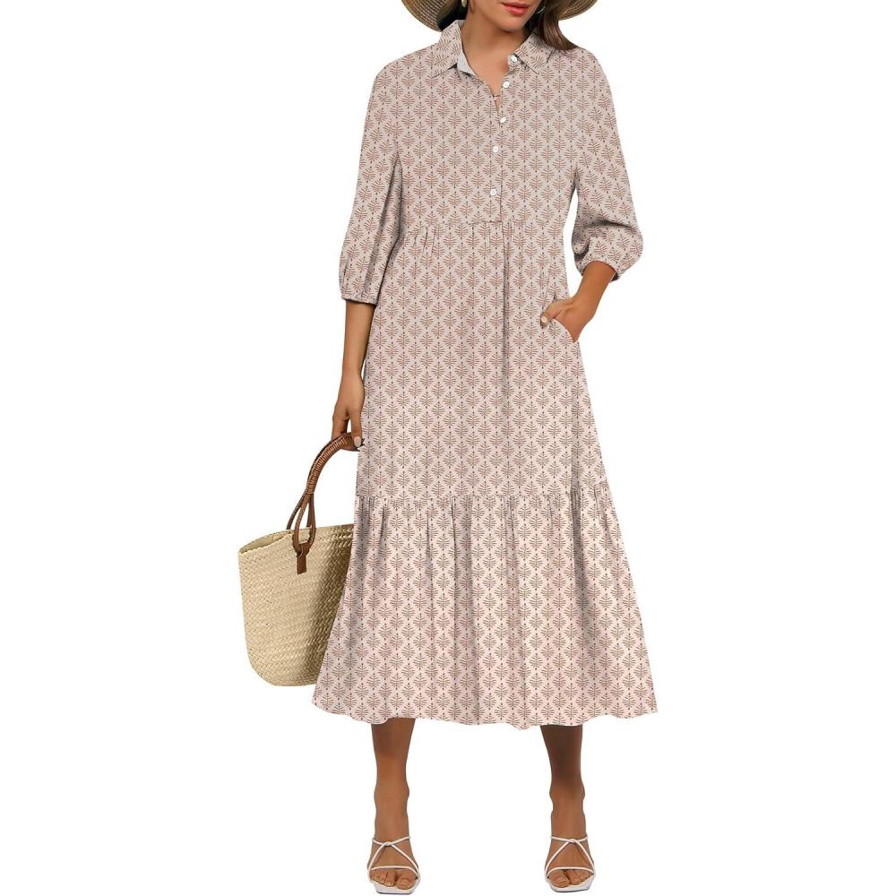 ANRABESS Women Summer Dress 2025 3/4 Puff Sleeve Polo V Neck Floral Print Casual Boho Shirt Maxi Dress Beach Vacation Clothes(Brown Khaki)