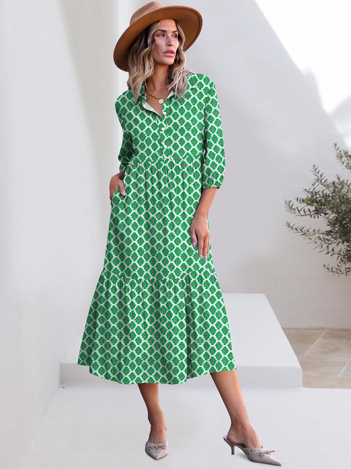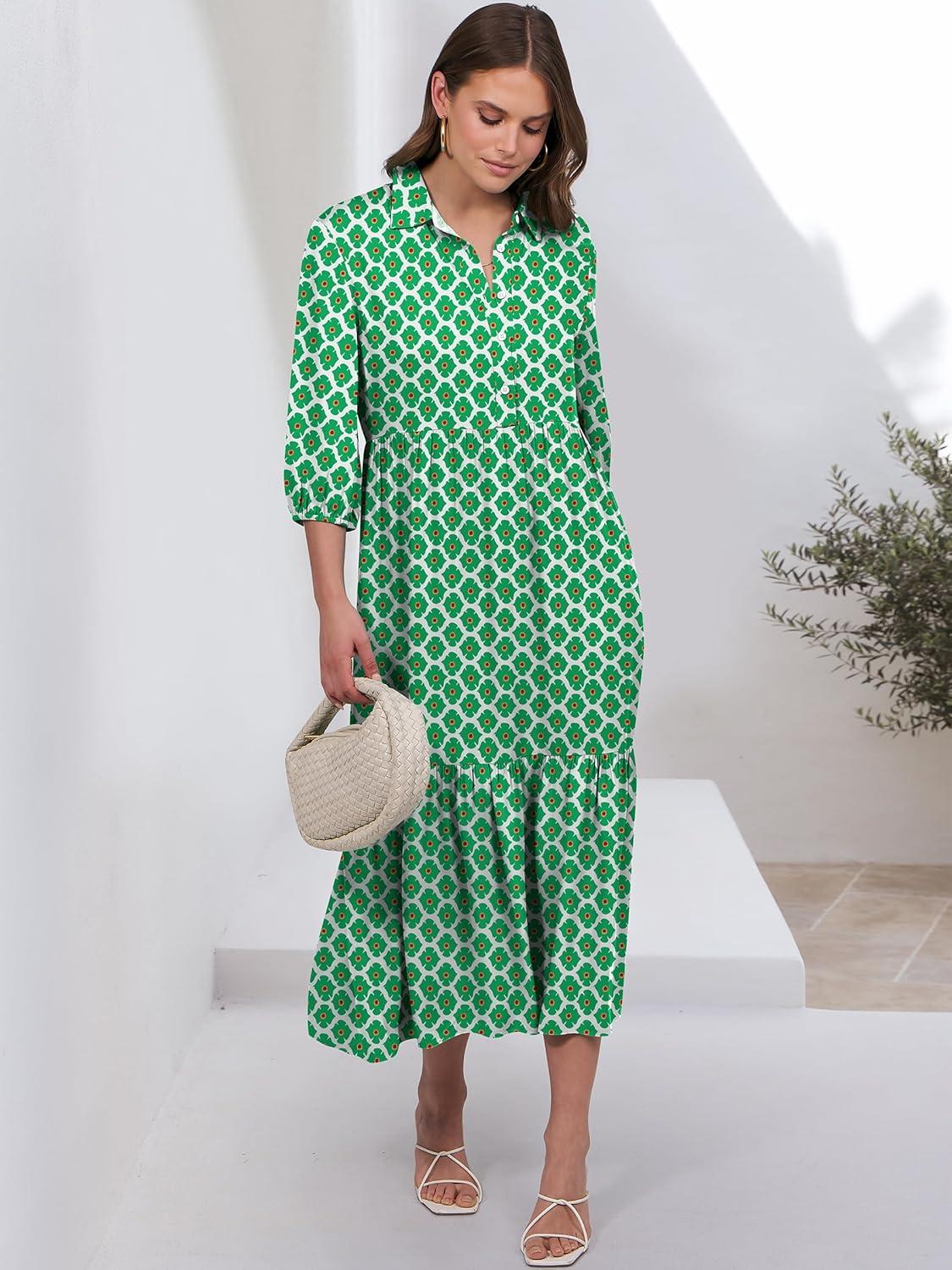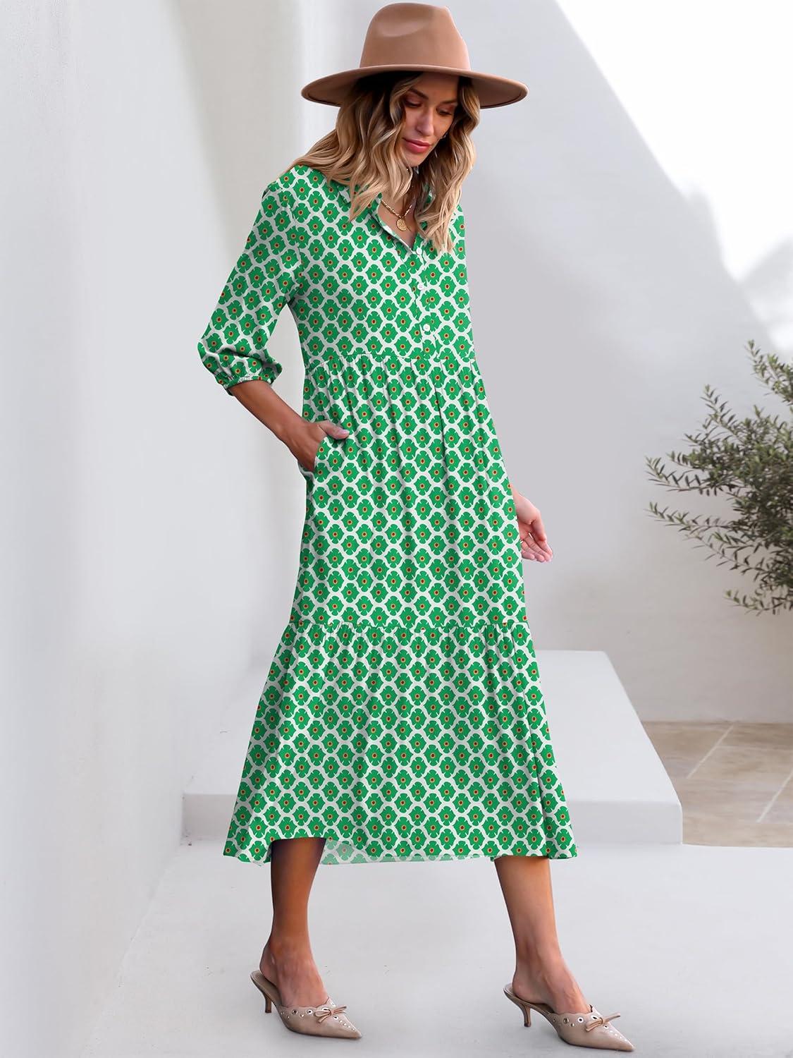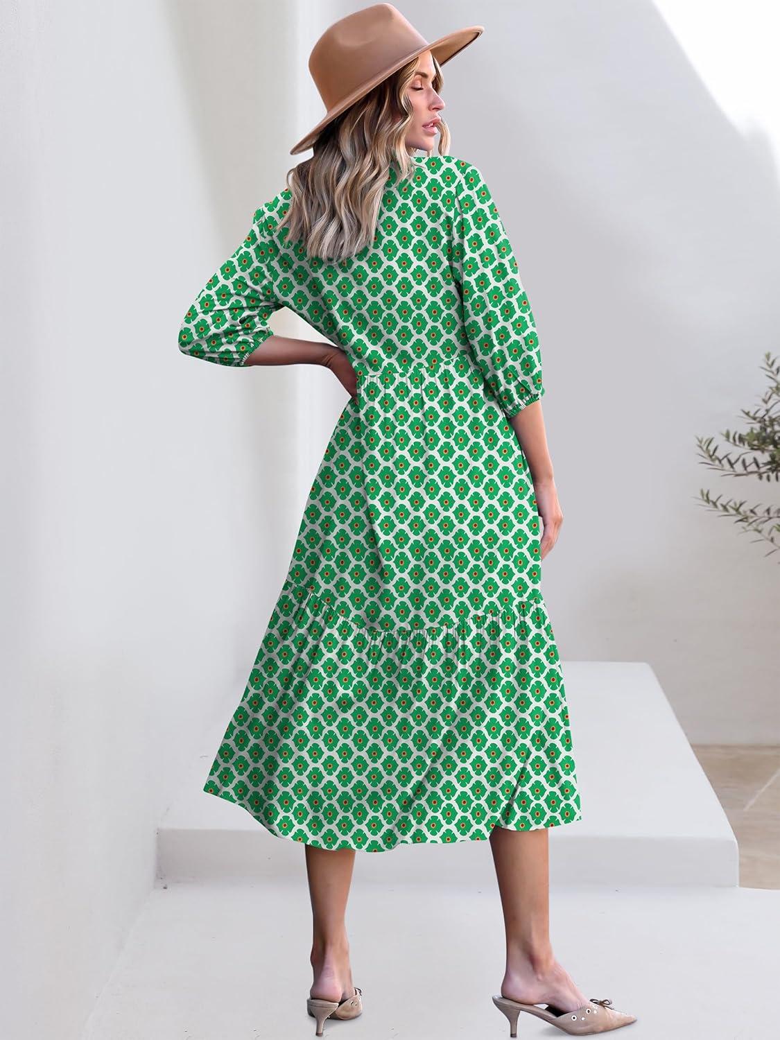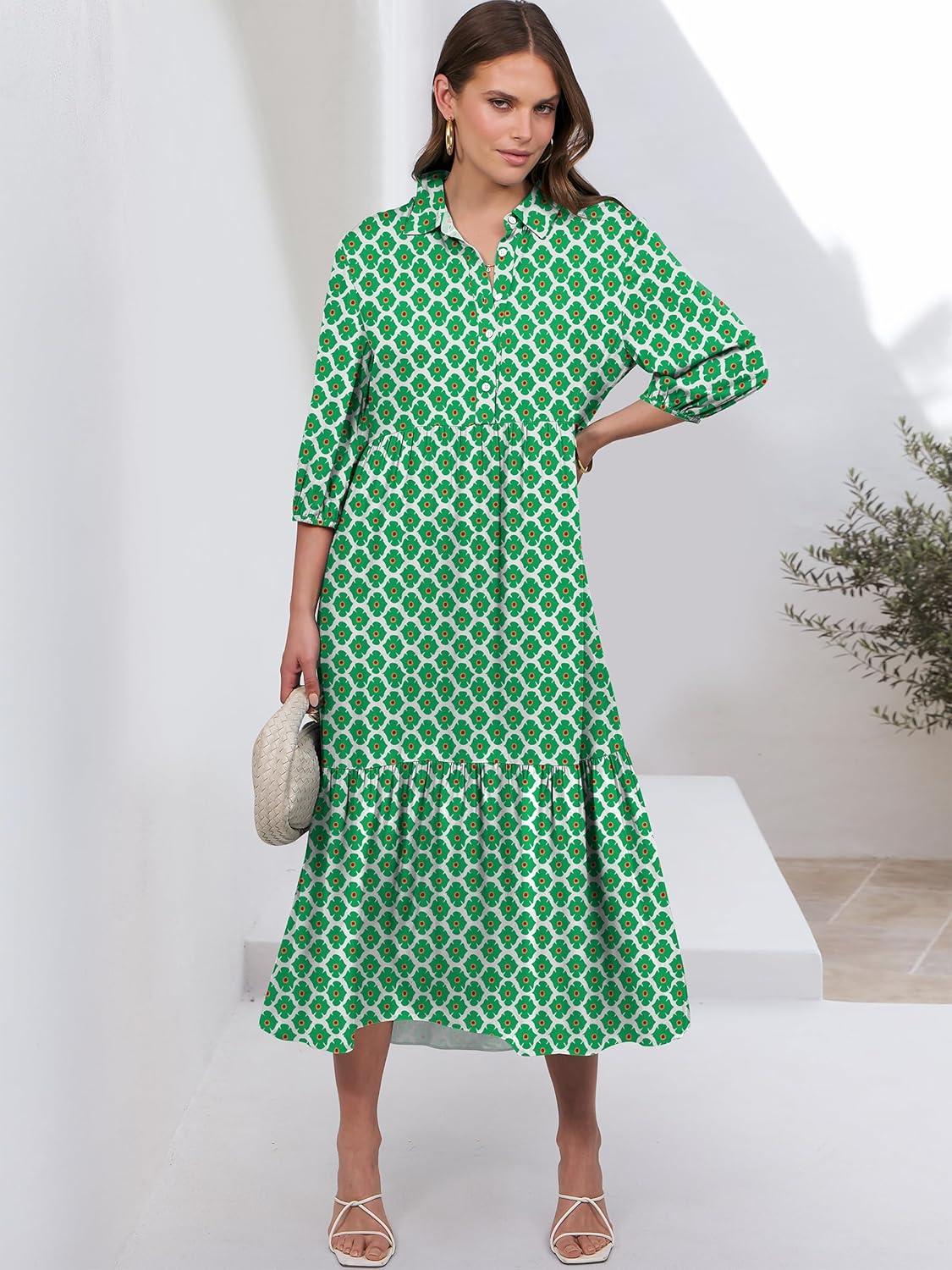 ANRABESS Women Summer Dress 2025 3/4 Puff Sleeve Polo V Neck Floral Print Casual Boho Shirt Maxi Dress Beach Vacation Clothes(Green)