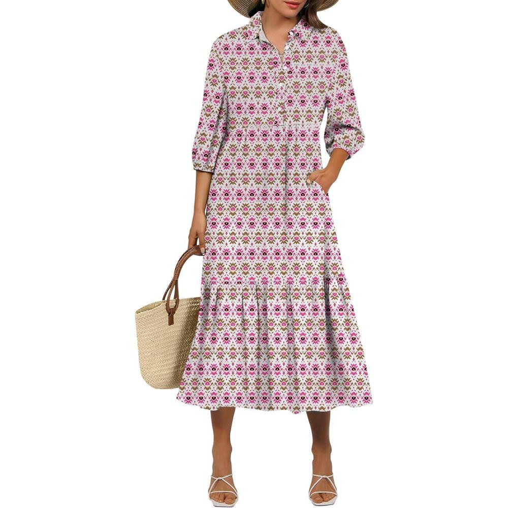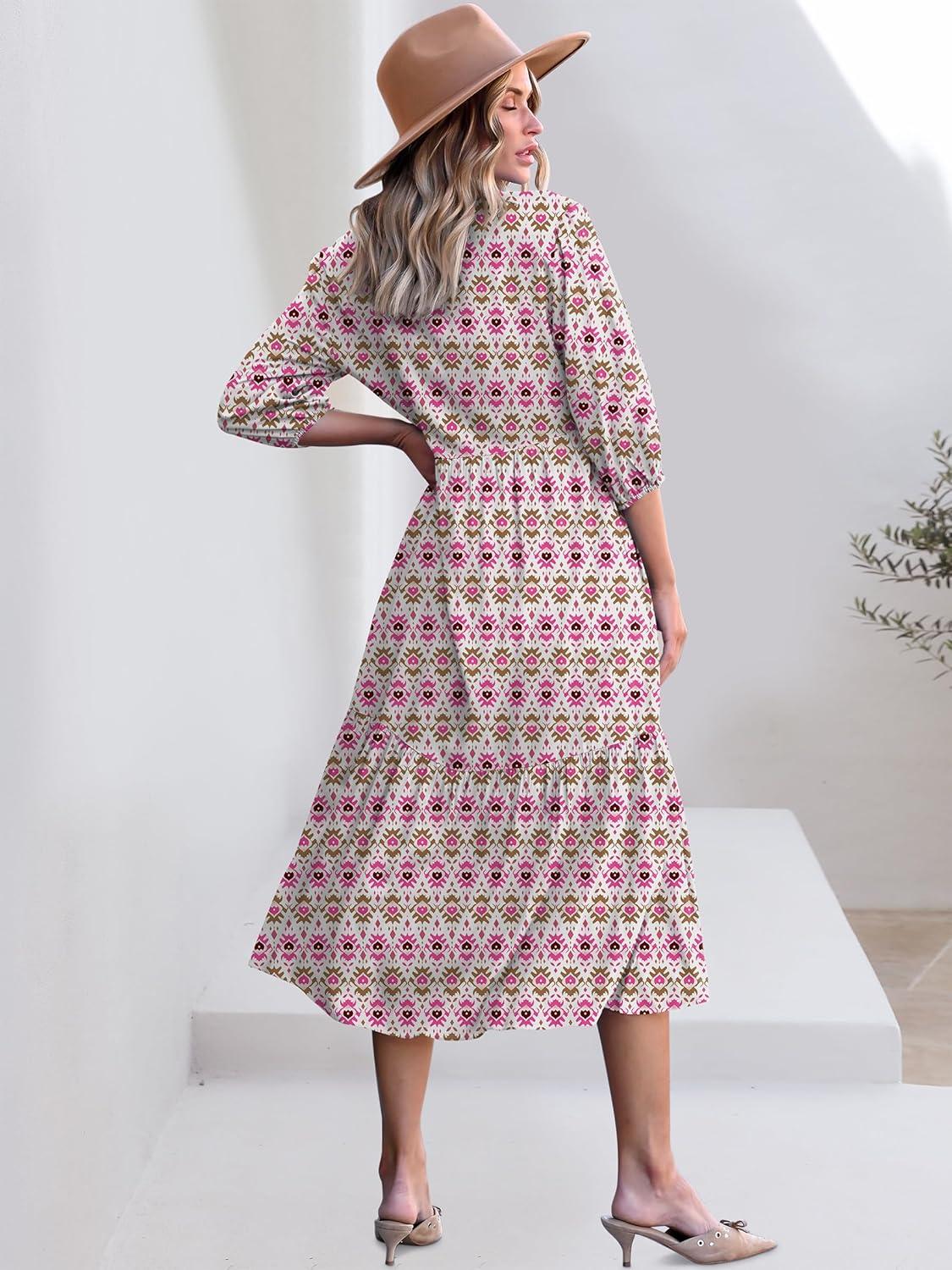 ANRABESS Women Summer Dress 2025 3/4 Puff Sleeve Polo V Neck Floral Print Casual Boho Shirt Maxi Dress Beach Vacation Clothes(Pink White)