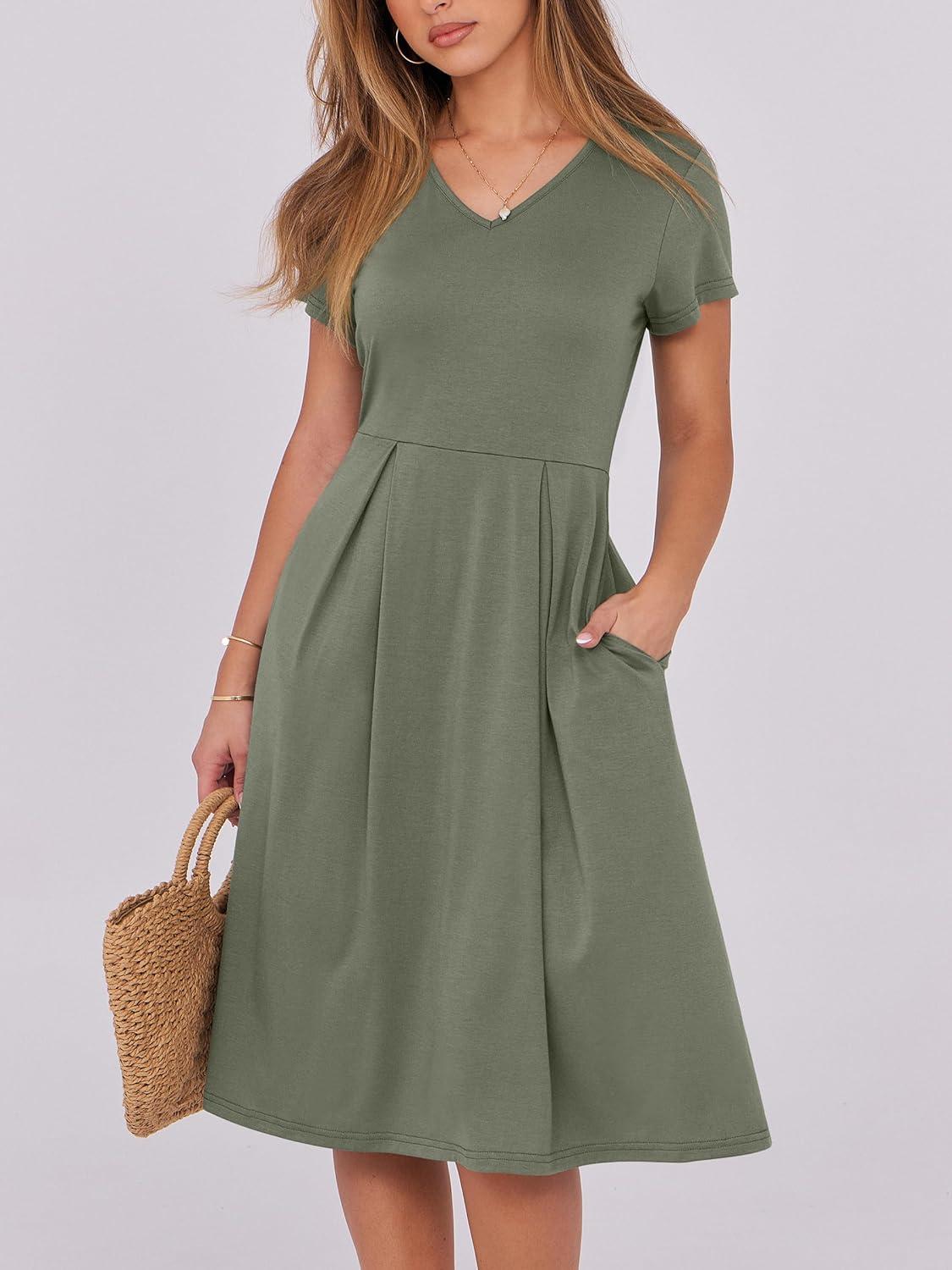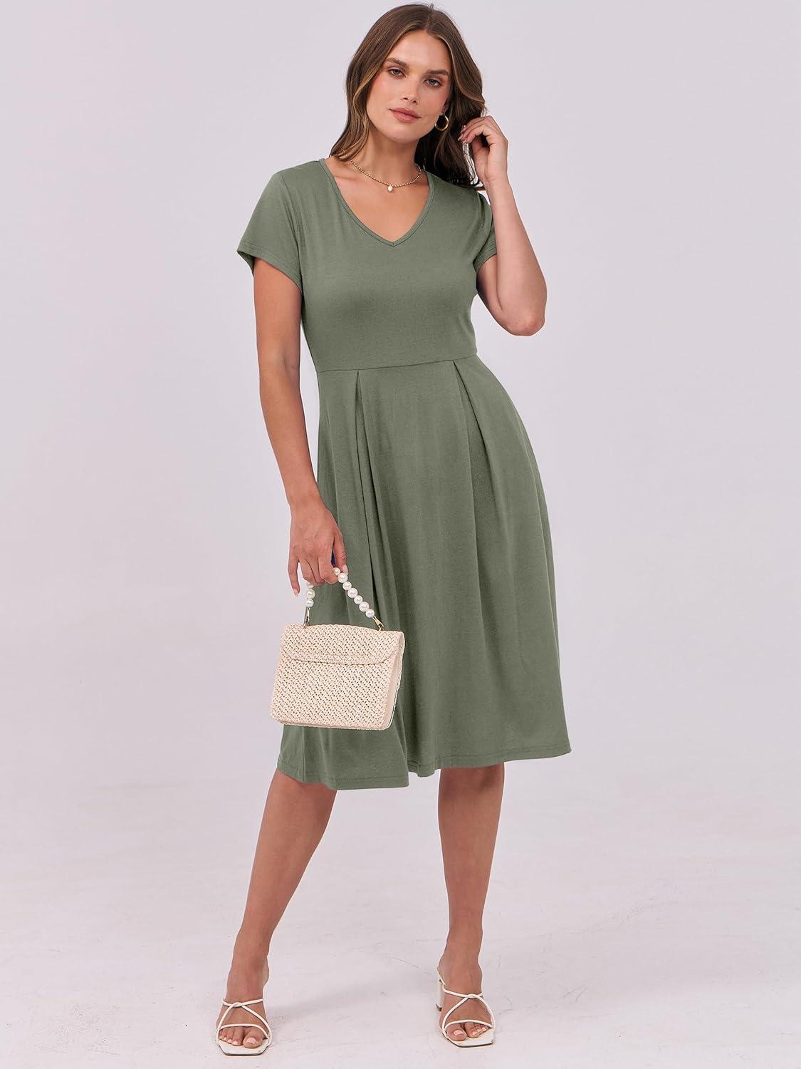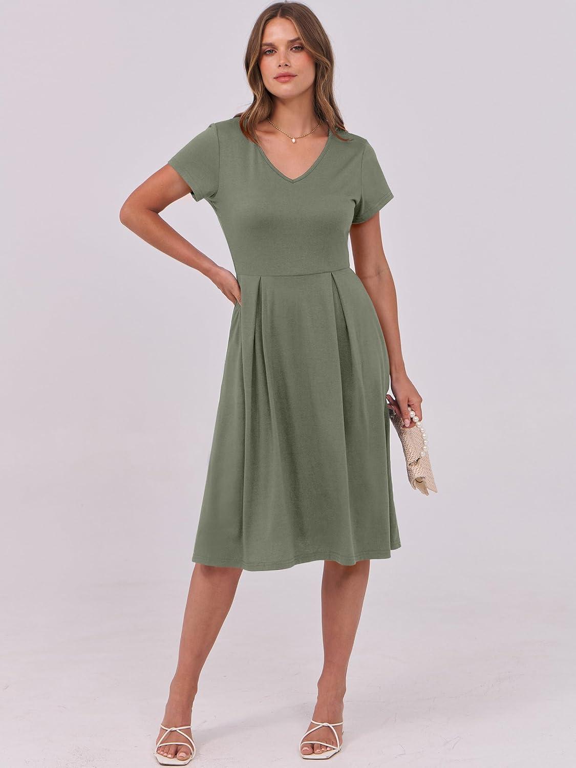 ANRABESS Women Summer Dress Casual Short Sleeve V Neck A-Line Knee Length Pleated Flowy 2026 Fashion Midi Dresses with Pocket(Army Green)