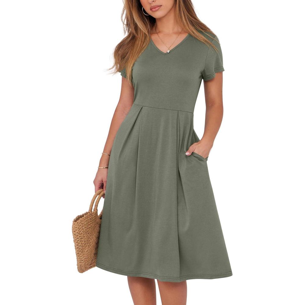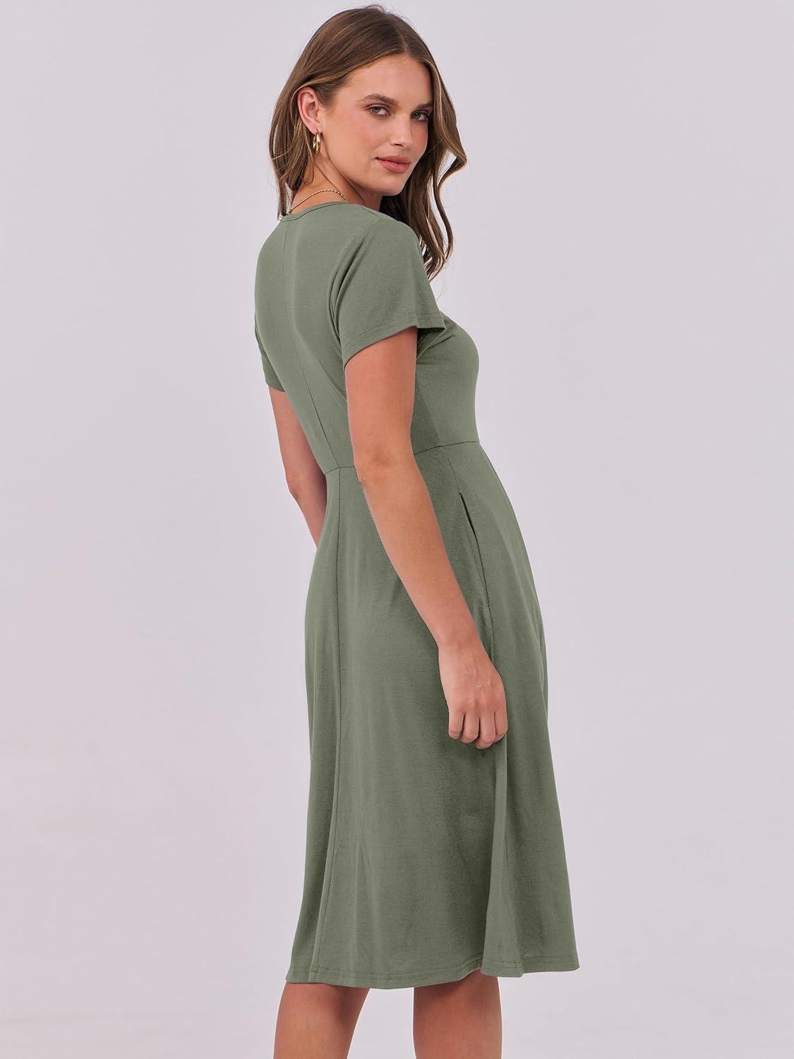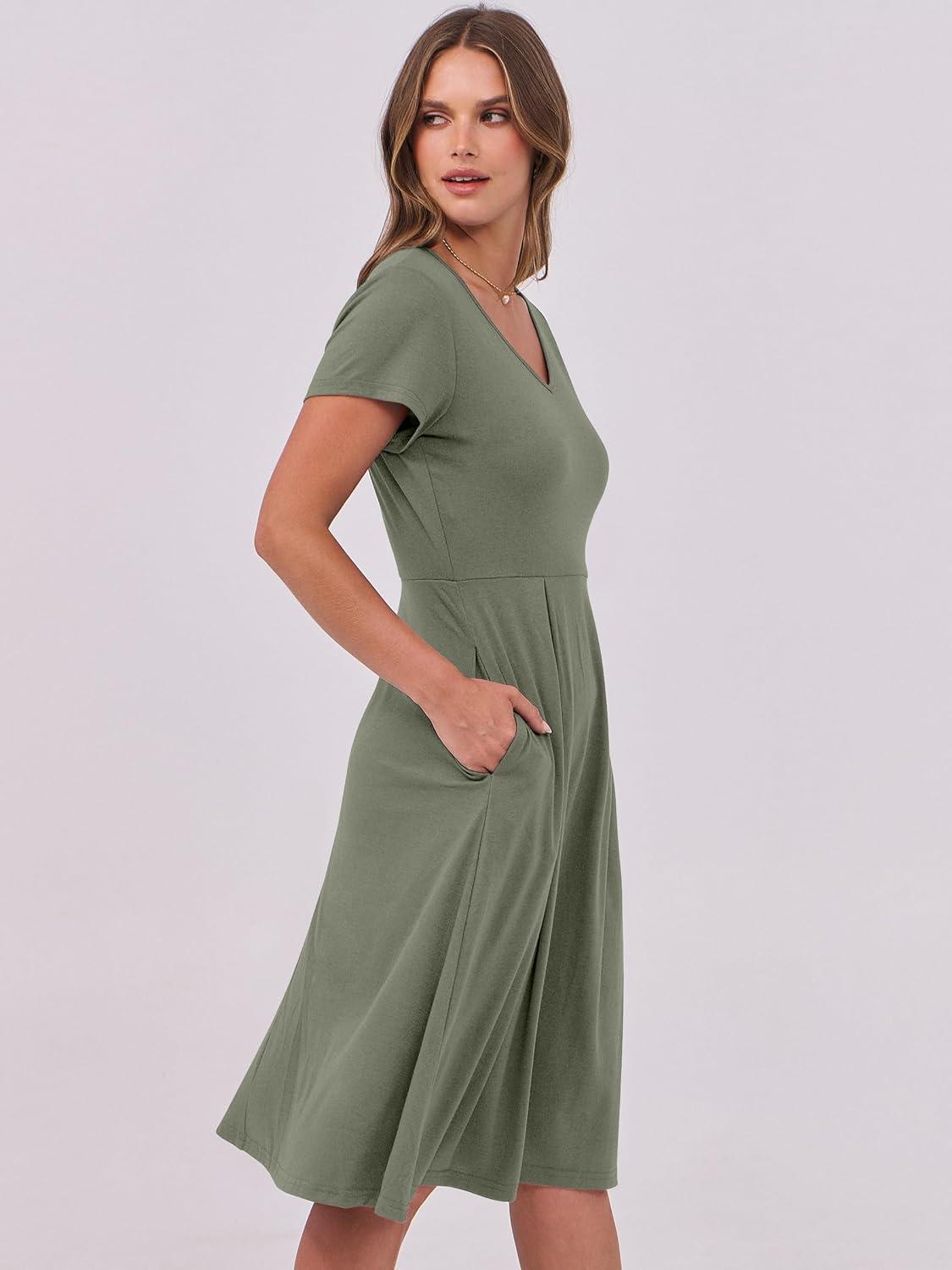 ANRABESS Women Summer Dress Casual Short Sleeve V Neck A-Line Knee Length Pleated Flowy 2026 Fashion Midi Dresses with Pocket(Army Green)