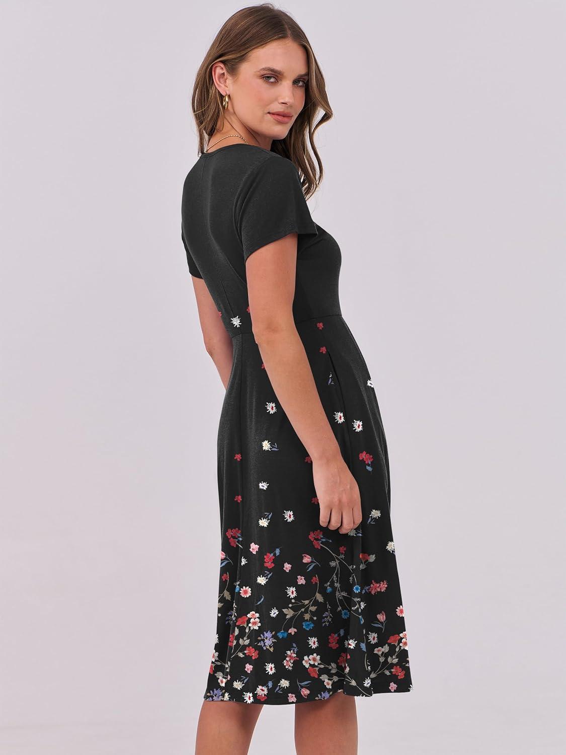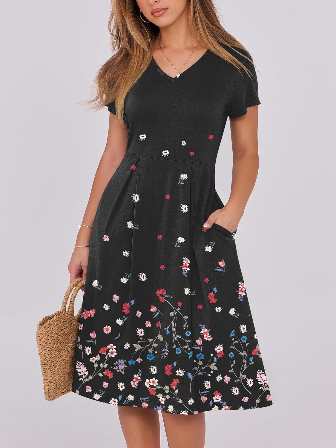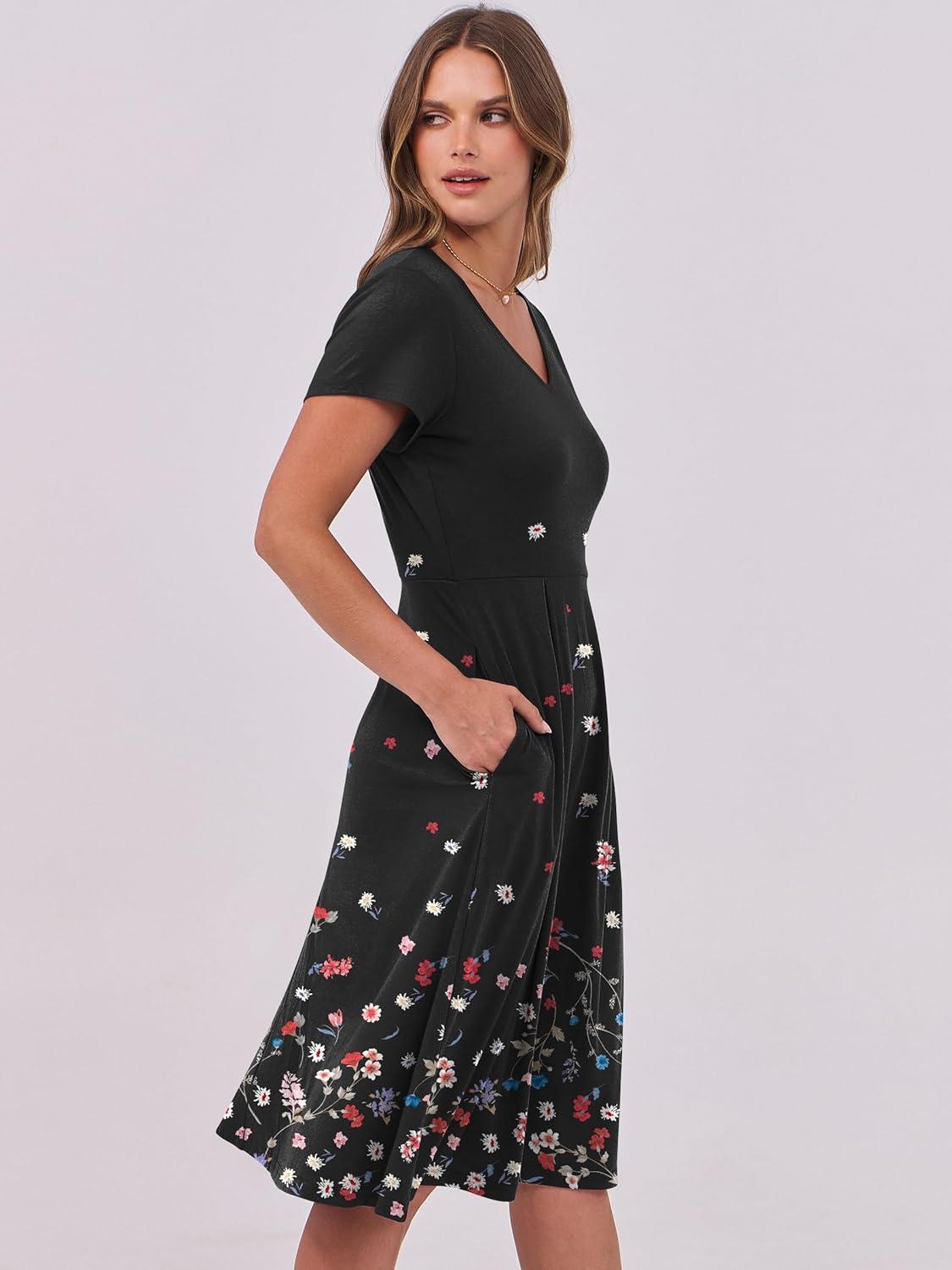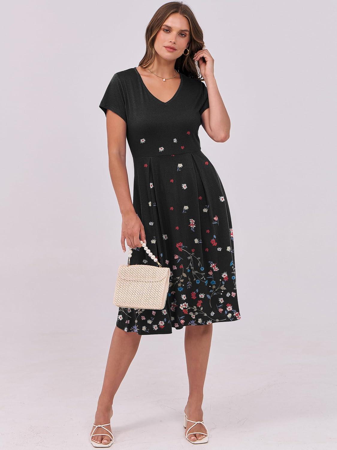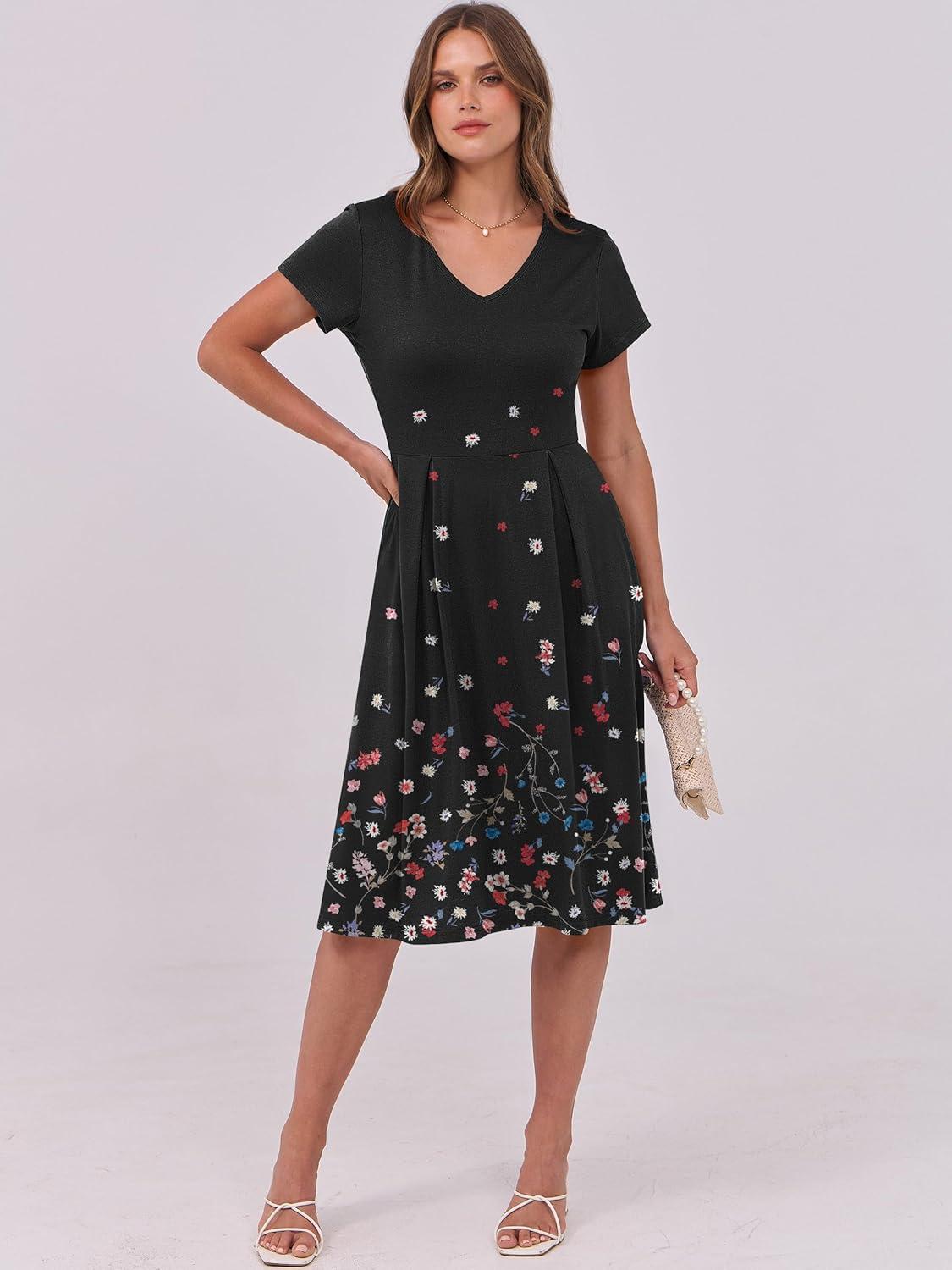 ANRABESS Women Summer Dress Casual Short Sleeve V Neck A-Line Knee Length Pleated Flowy 2026 Fashion Midi Dresses with Pocket(Black Floral)