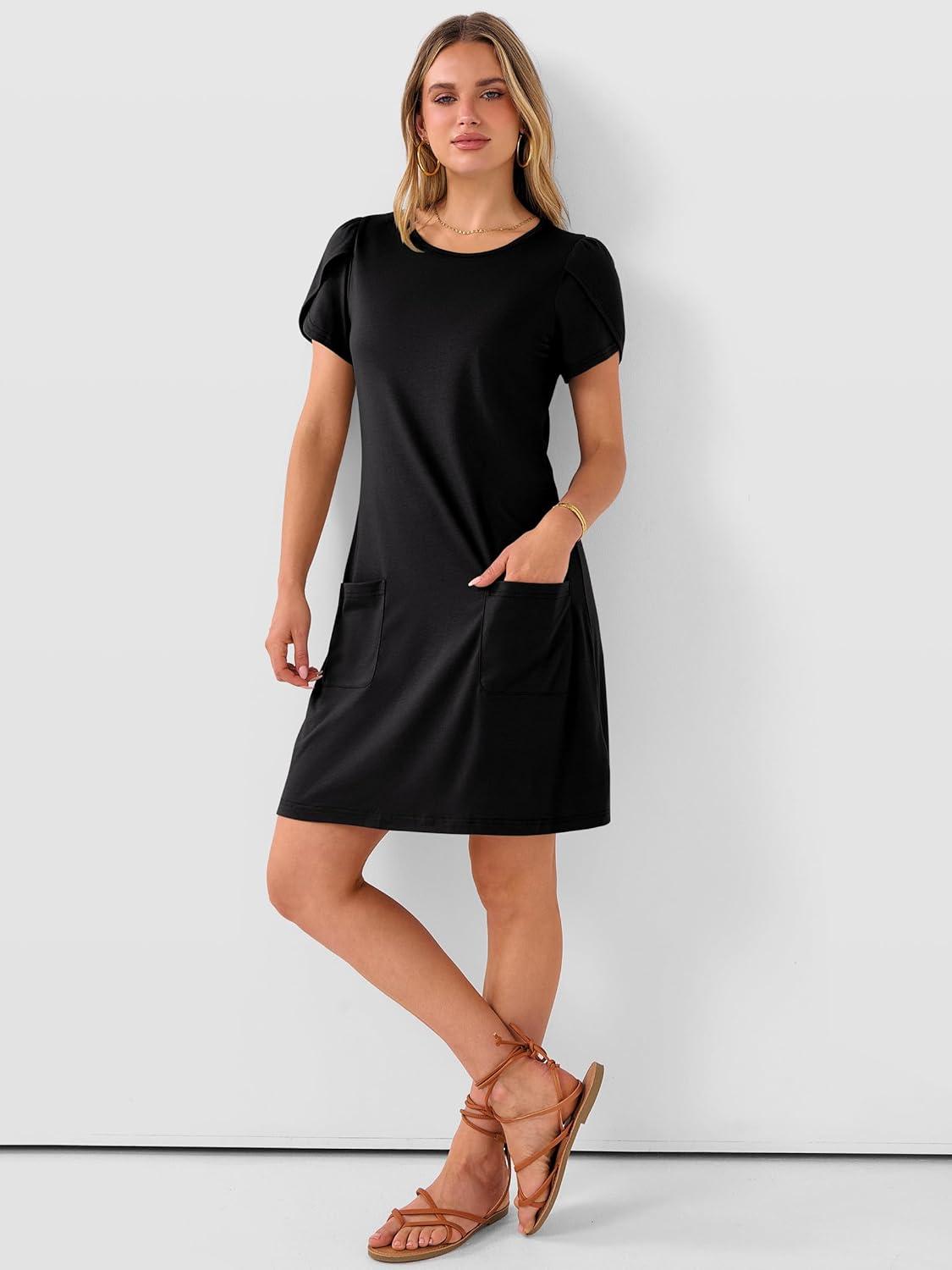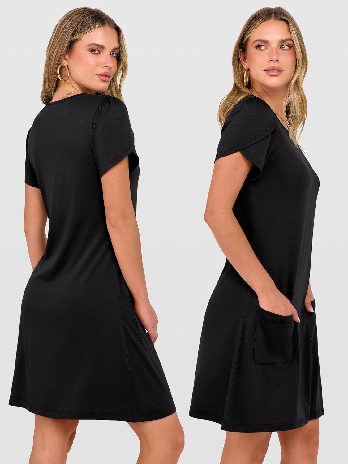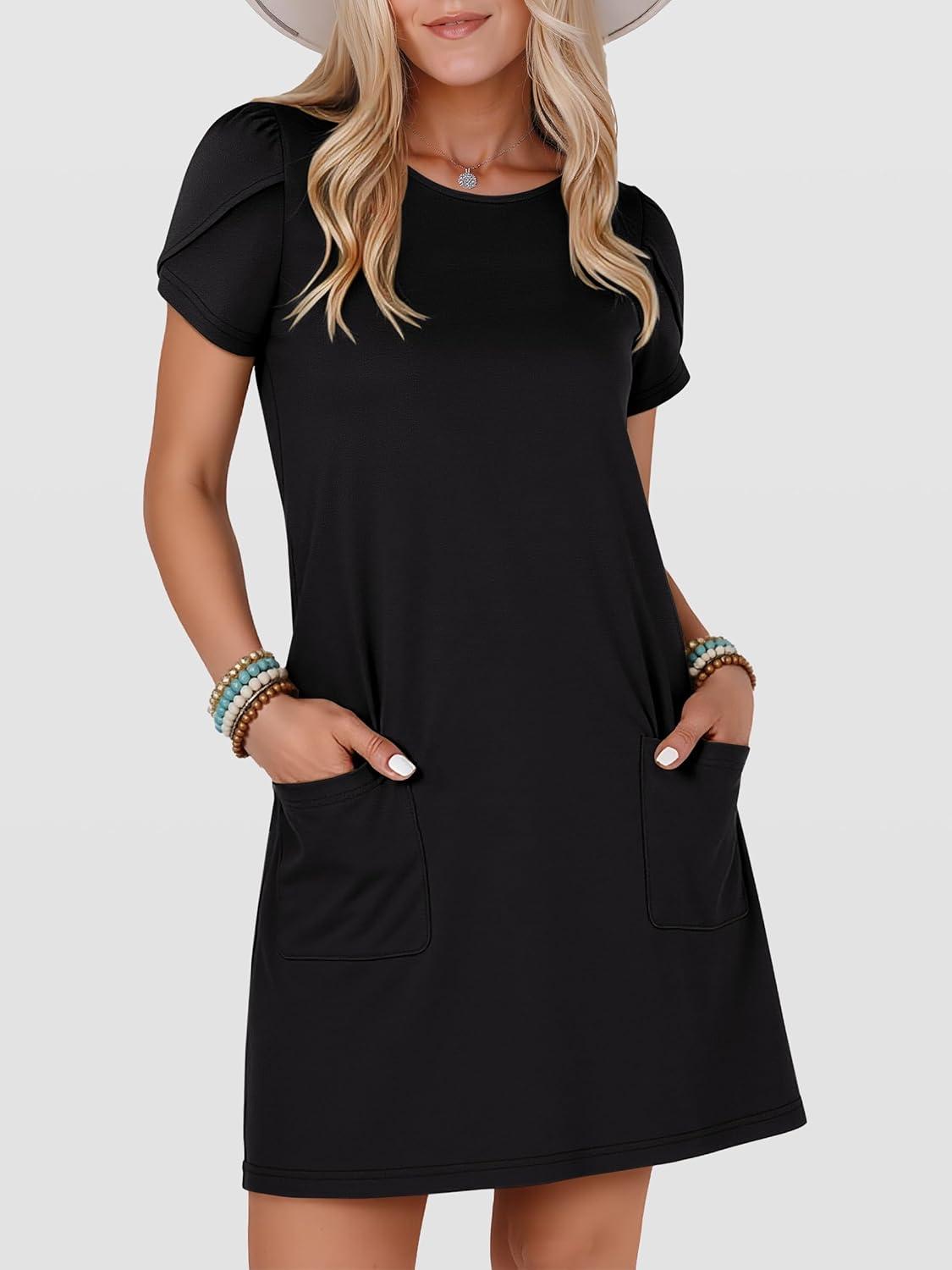 ANRABESS Women Summer Dress Short Sleeve Crew Neck Boho Floral T-Shirt Sundress Beach Vacation Swimsuit Coverup with Pockets(Black)