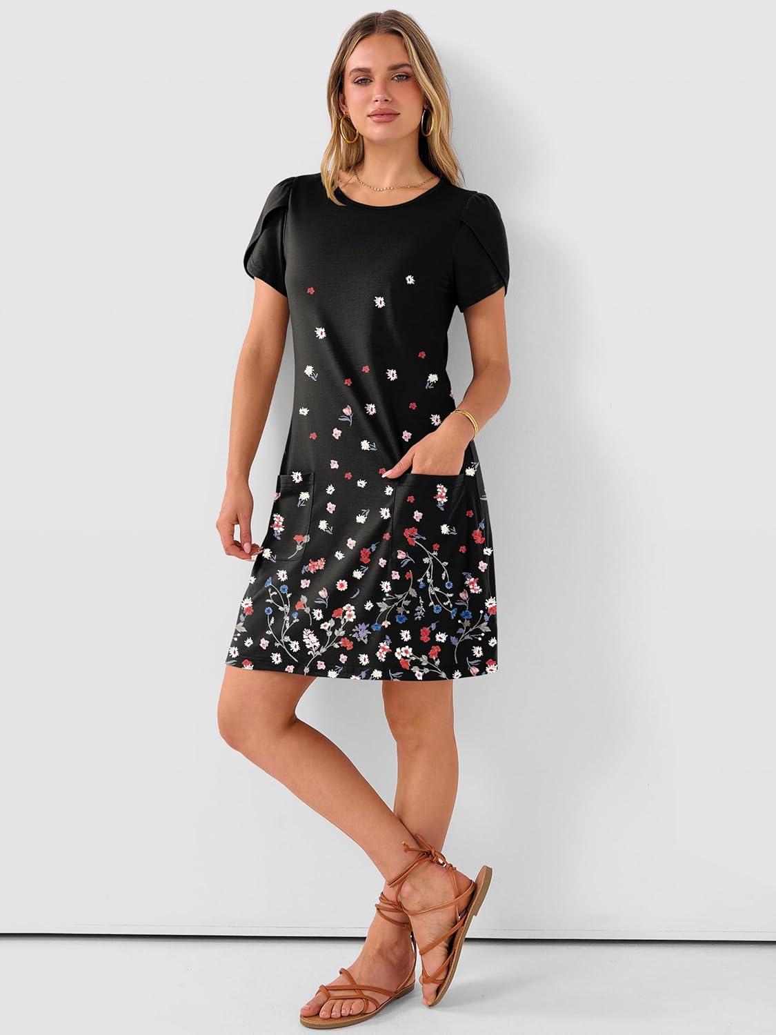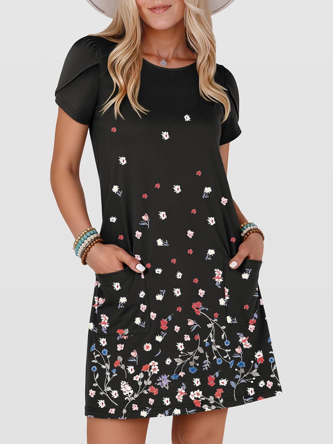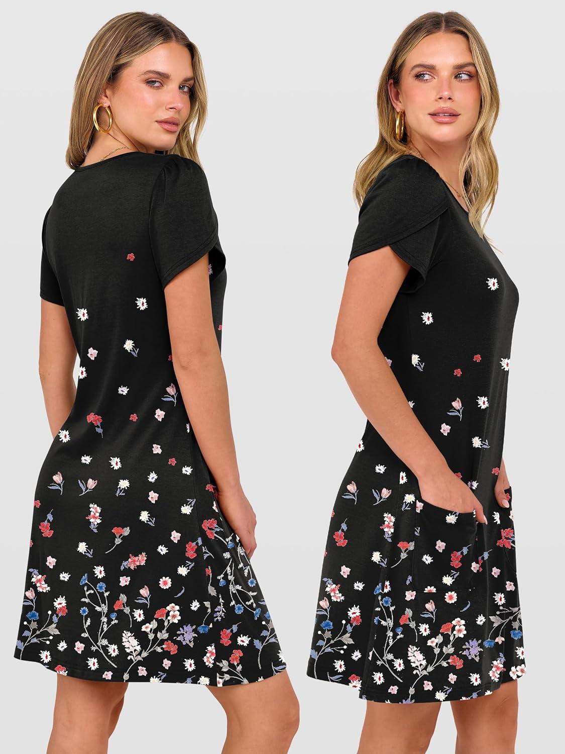 ANRABESS Women Summer Dress Short Sleeve Crew Neck Boho Floral T-Shirt Sundress Beach Vacation Swimsuit Coverup with Pockets(Floral Black)