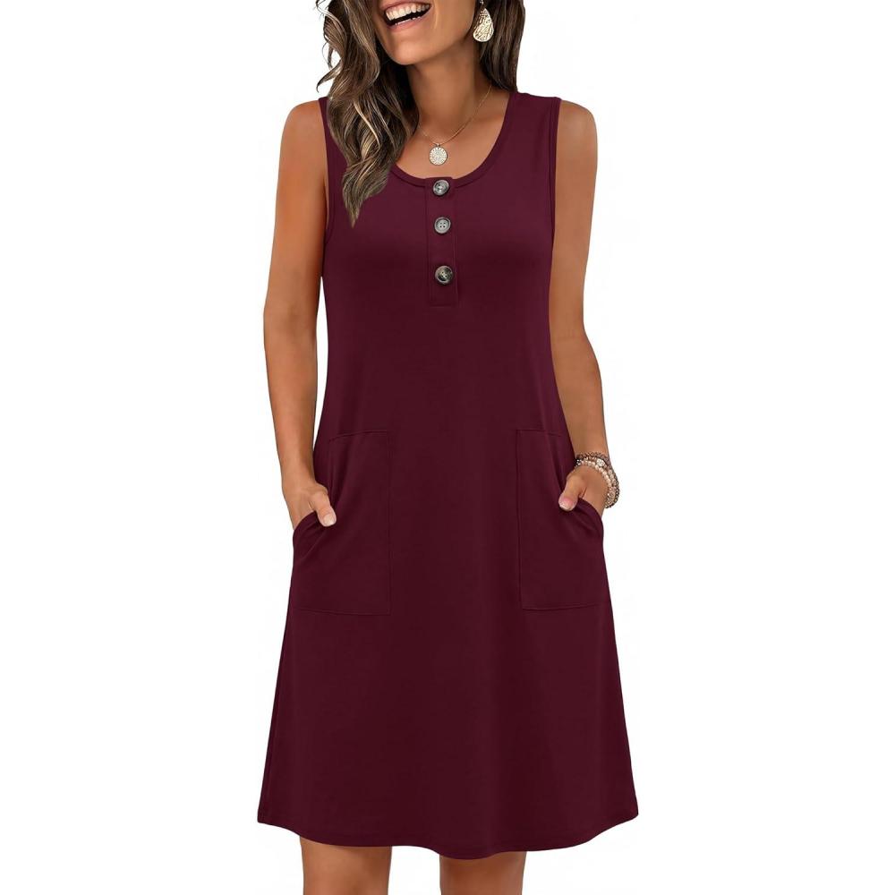 ANRABESS Women Summer Dresses 2026 Casual Sleeveless Button Down Mini Sundress Beach Loose Tank Dress Coverup with Pockets(Burgundy)