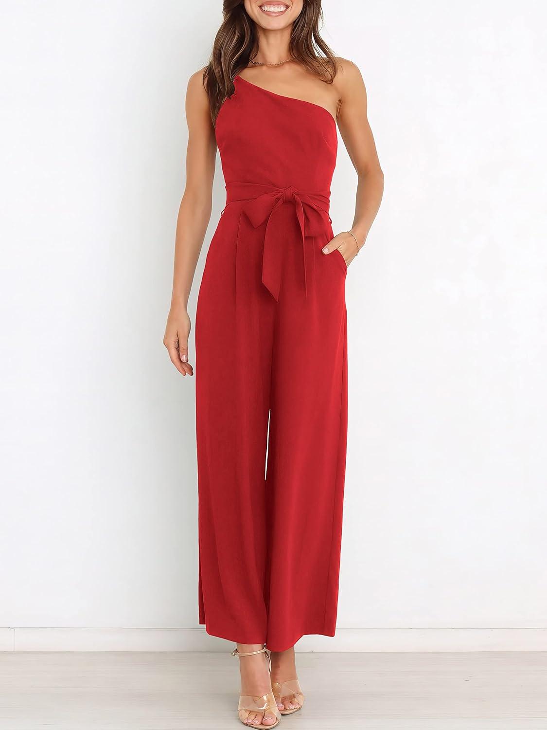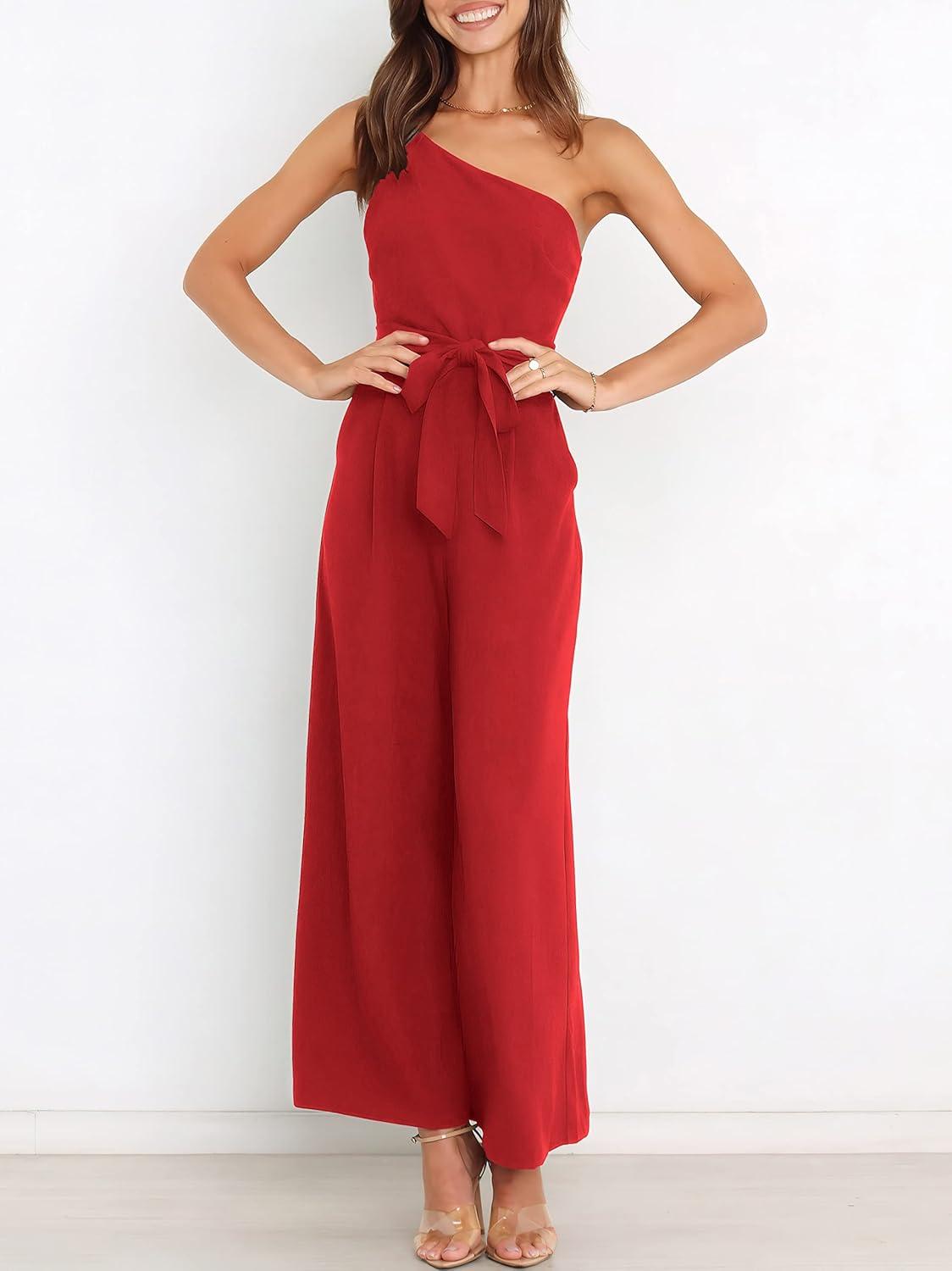 ANRABESS Women Summer Dressy Jumpsuits One Shoulder Sleeveless Casual Wide Leg Pants Romper Jumper 2025 Trendy Fall Outfits(Red)