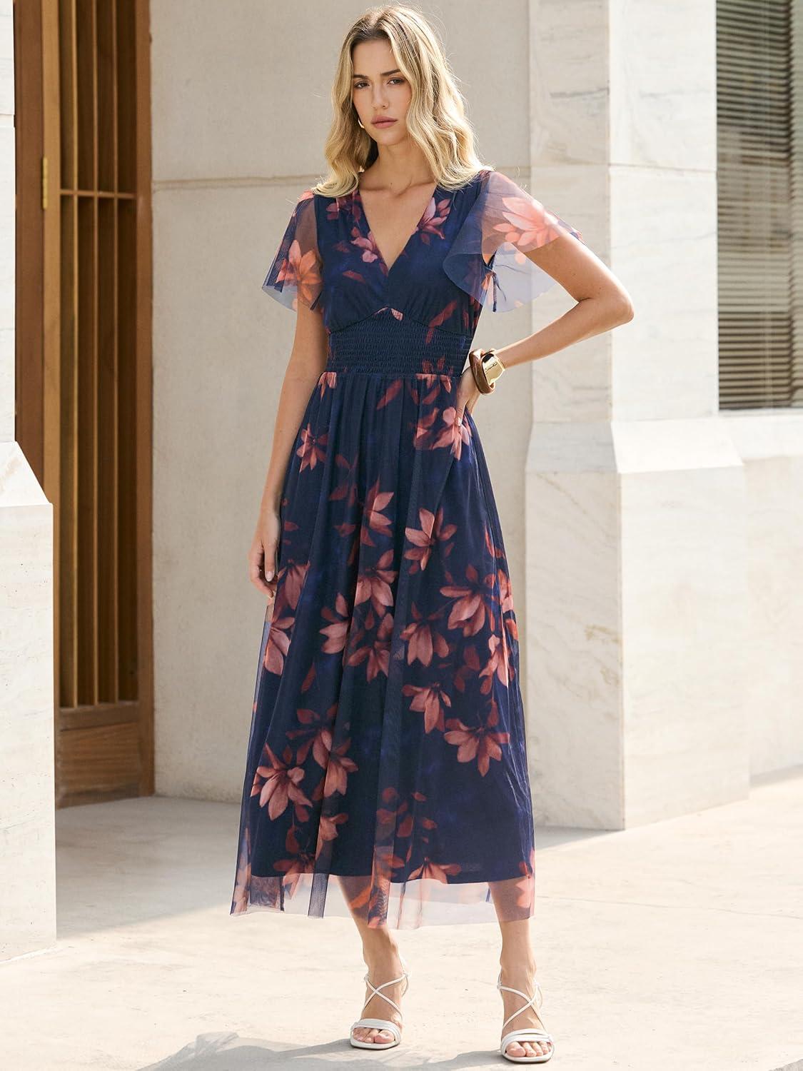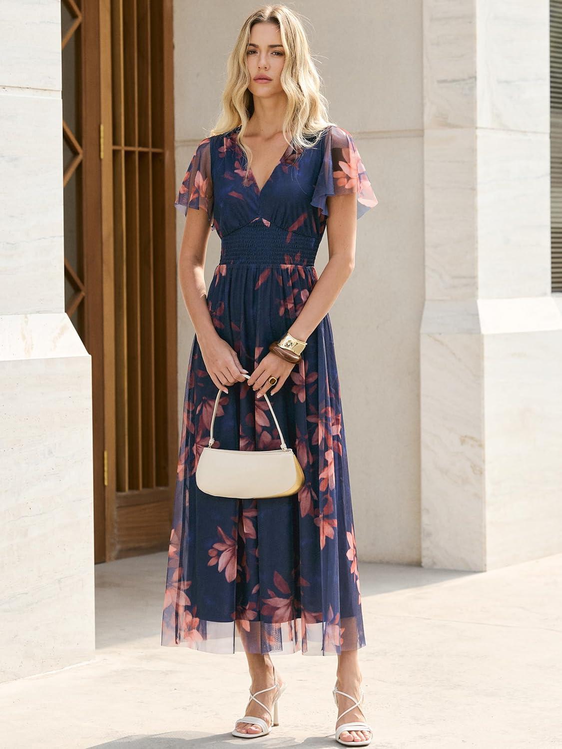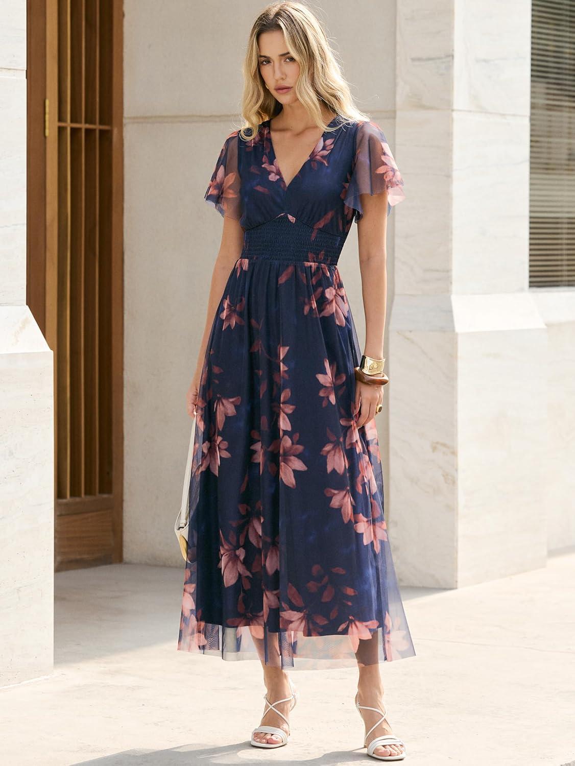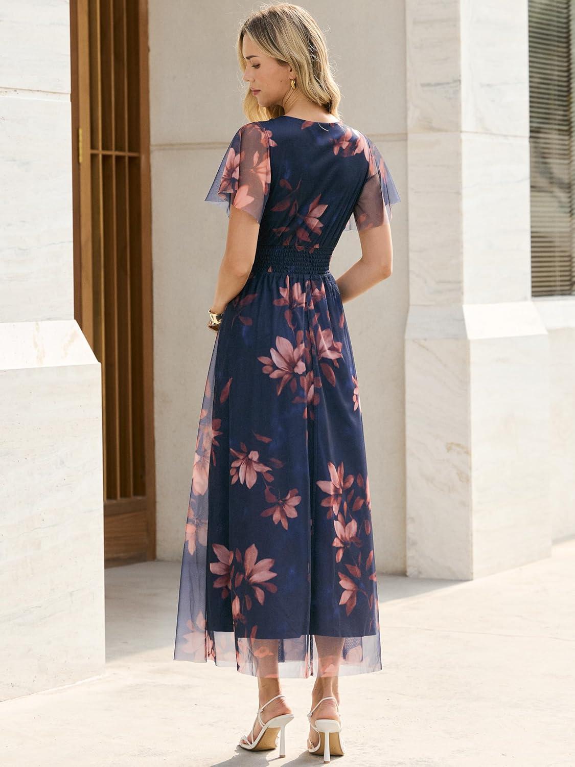 imageANRABESS Women Summer Floral Maxi Dress Short Sleeve Boho Flowy Tulle Beach Vacation Wedding Guest 2026 Party Long DressesBrown Floral Dark Blue
