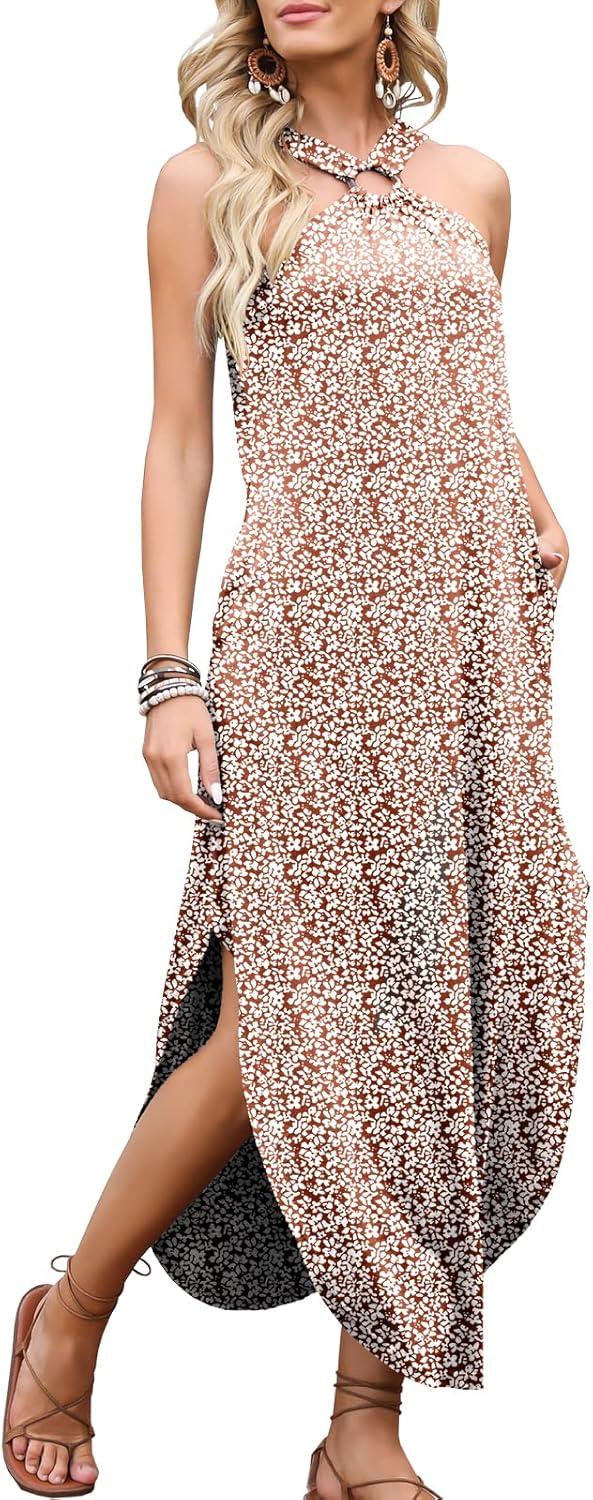 ANRABESS Women Summer Halter Neck Sundress Sleeveless Split Side Casual Beach Travel Vacation Maxi Long Dress with Pockets(Print Pink 01)