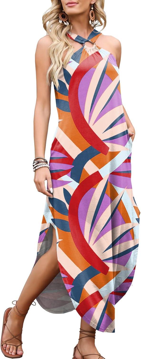 ANRABESS Women Summer Halter Neck Sundress Sleeveless Split Side Casual Beach Travel Vacation Maxi Long Dress with Pockets(Print Rainbow)