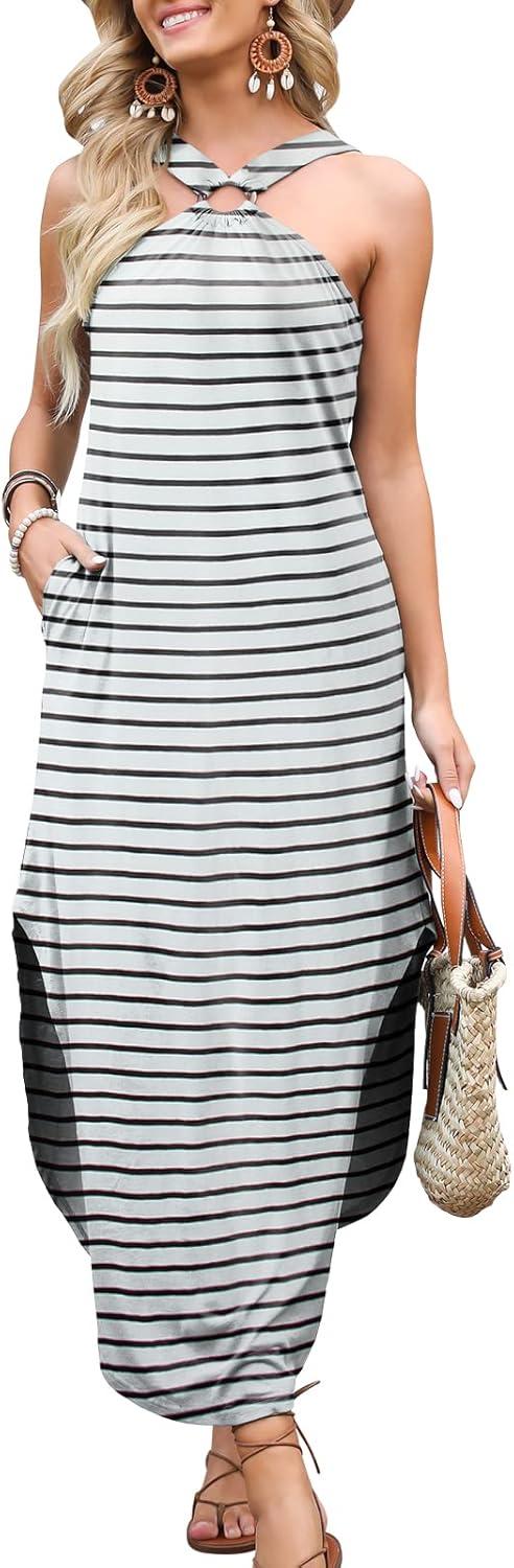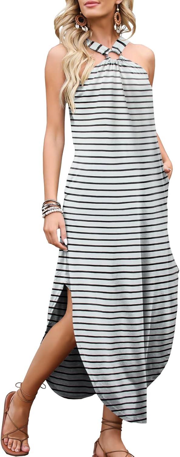 ANRABESS Women Summer Halter Neck Sundress Sleeveless Split Side Casual Beach Travel Vacation Maxi Long Dress with Pockets(Striped)