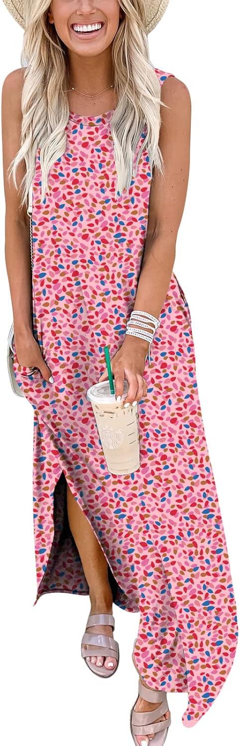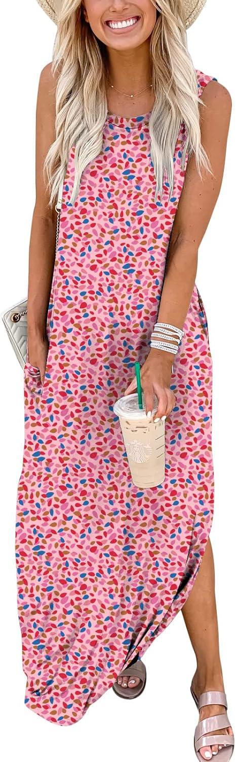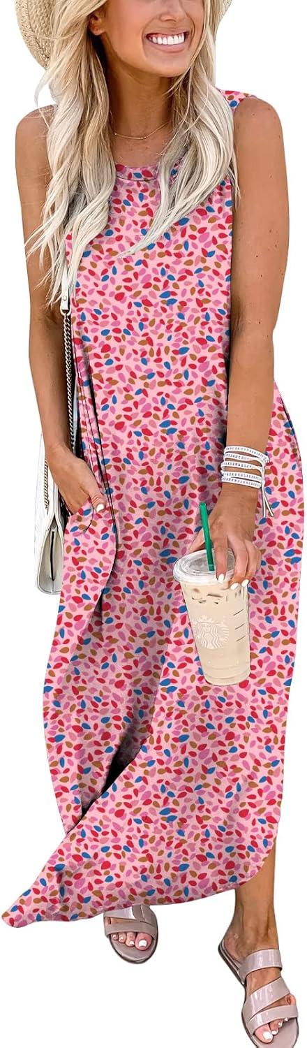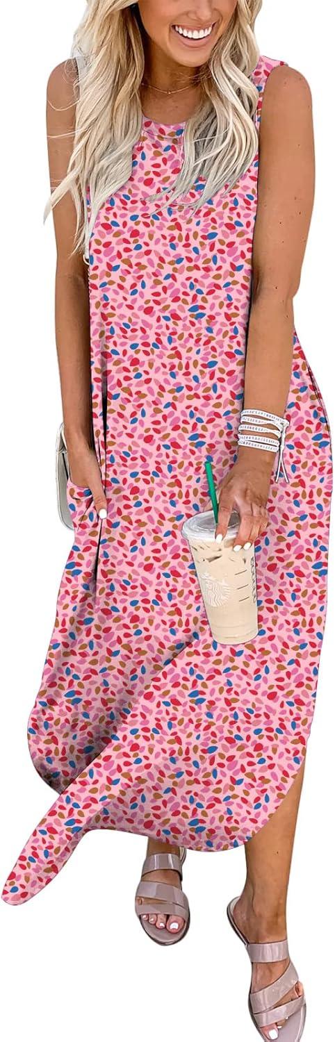 ANRABESS Women Summer Maxi Dress Beach Vacation Sundress Sleeveless Casual Loose Shirt Dresses 2025 Travel Outfits(Floral Pink)