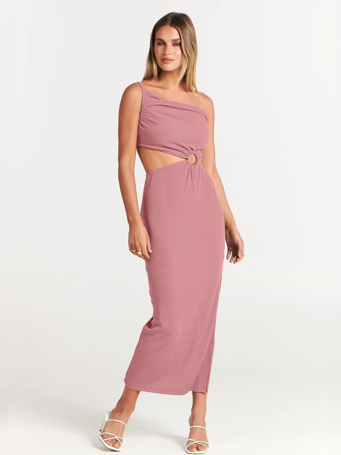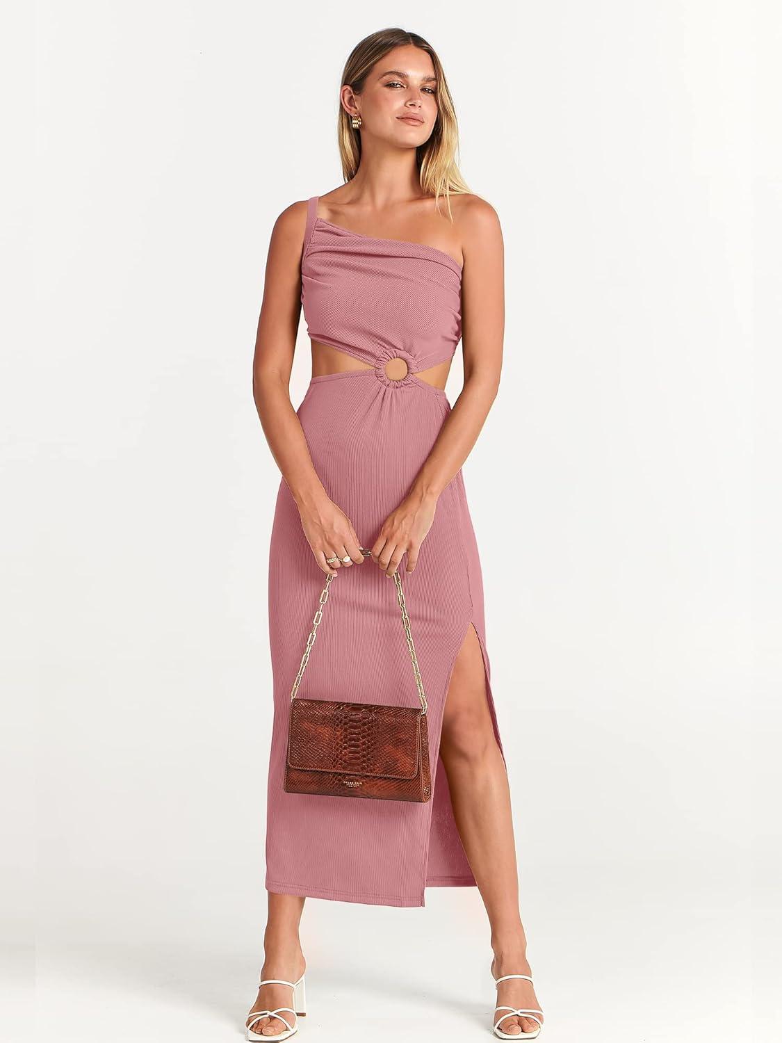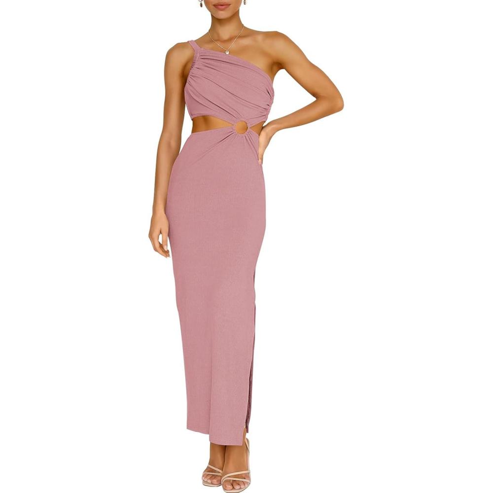 ANRABESS Women Summer One Shoulder Sleeveless Maxi Dress Cutout Sexy Bodycon Semi Formal Dinner Date Vacation Dresses(Pink)
