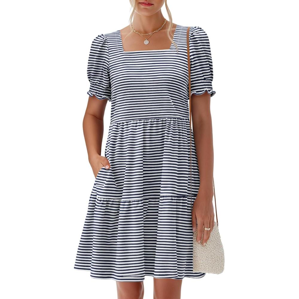 ANRABESS Women Summer Square Neck Puff Short Sleeve Mini Dress 2026 Casual Flowy Sundress Beach Vacation Clothes with Pockets(Navy Blue White Striped)