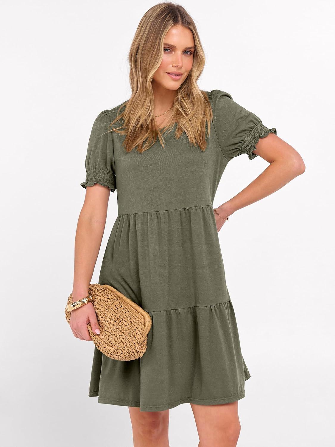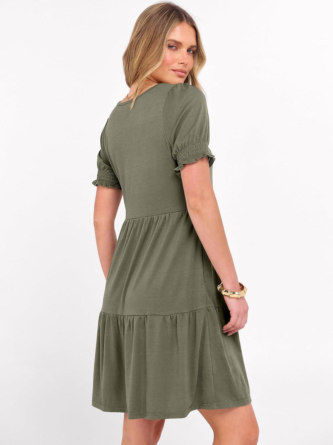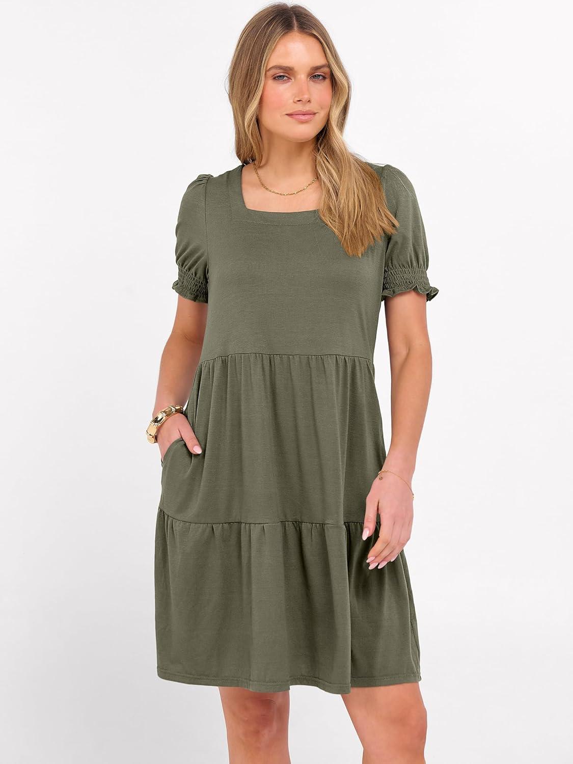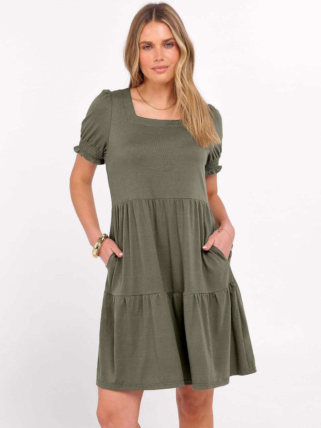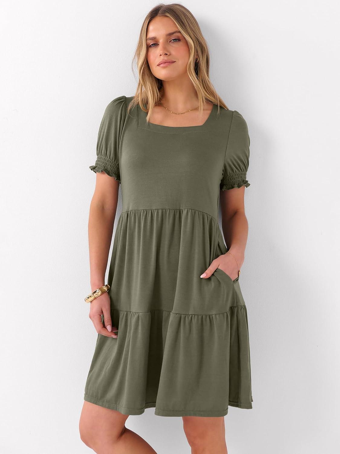 ANRABESS Women Summer Square Neck Puff Short Sleeve Mini Dress 2026 Casual Flowy Sundress Beach Vacation Clothes with Pockets(Olive)
