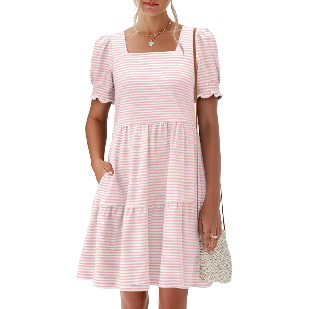 ANRABESS Women Summer Square Neck Puff Short Sleeve Mini Dress 2026 Casual Flowy Sundress Beach Vacation Clothes with Pockets(Pink Striped)