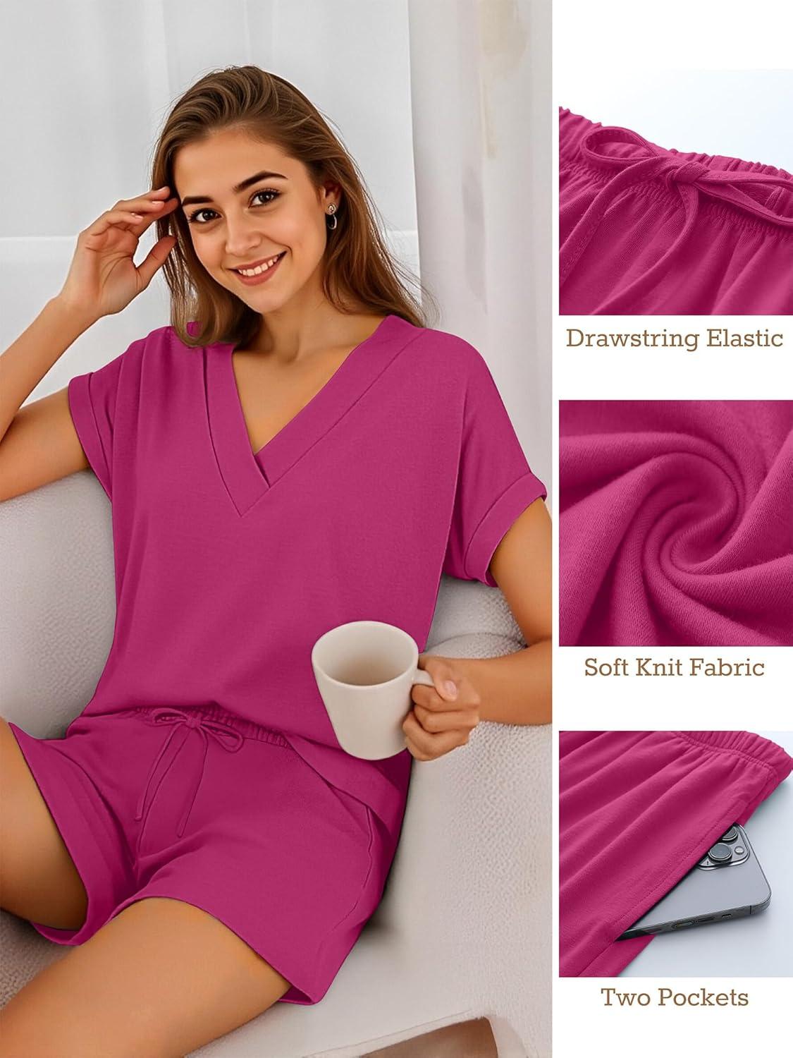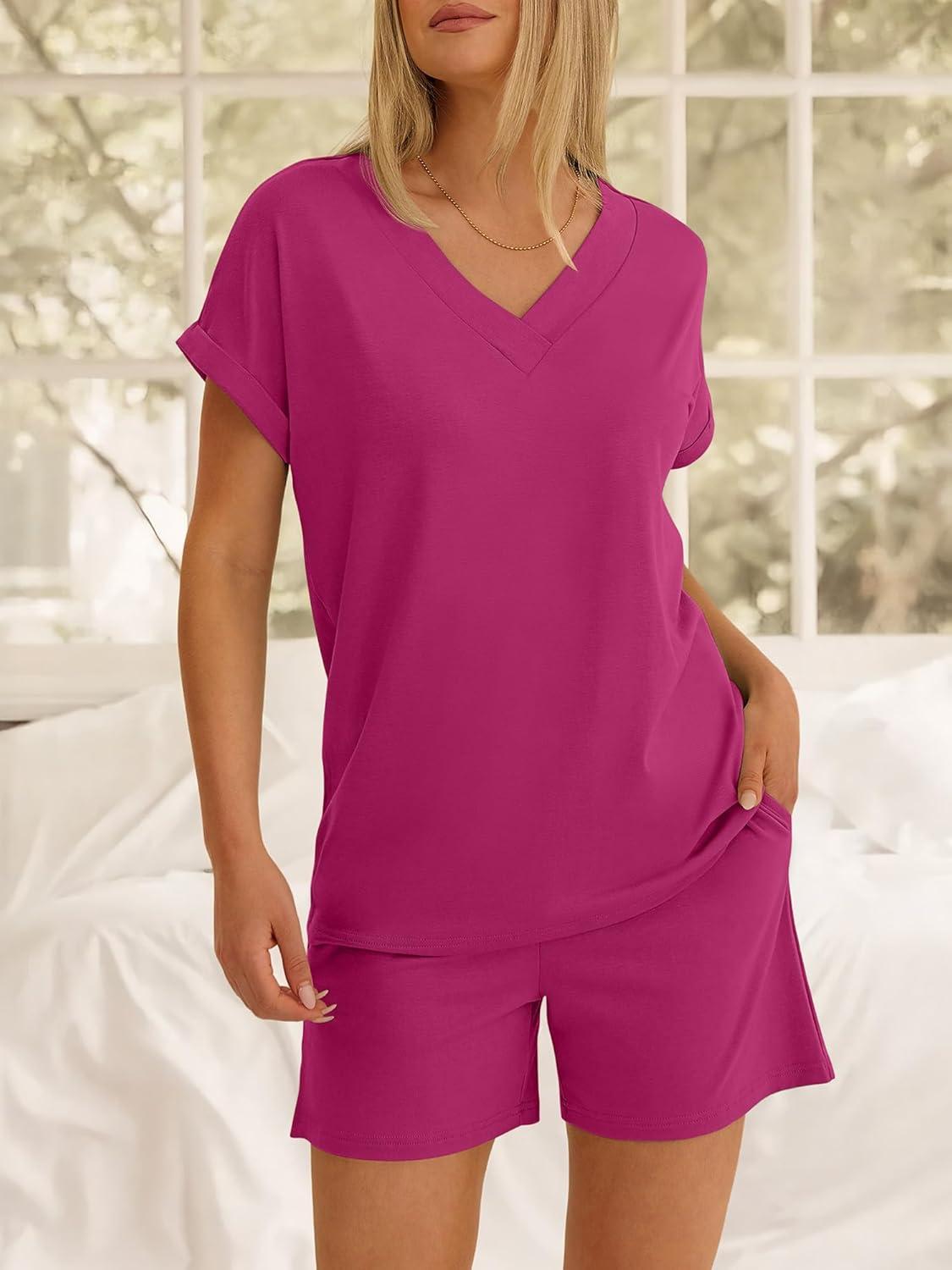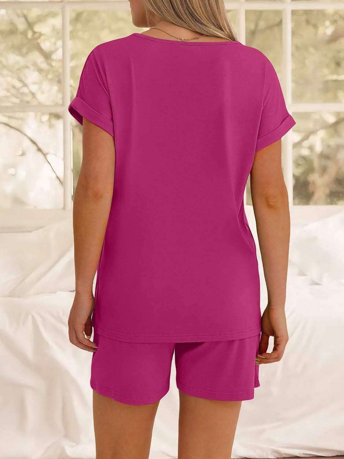 ANRABESS Women Summer Two Piece Lounge Sets Top Matching Shorts Pajama Set 2026 Spring Casual Outfits Beach Vacation Clothes(Hot Pink)