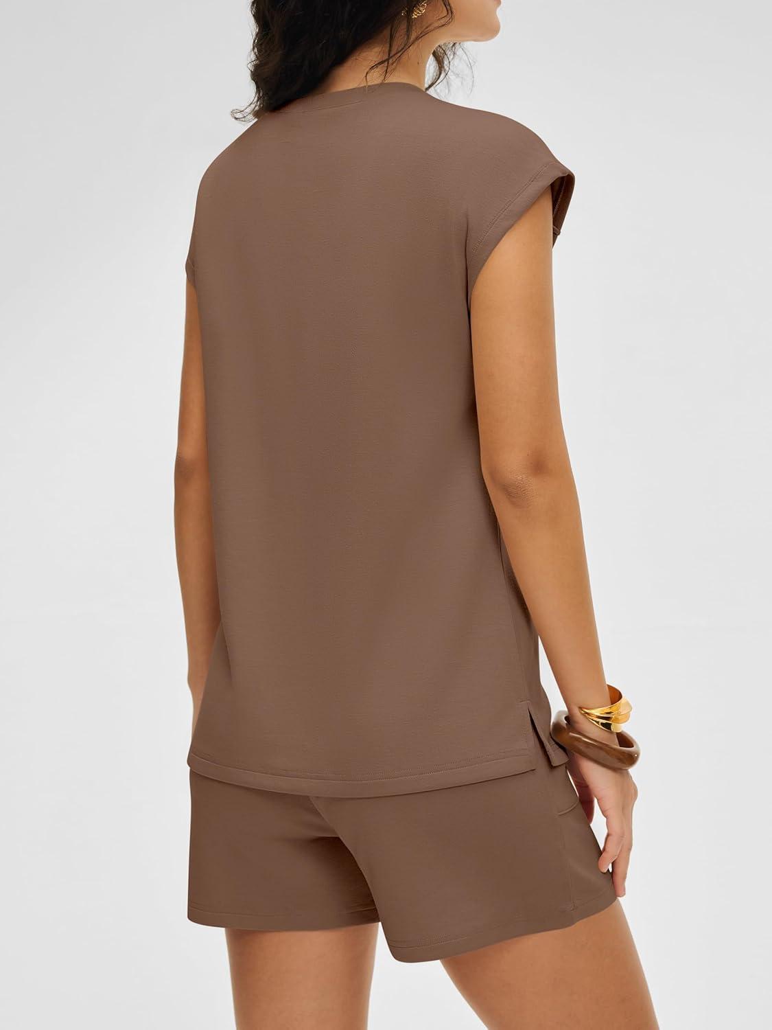 ANRABESS Women Summer Two Piece Lounge Short Sets 2026 Beach Vacation Travel Airport Outfits Comfy Fashion Sweatsuits(Brown)