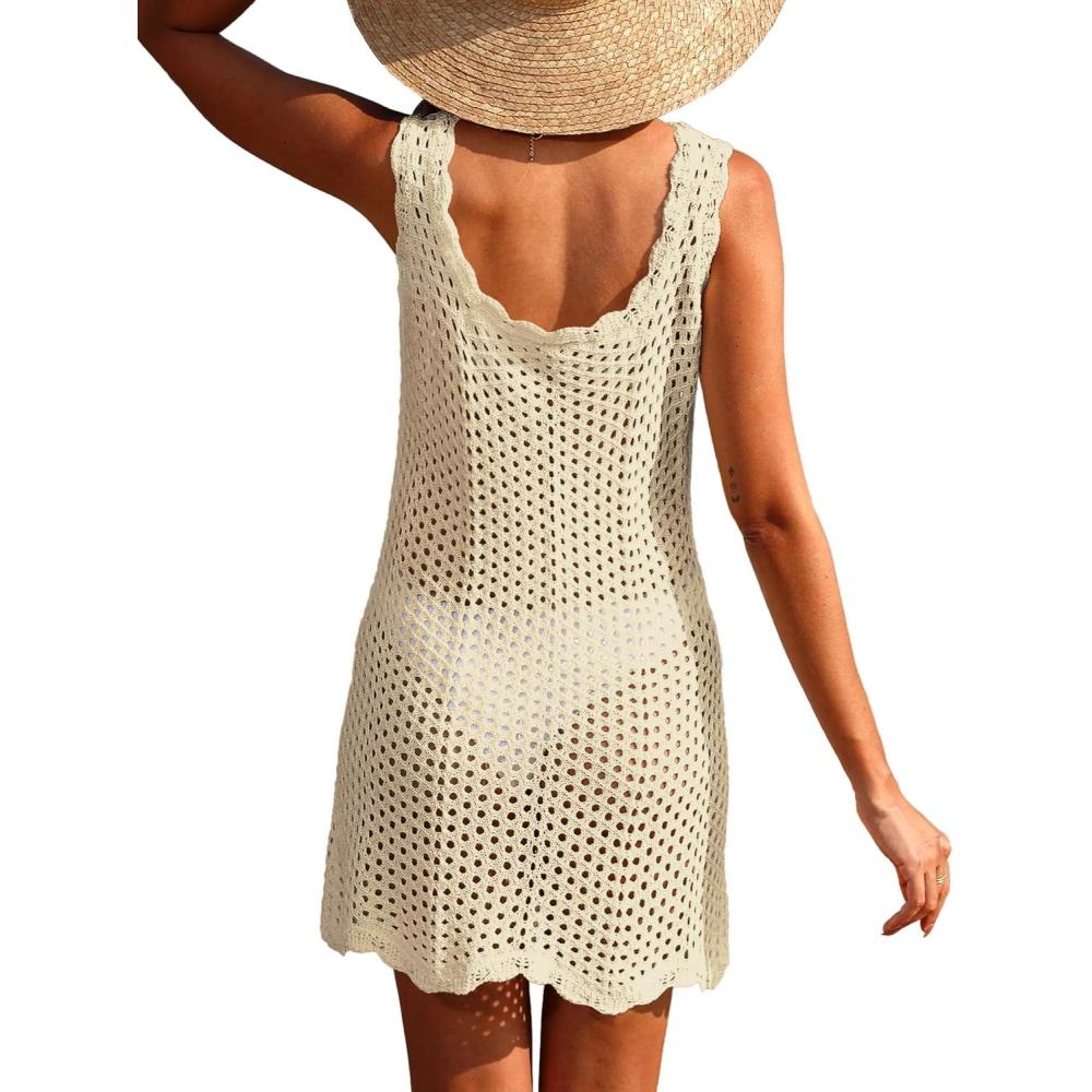 ANRABESS Women Swimsuit Cover Ups Summer Sleeveless Beach Crochet Swimwear Bathing Suit Knit Swim Dress 2025 Vacation Outfits(Beige)