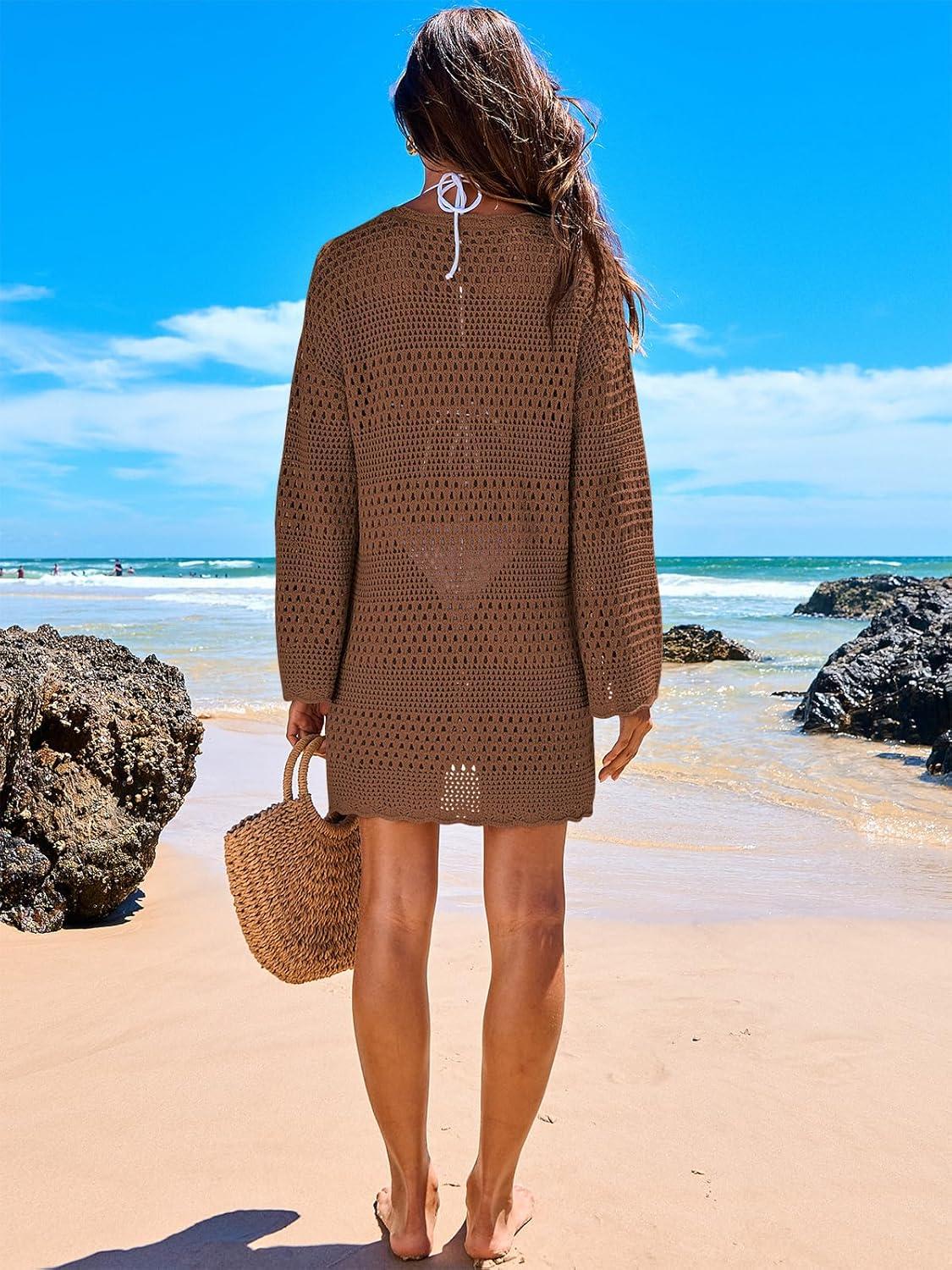 ANRABESS Women Swimsuit Crochet Swim Cover Up 2026 Summer Bathing Suit Swimwear Mesh Knit Beach Dress Vacation Outfits(Brown)