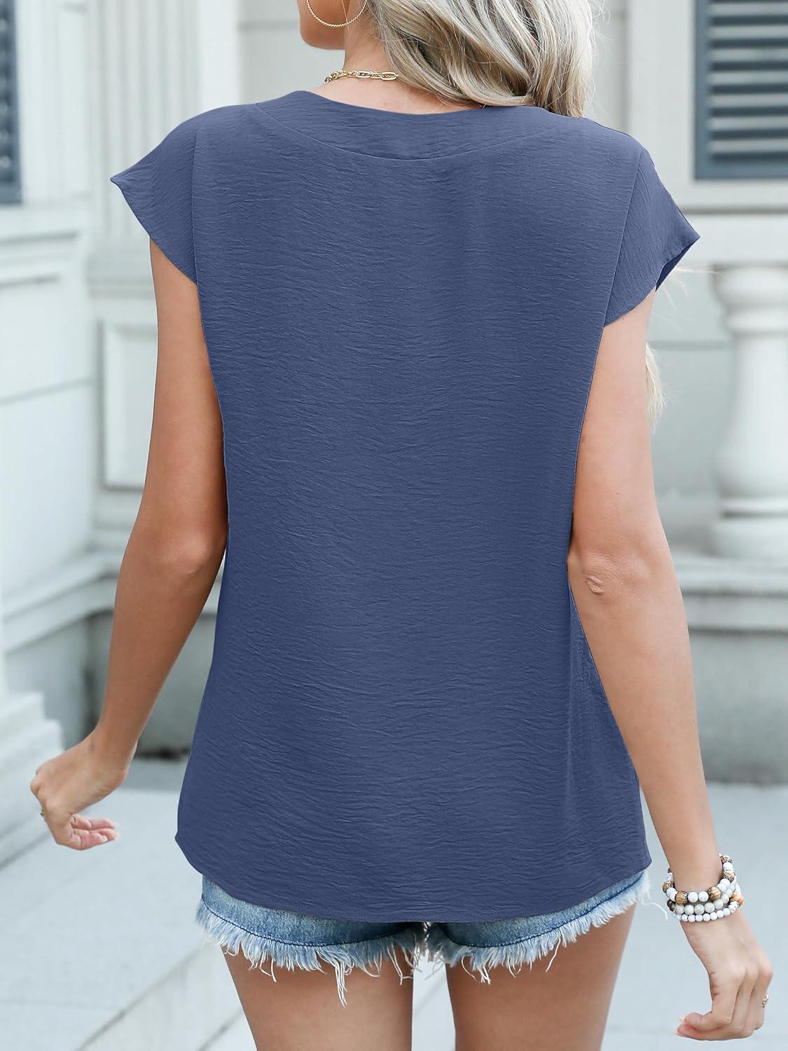ANRABESS Women Tops Cap Sleeve Textured Dressy Casual V Neck Shirts 2025 Summer Business Work Blouses Outfits(Dark Blue)