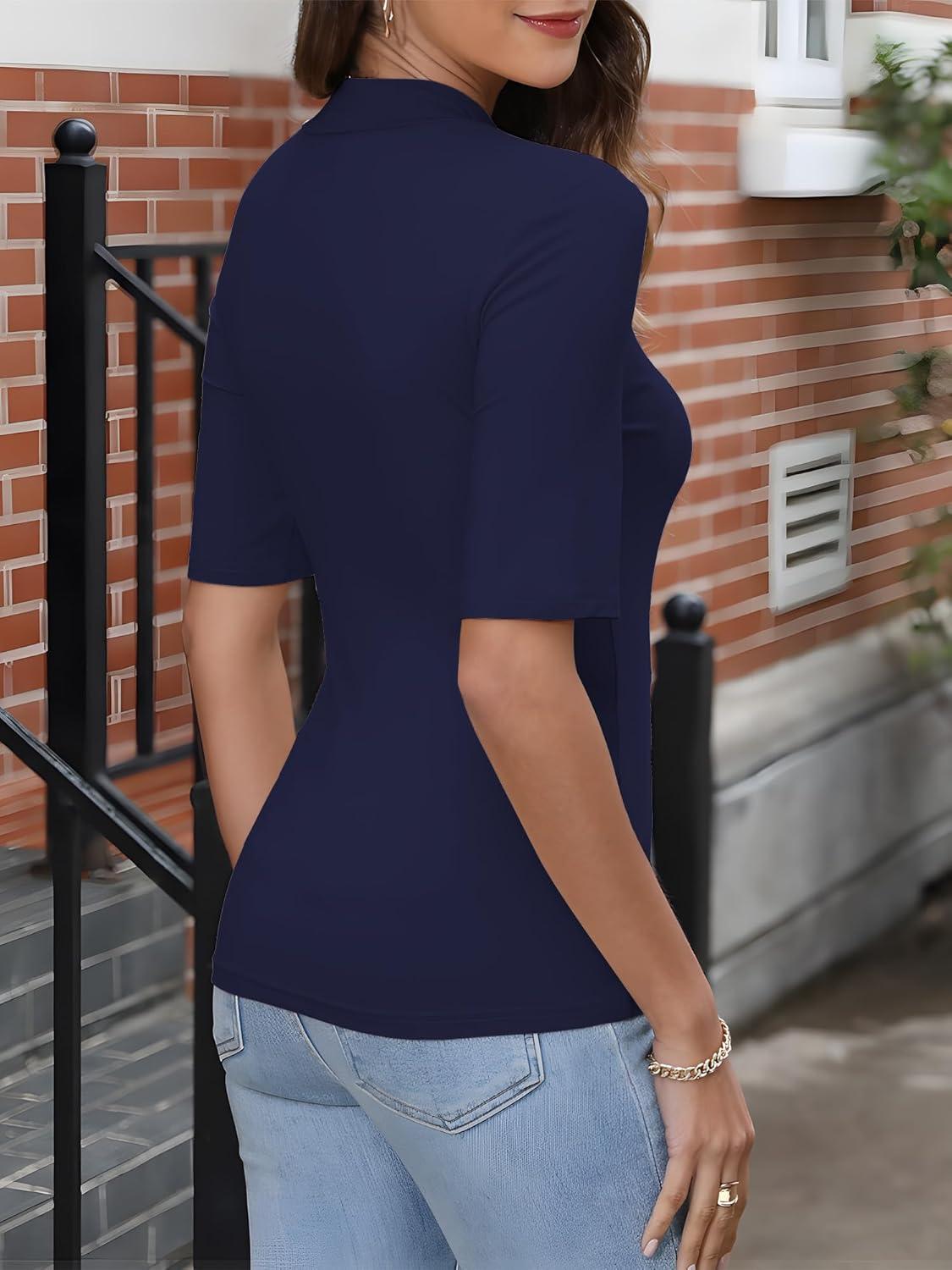 ANRABESS Women Tops Mock Neck 1/2 Short Sleeve Slim Fit Basic Tee Shirts Dressy Work Business 2025 Summer Fall Casual Outfits(Navy Blue)