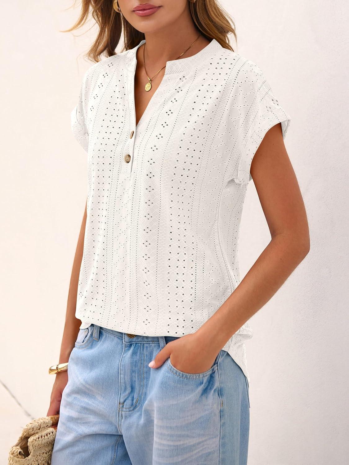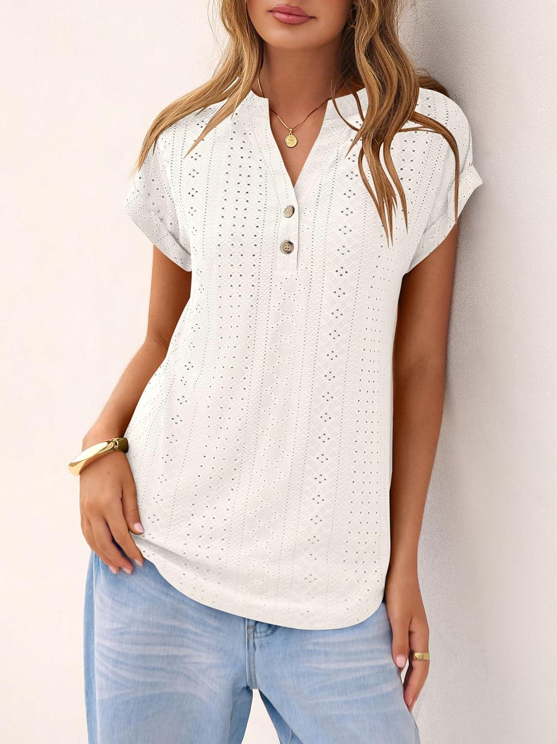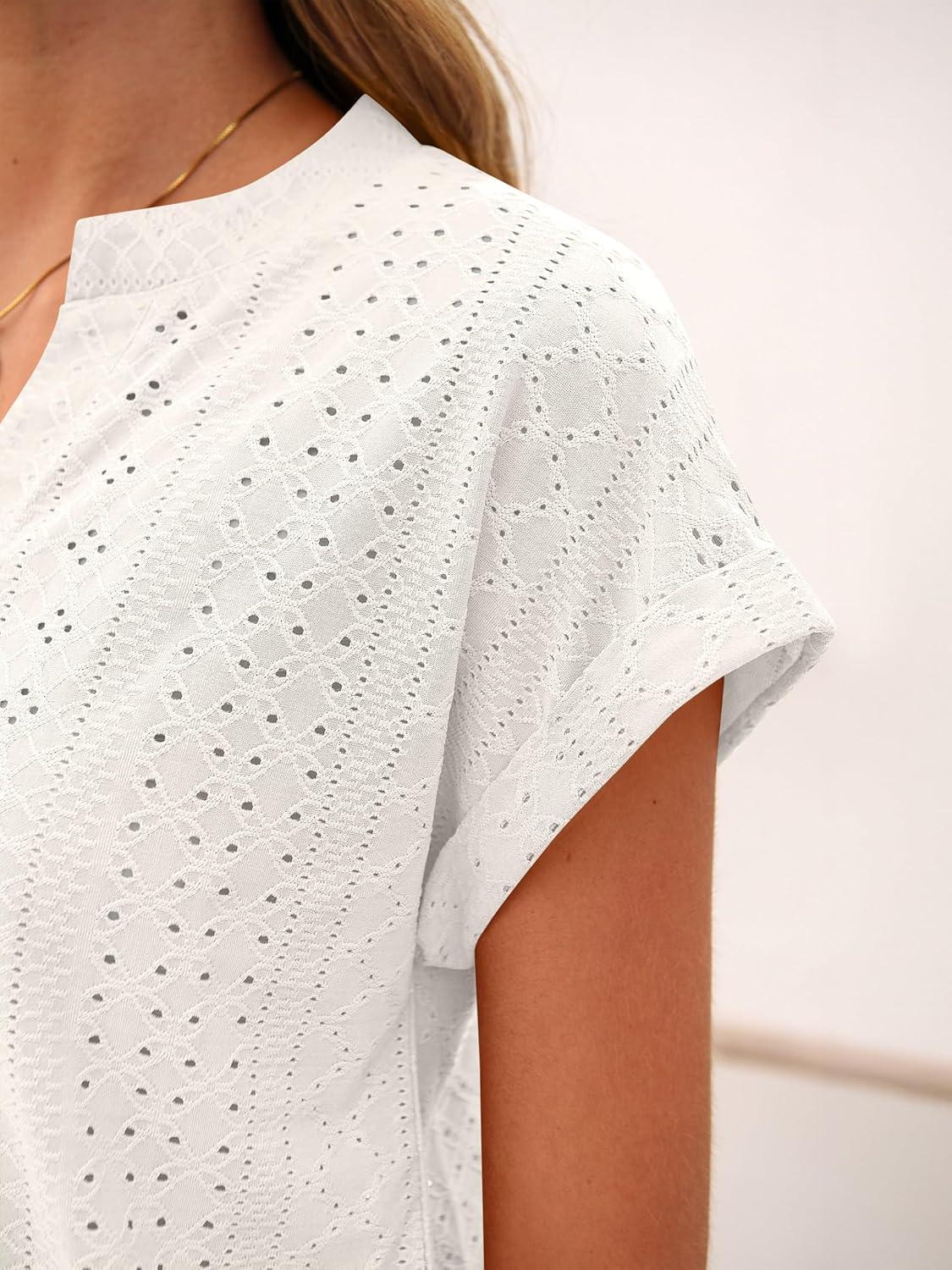 ANRABESS Women Tops Short Sleeve V Neck Eyelet Shirts Dressy Casual Blouses 2026 Summer Tee T-Shirts Vacation Outfits(Off-white)