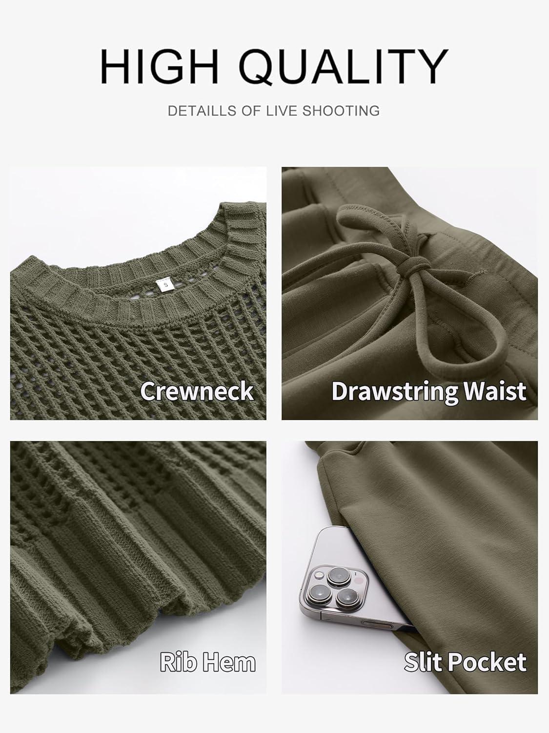 ANRABESS Women Two Piece Outfits Crochet Sheer Knit Sweater Top Wide Leg Pants Lounge Matching Sets Sweatsuit Travel Clothes(Army Green)