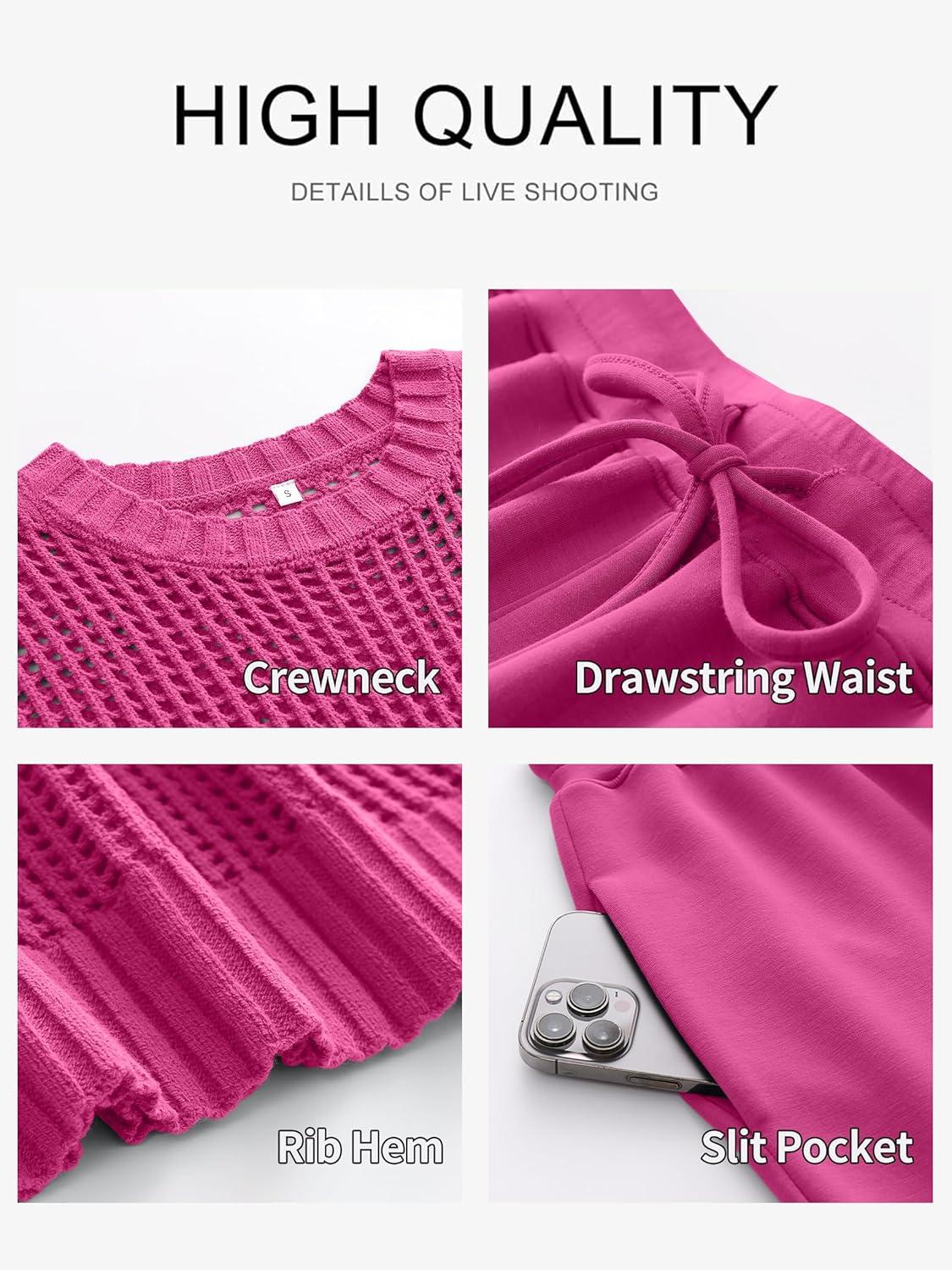 ANRABESS Women Two Piece Outfits Crochet Sheer Knit Sweater Top Wide Leg Pants Lounge Matching Sets Sweatsuit Travel Clothes(Hot Pink)