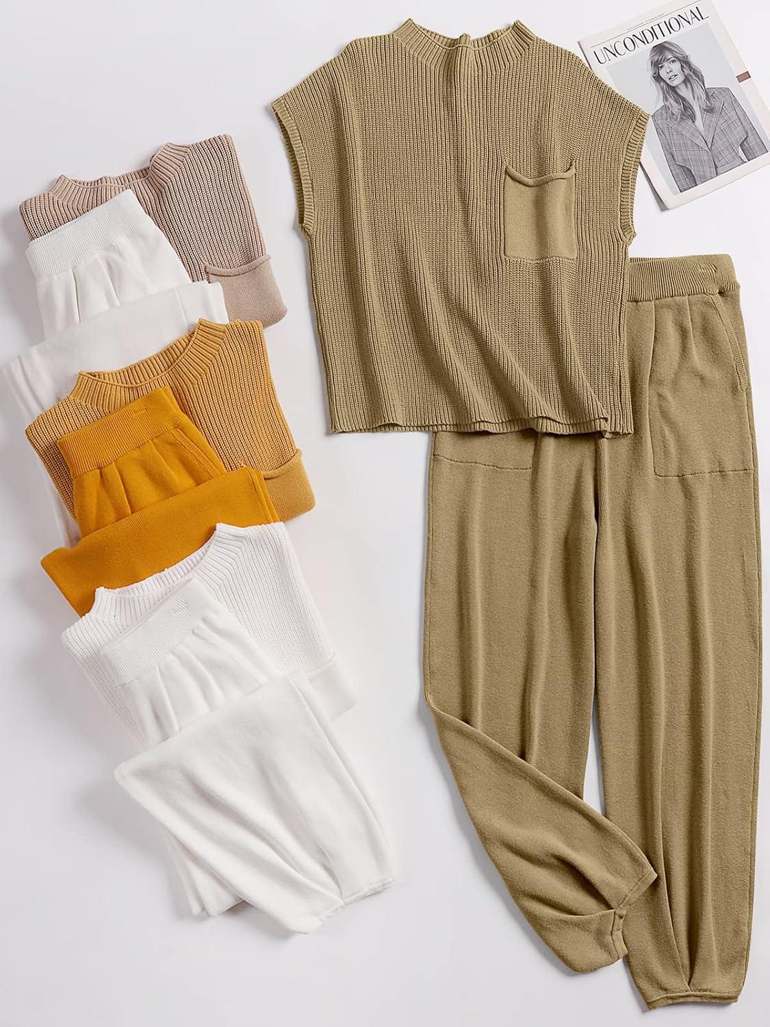 imageANRABESS Women Two Piece Outfits Summer Sweater Vest Crop Top Pants Lounge Matching Set Travel Airport Beach Vacation ClothesBrown