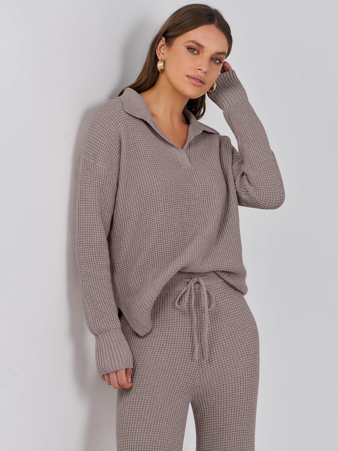imageANRABESS Women Two Piece Outfits Sweater Sets Lounge Waffle Knit Pullover Matching Wide Leg Pants Tracksuit 2025 Fall FashionChocola