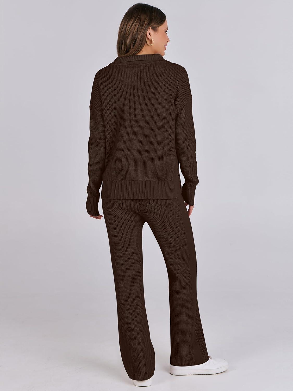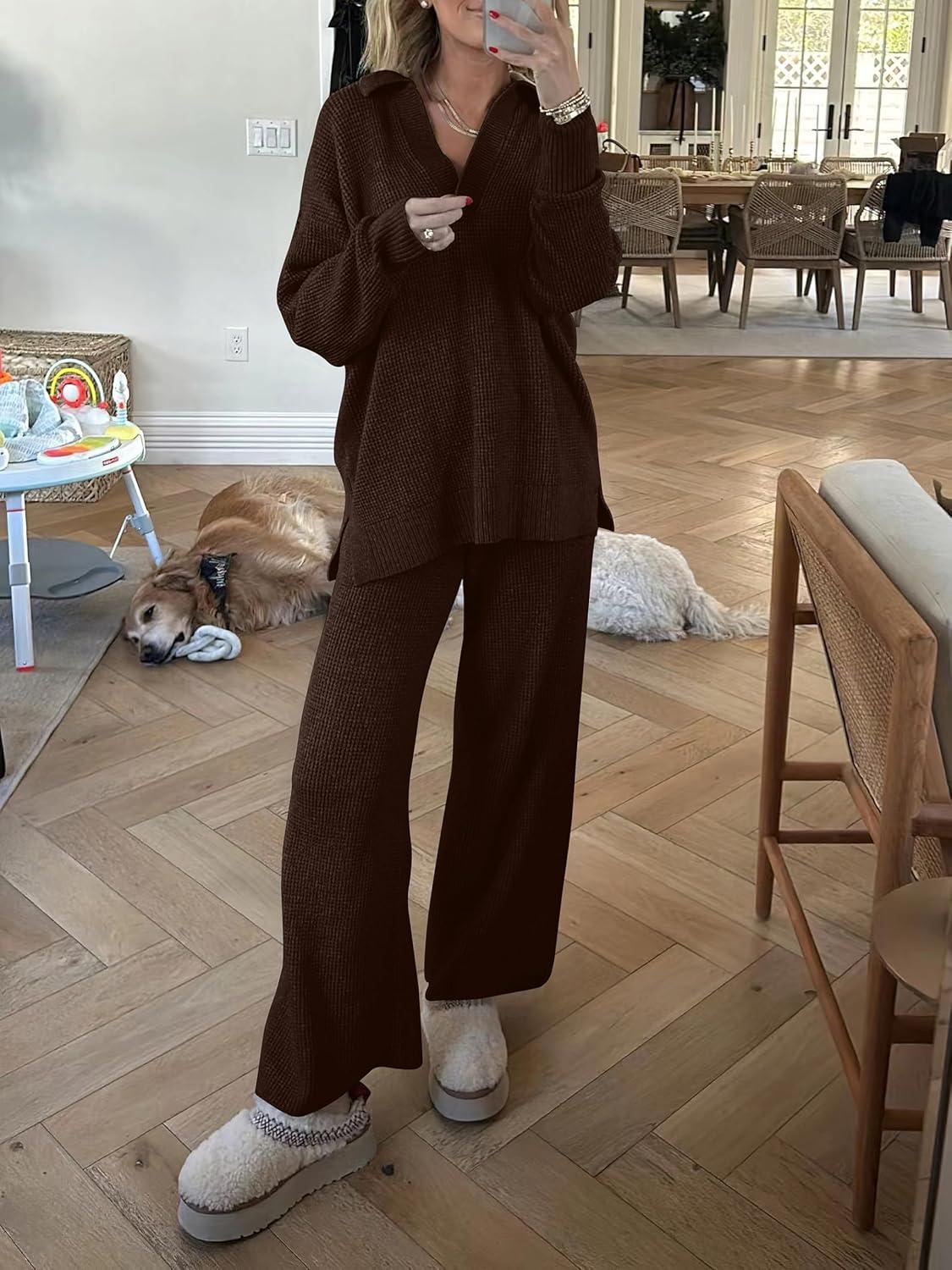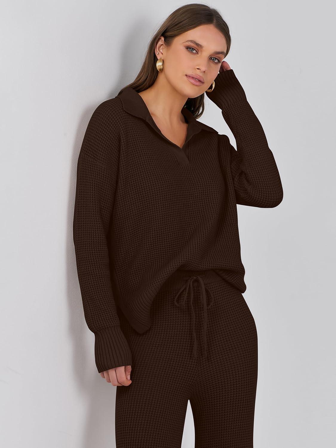 ANRABESS Women Two Piece Outfits Sweater Sets Lounge Waffle Knit Pullover Matching Wide Leg Pants Tracksuit 2025 Fall Fashion(Chocola)
