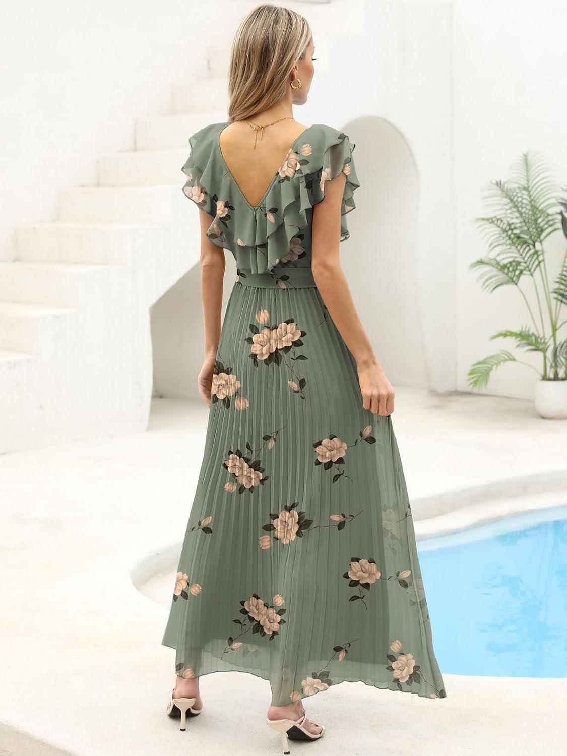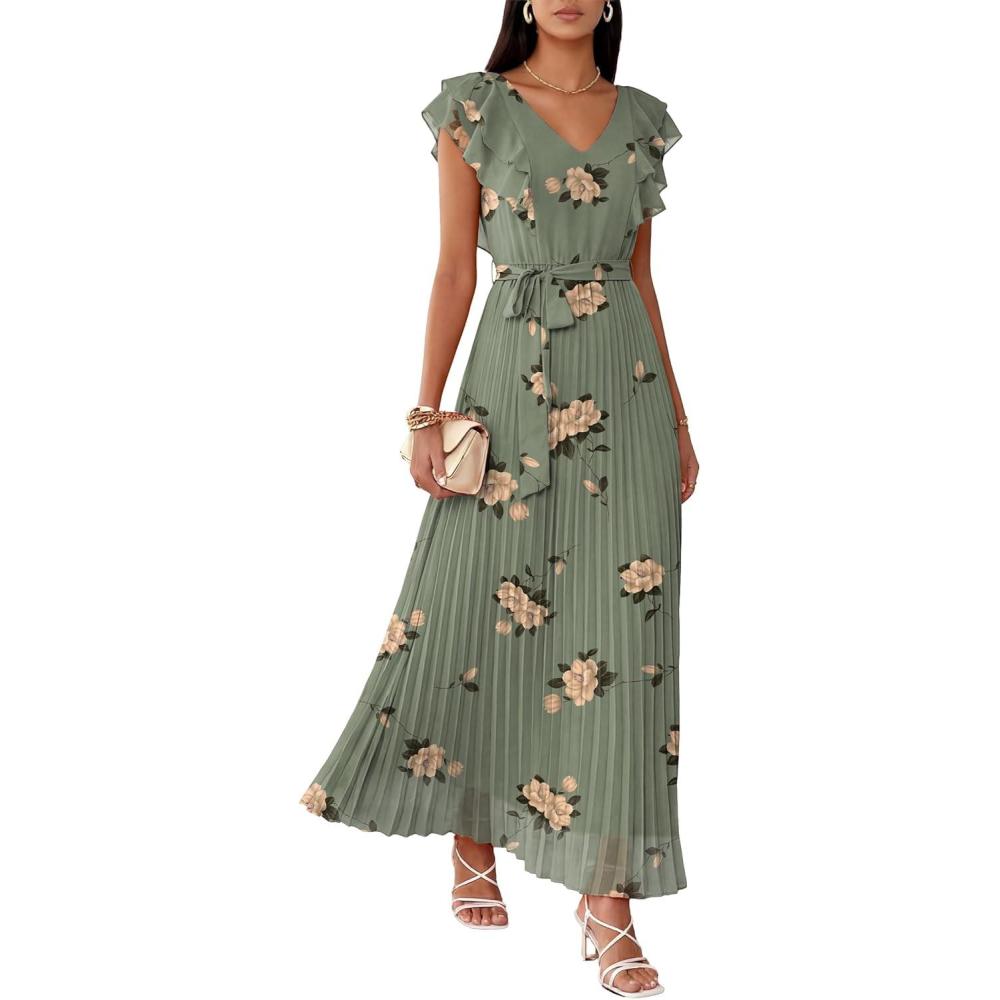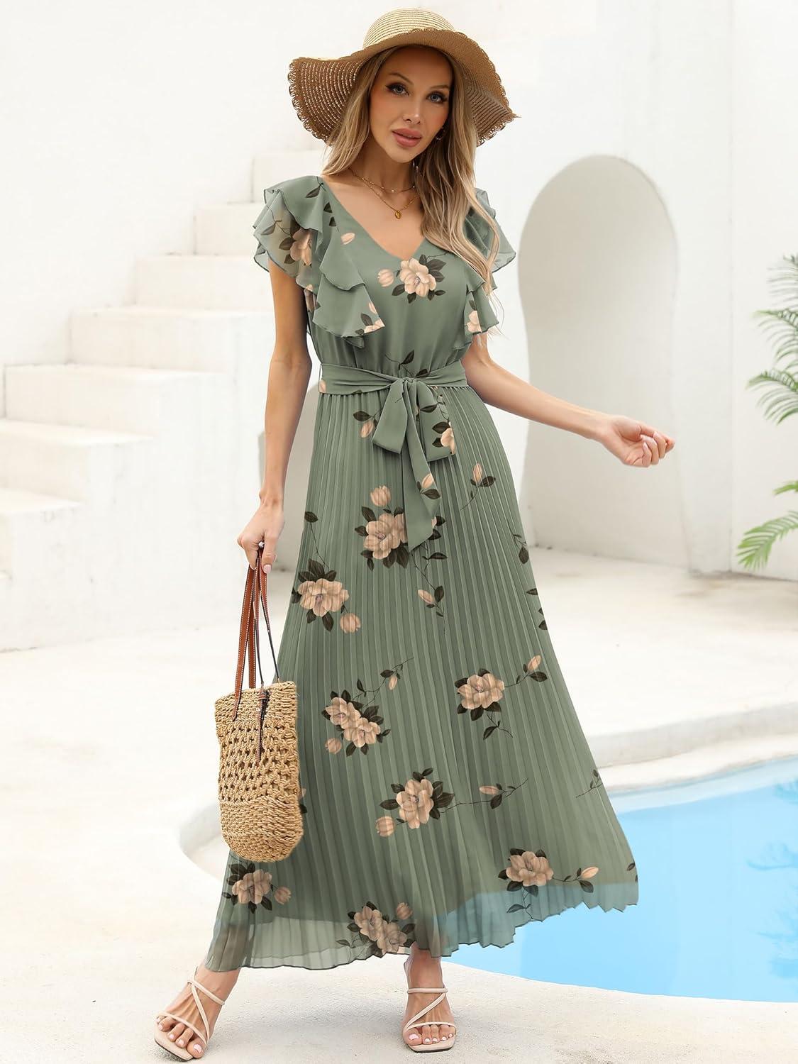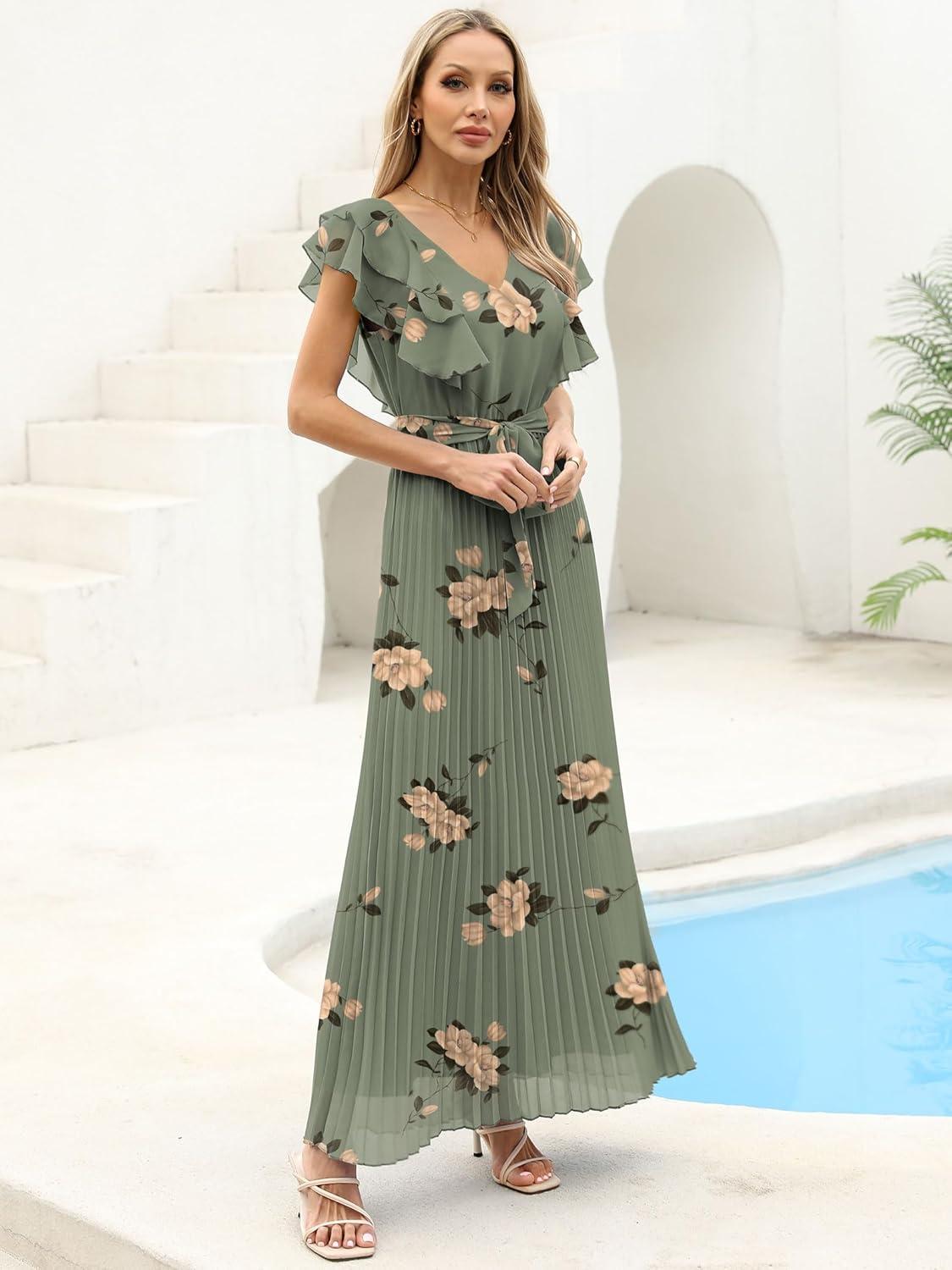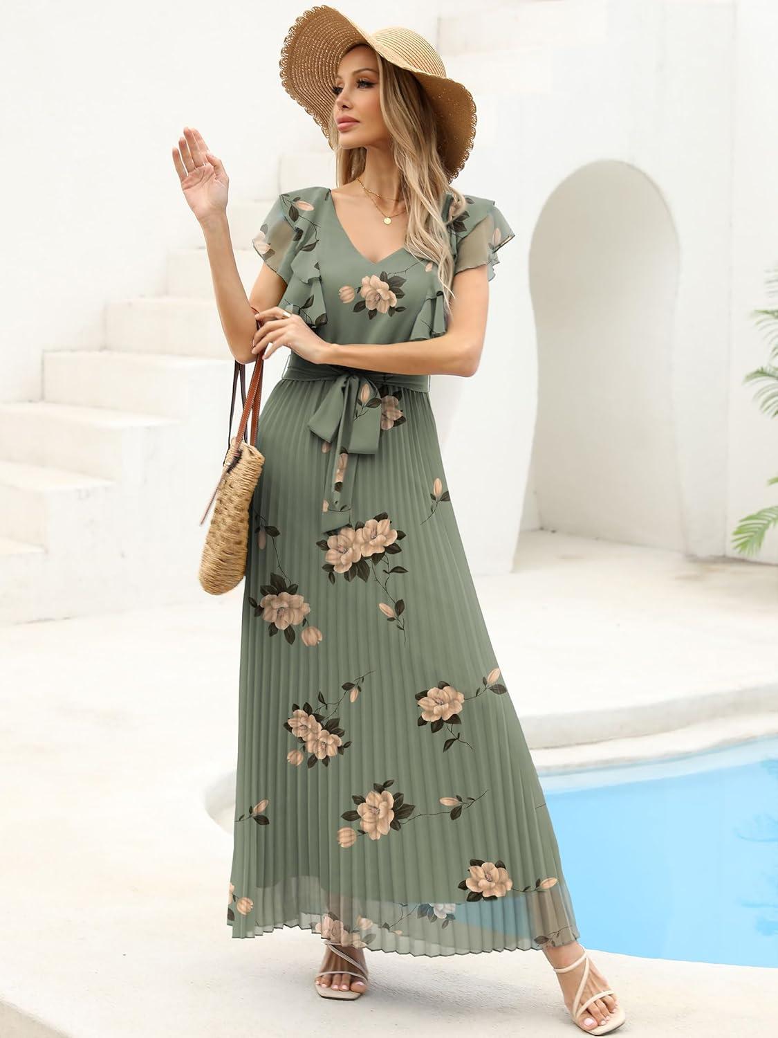 imageANRABESS Women V Neck Ruffle Sleeve Floral Pleated Maxi Dresses Summer Boho Belt Empire Waist Wedding Guest Party Flowy DressYellow Floral Green