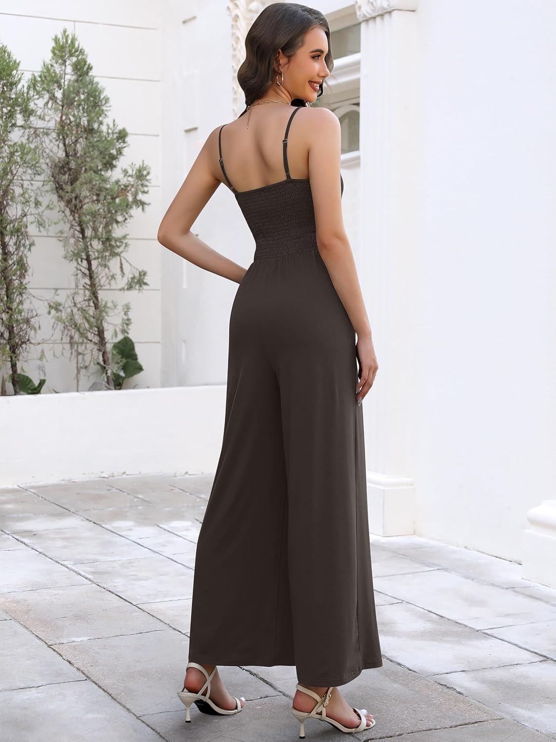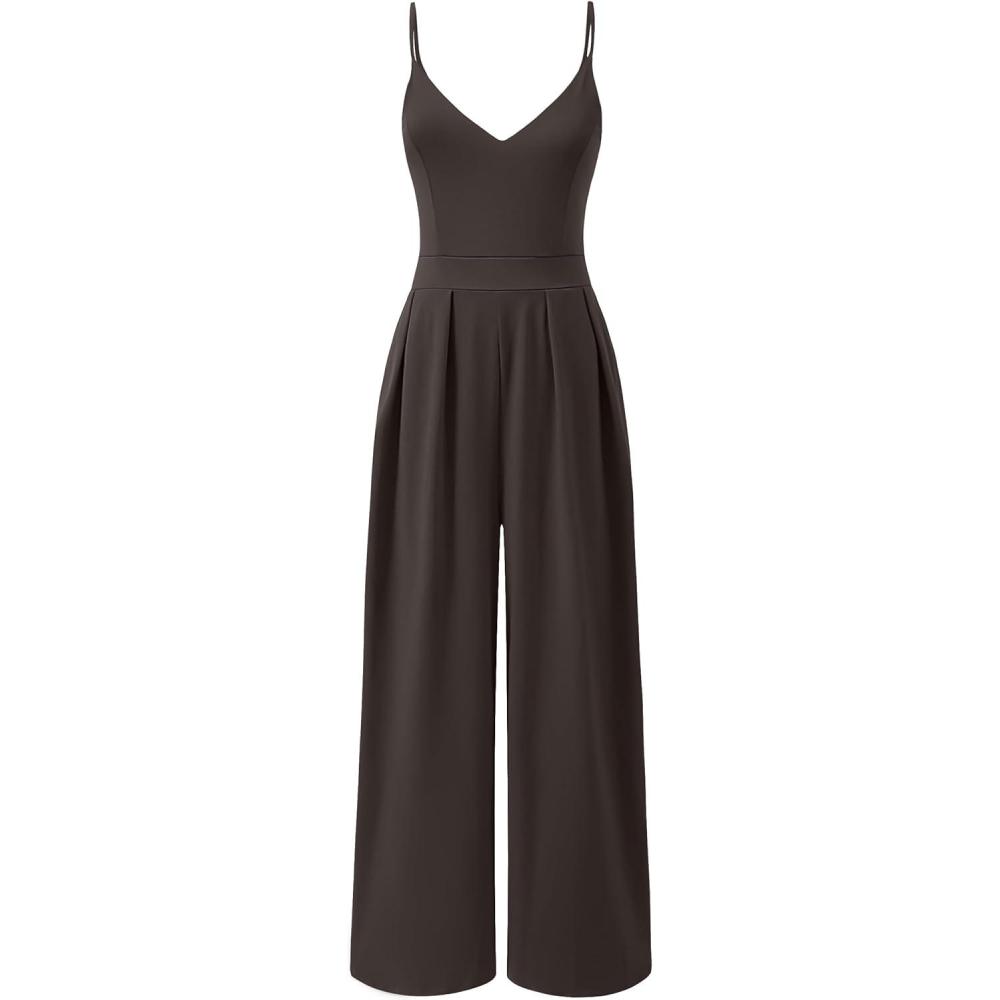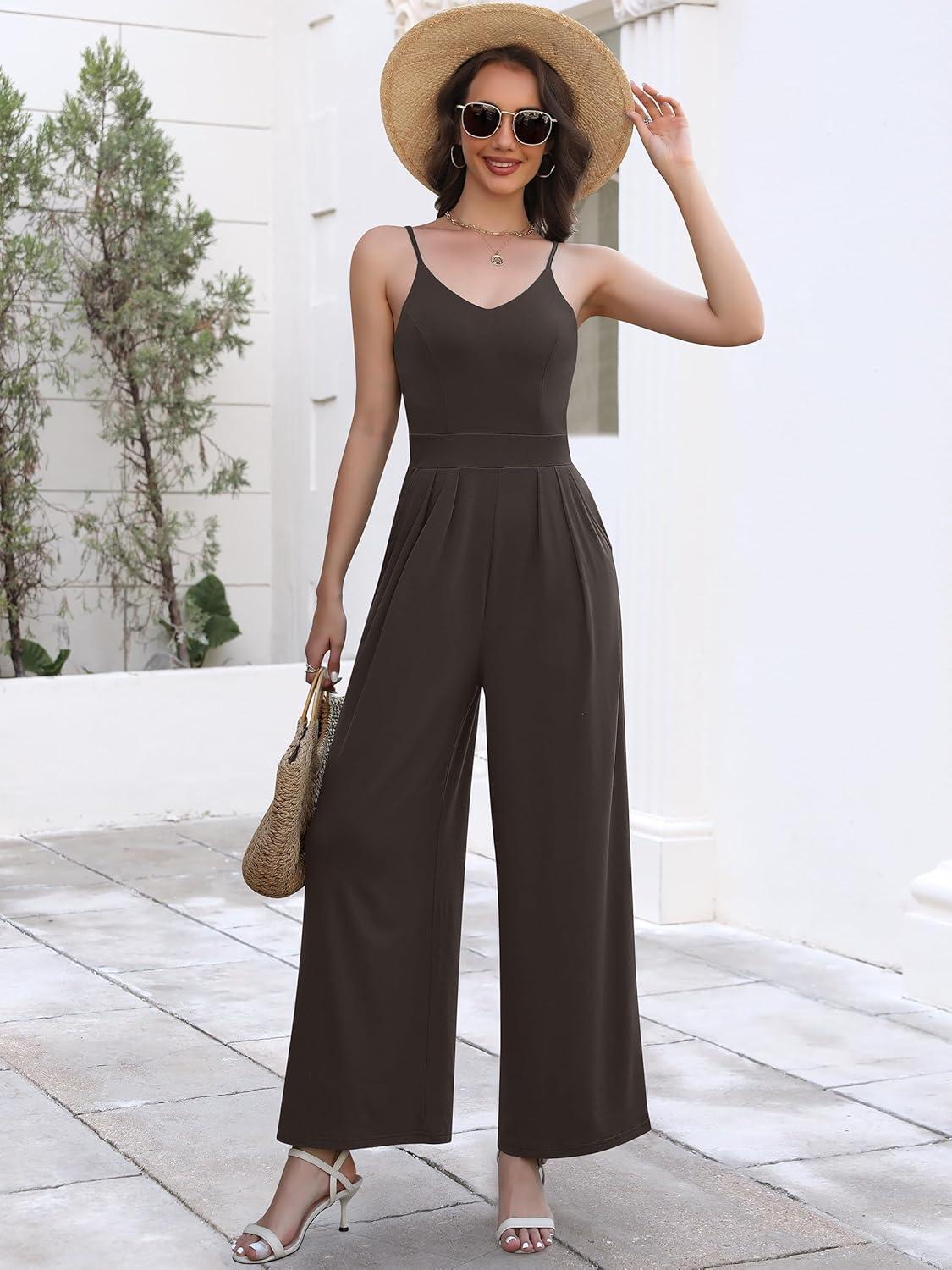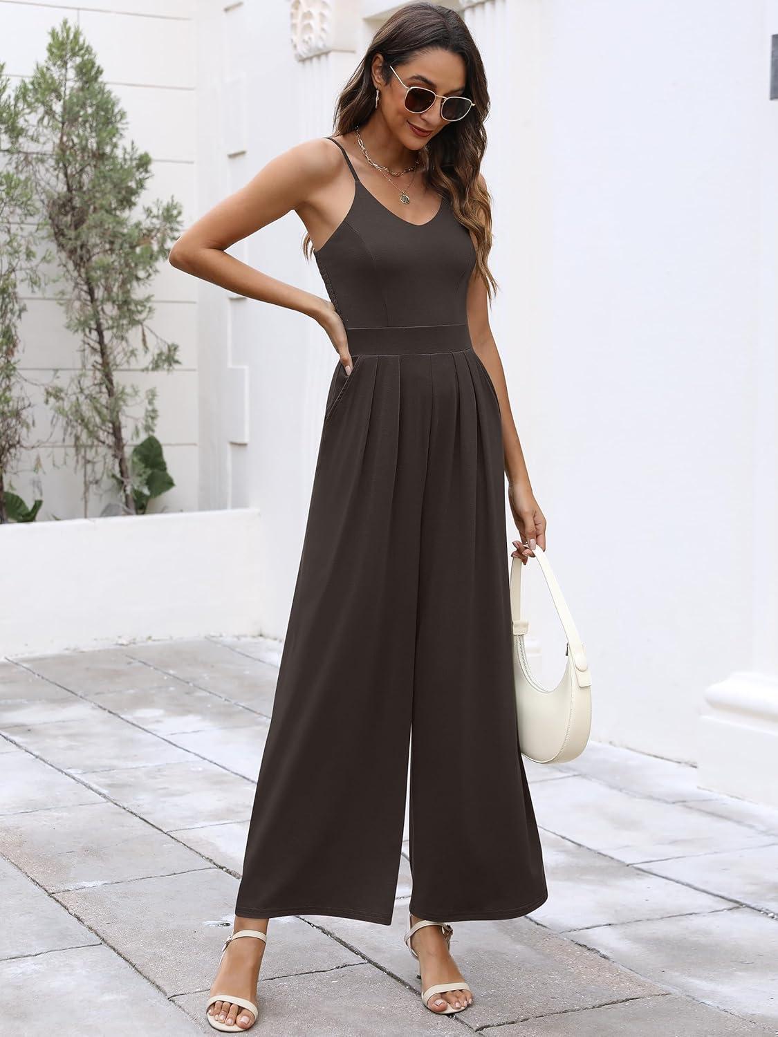 ANRABESS Women V Neck Spaghetti Strap Wide Leg Dressy Jumpsuits 2025 Summer Casual One Piece Jumper Romper Outfits & Pockets(Deep Brown)