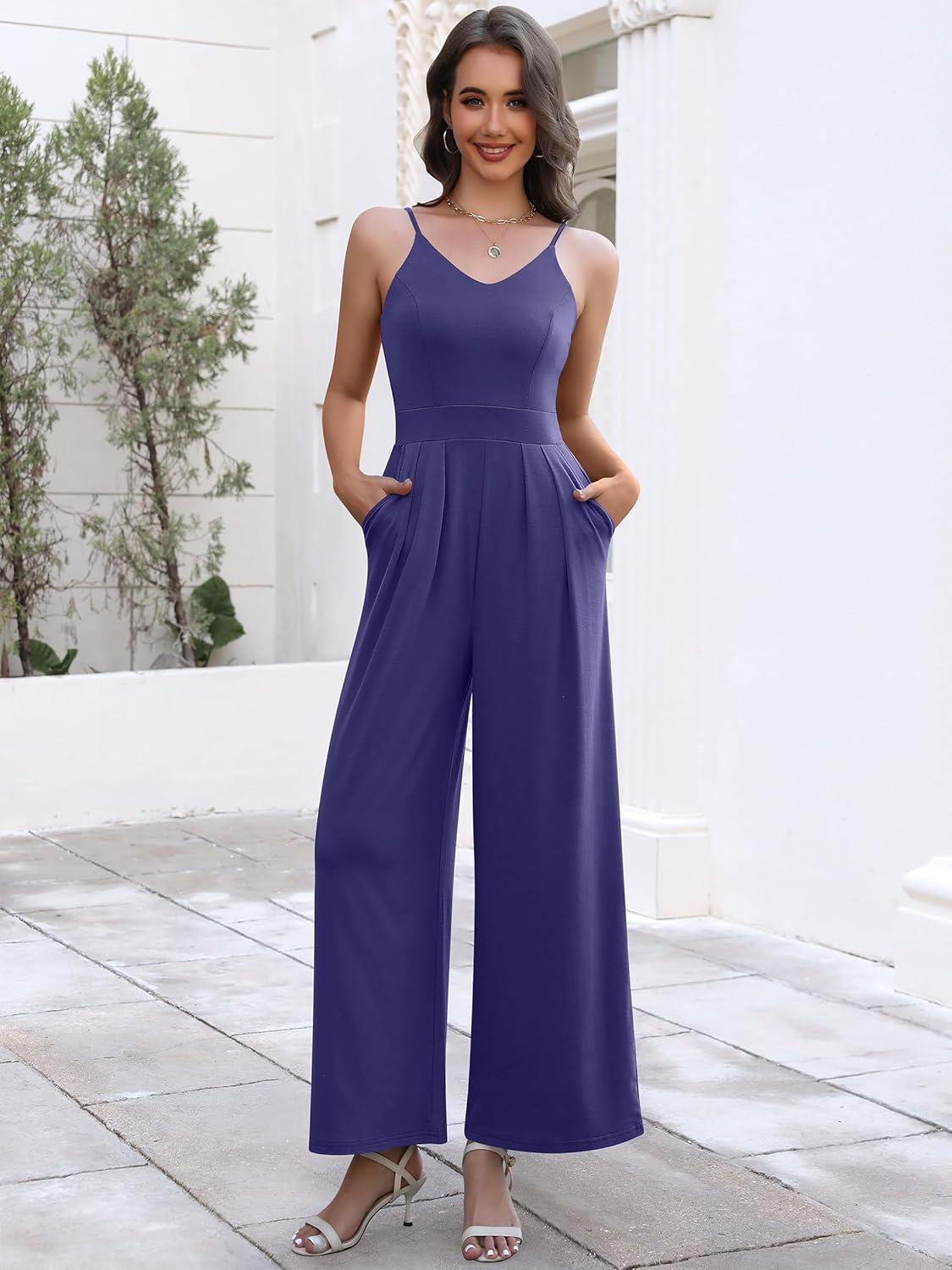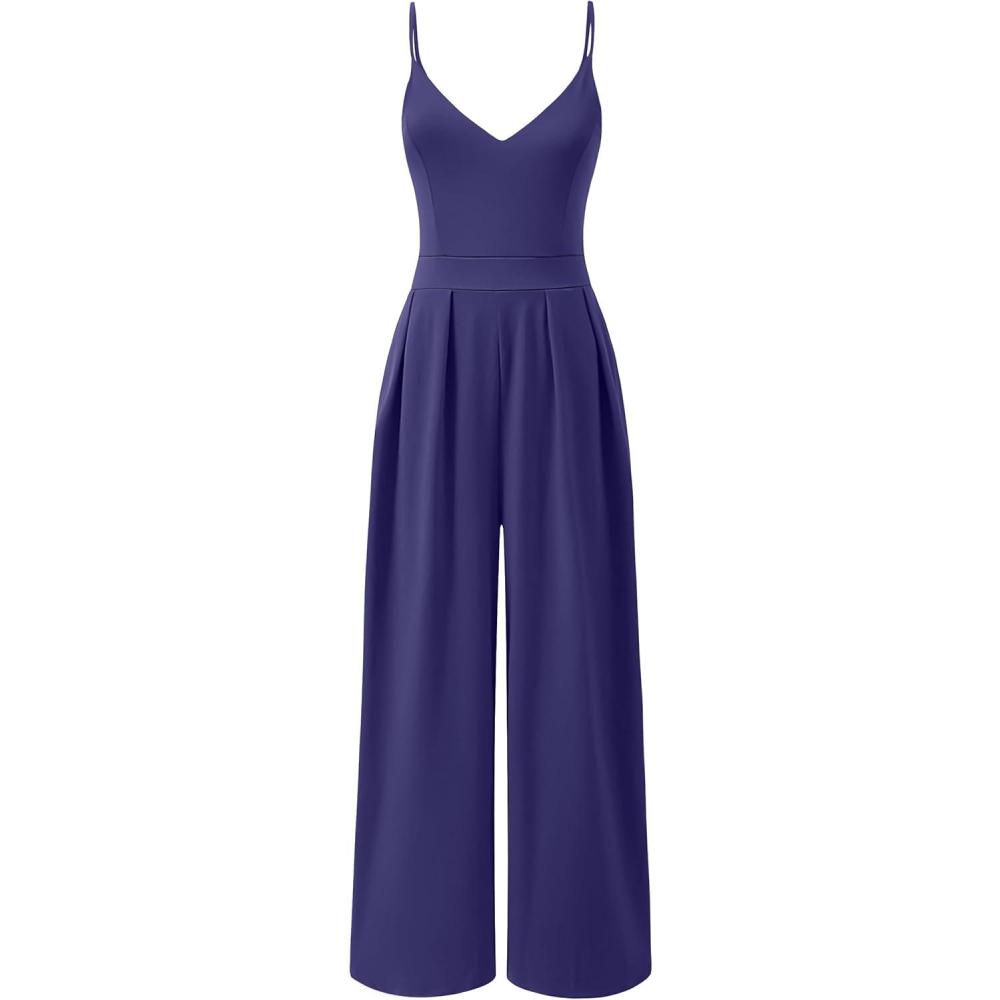 ANRABESS Women V Neck Spaghetti Strap Wide Leg Dressy Jumpsuits 2025 Summer Casual One Piece Jumper Romper Outfits & Pockets(Navy Blue)