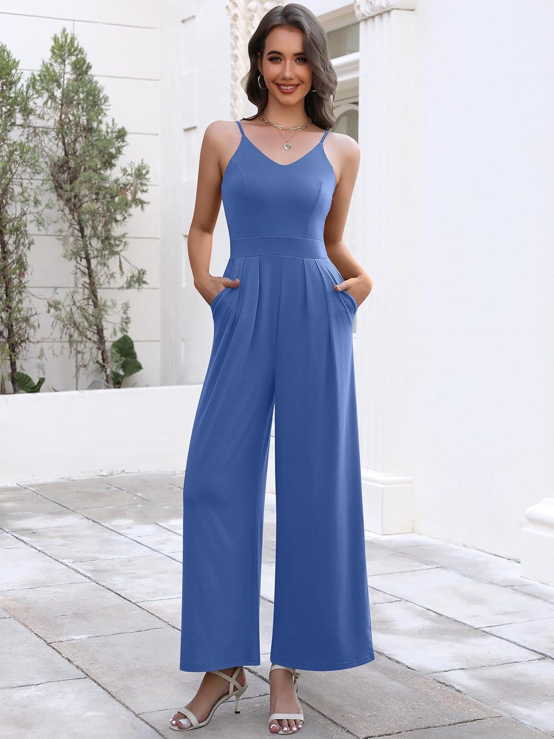 ANRABESS Women V Neck Spaghetti Strap Wide Leg Dressy Jumpsuits 2026 Summer Casual One Piece Jumper Romper Outfits & Pockets(Blue)