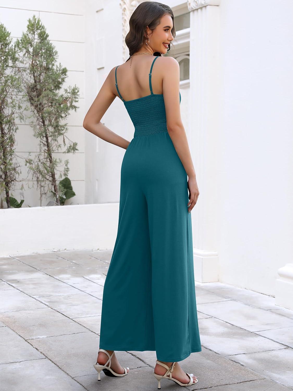 ANRABESS Women V Neck Spaghetti Strap Wide Leg Dressy Jumpsuits 2026 Summer Casual One Piece Jumper Romper Outfits & Pockets(Lake Green)