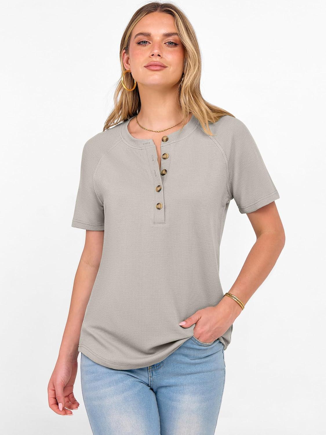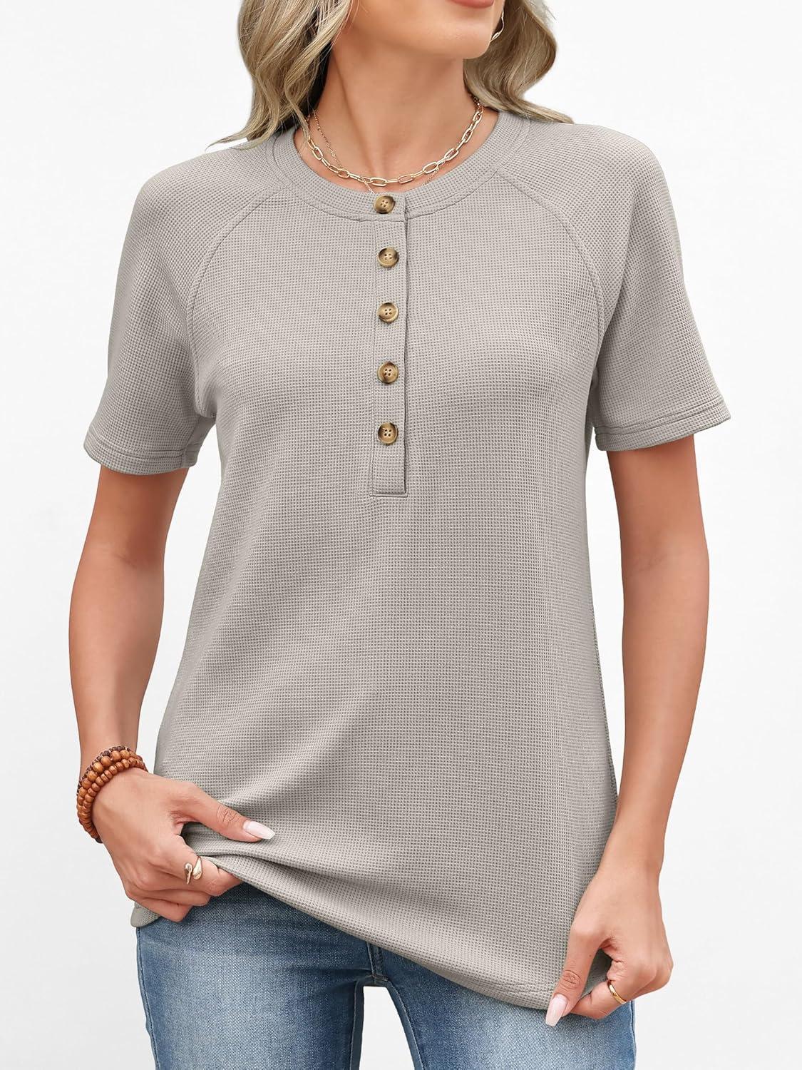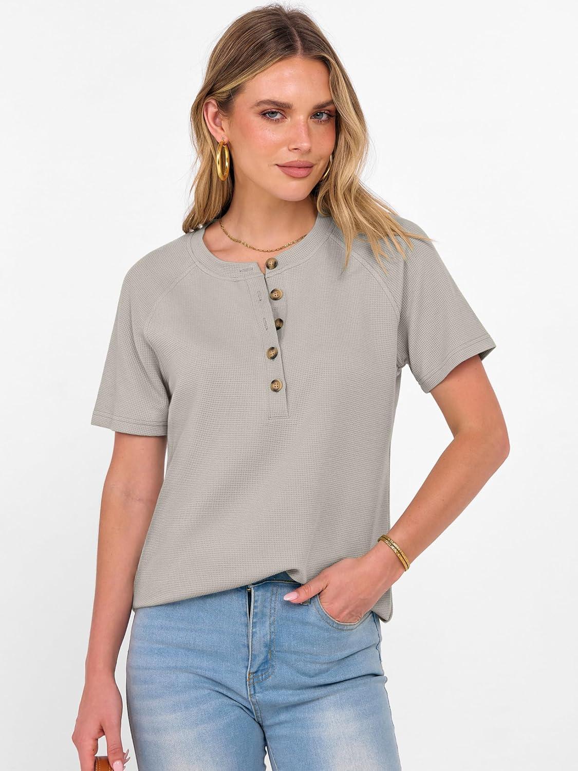 ANRABESS Women Waffle Knit Tops Short Sleeve Henley Shirts Dressy Casual Blouse 2026 Spring Fashion Outfits Trendy Clothes(Grey)