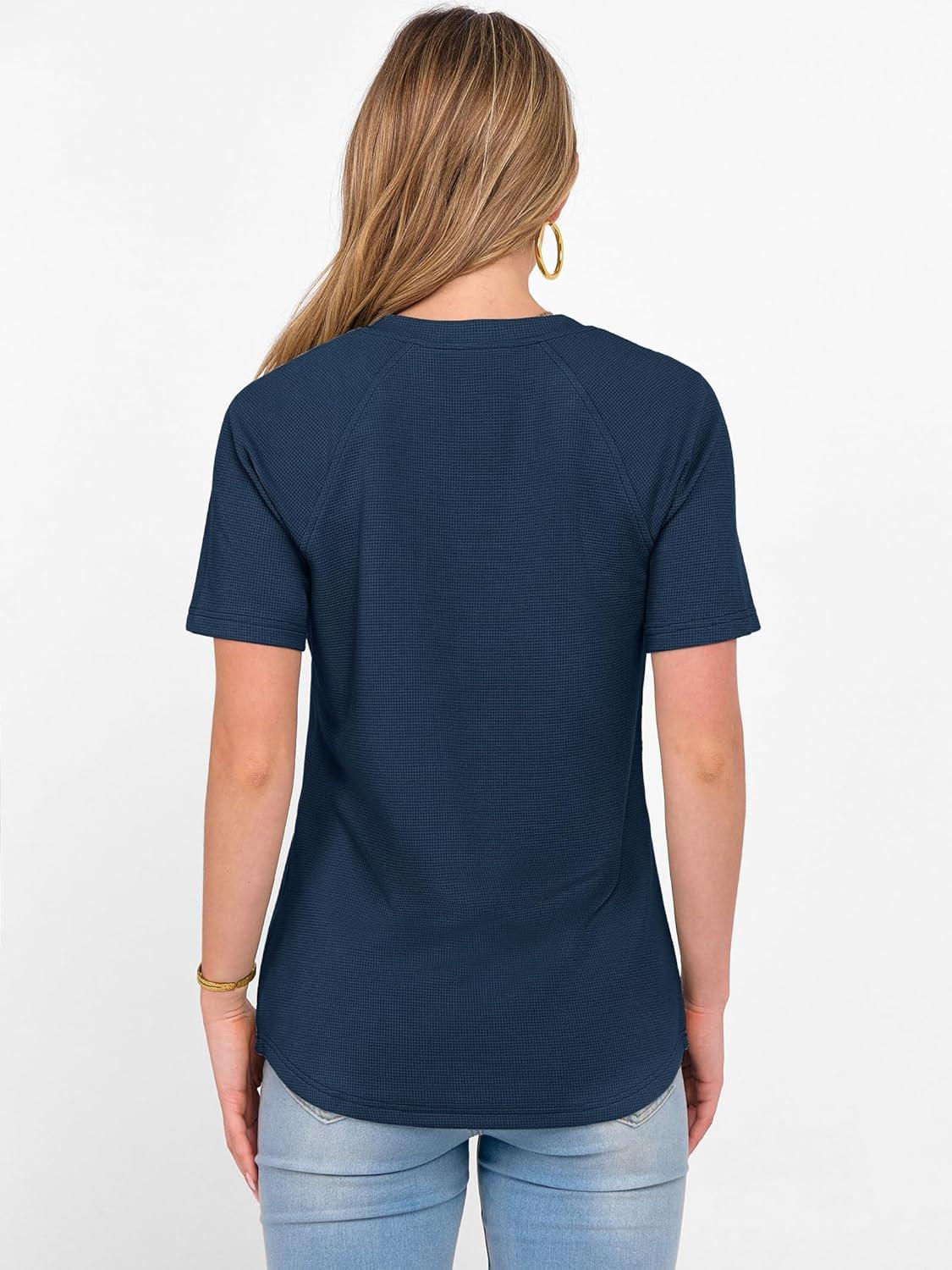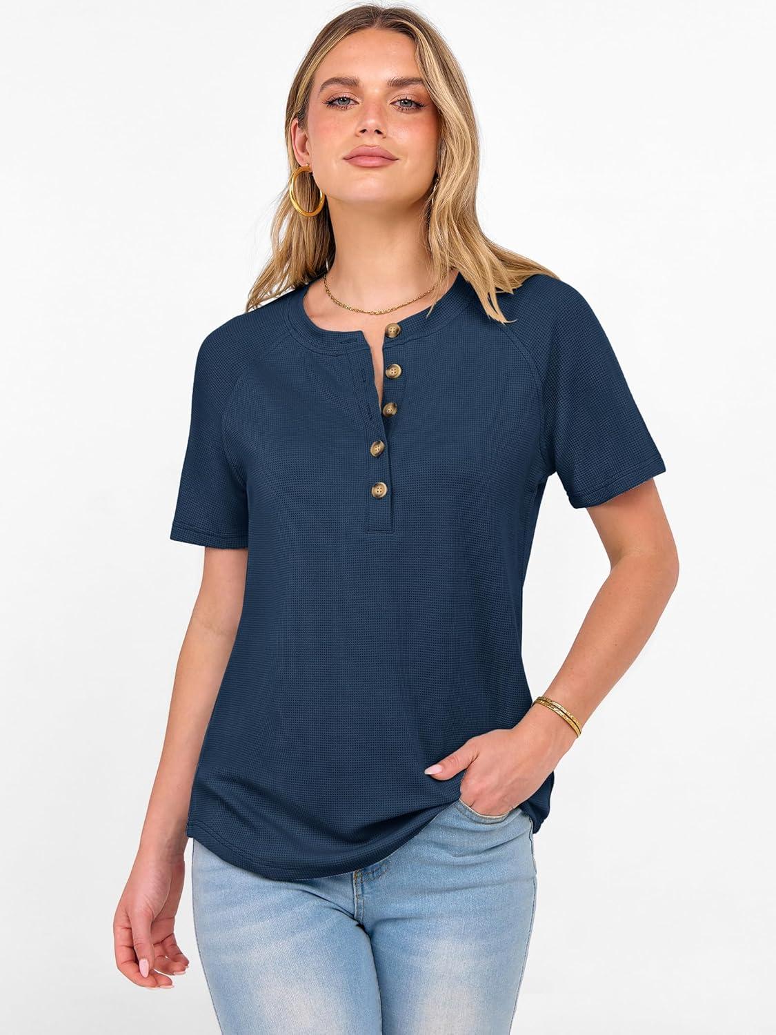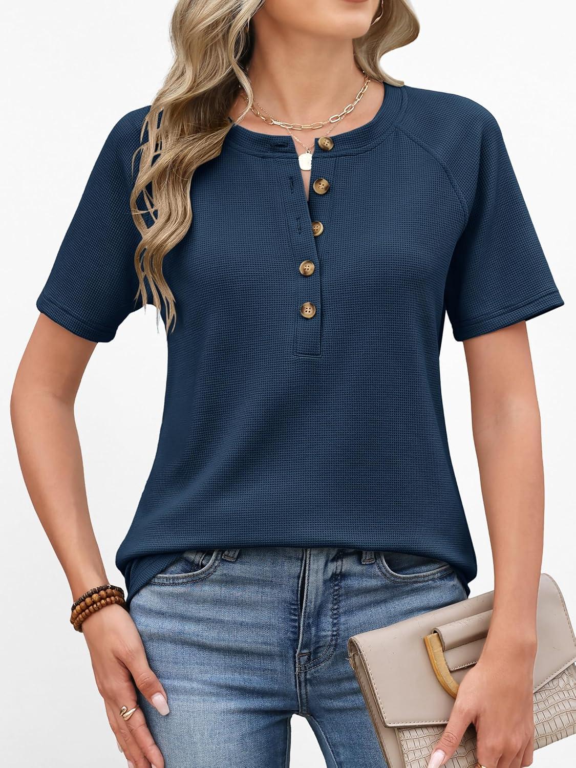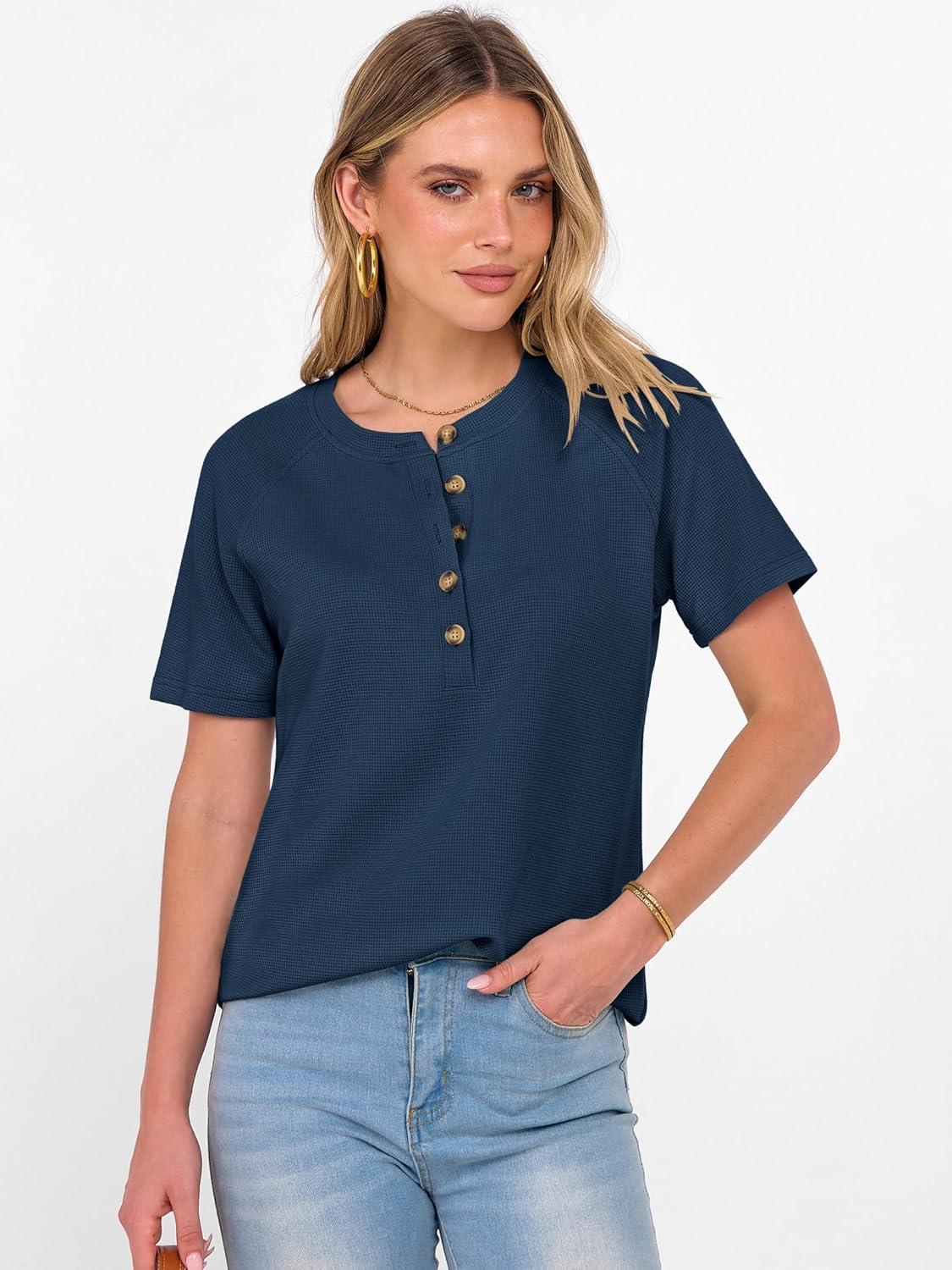 ANRABESS Women Waffle Knit Tops Short Sleeve Henley Shirts Dressy Casual Blouse 2026 Spring Fashion Outfits Trendy Clothes(Navy Blue)