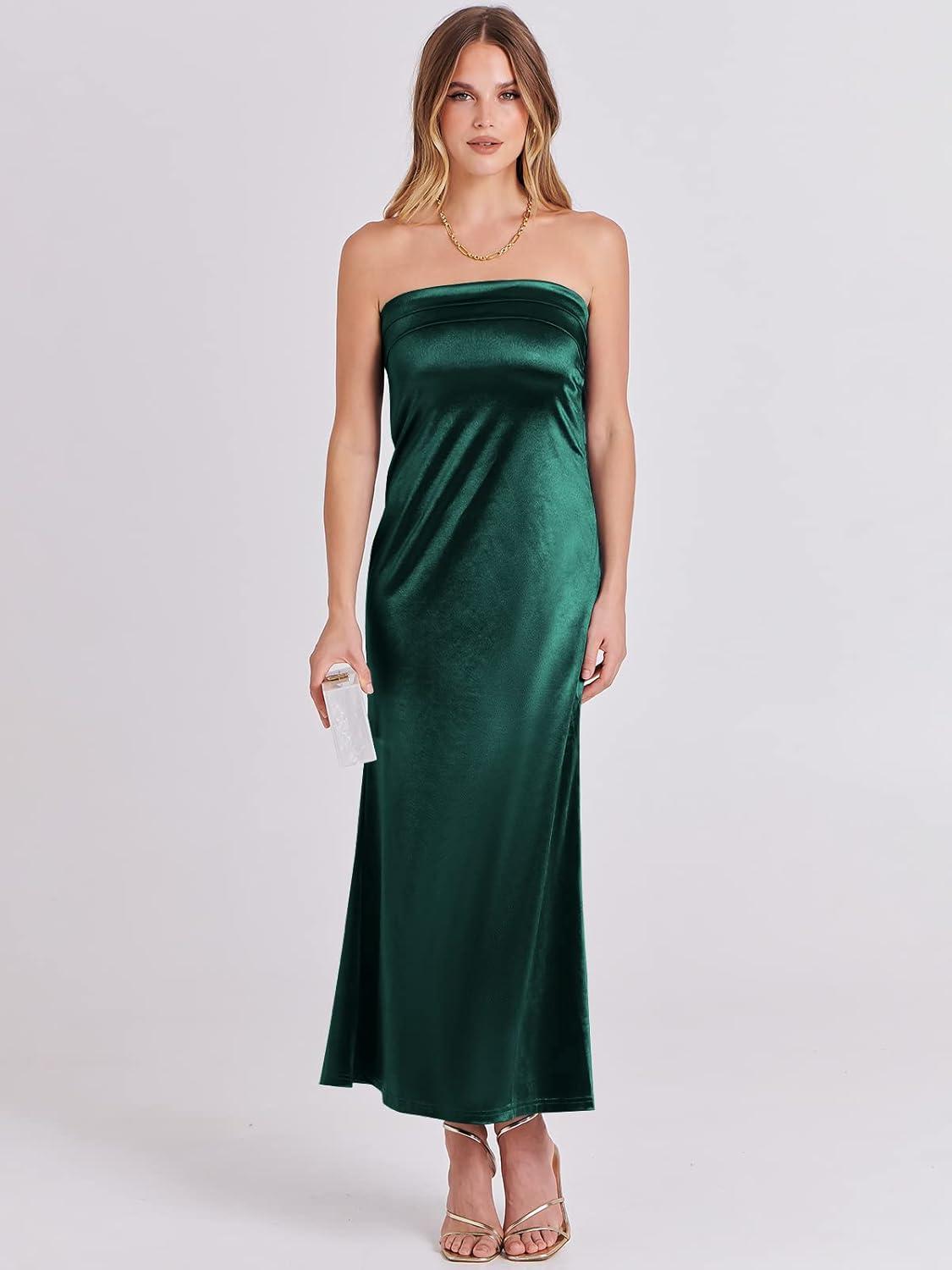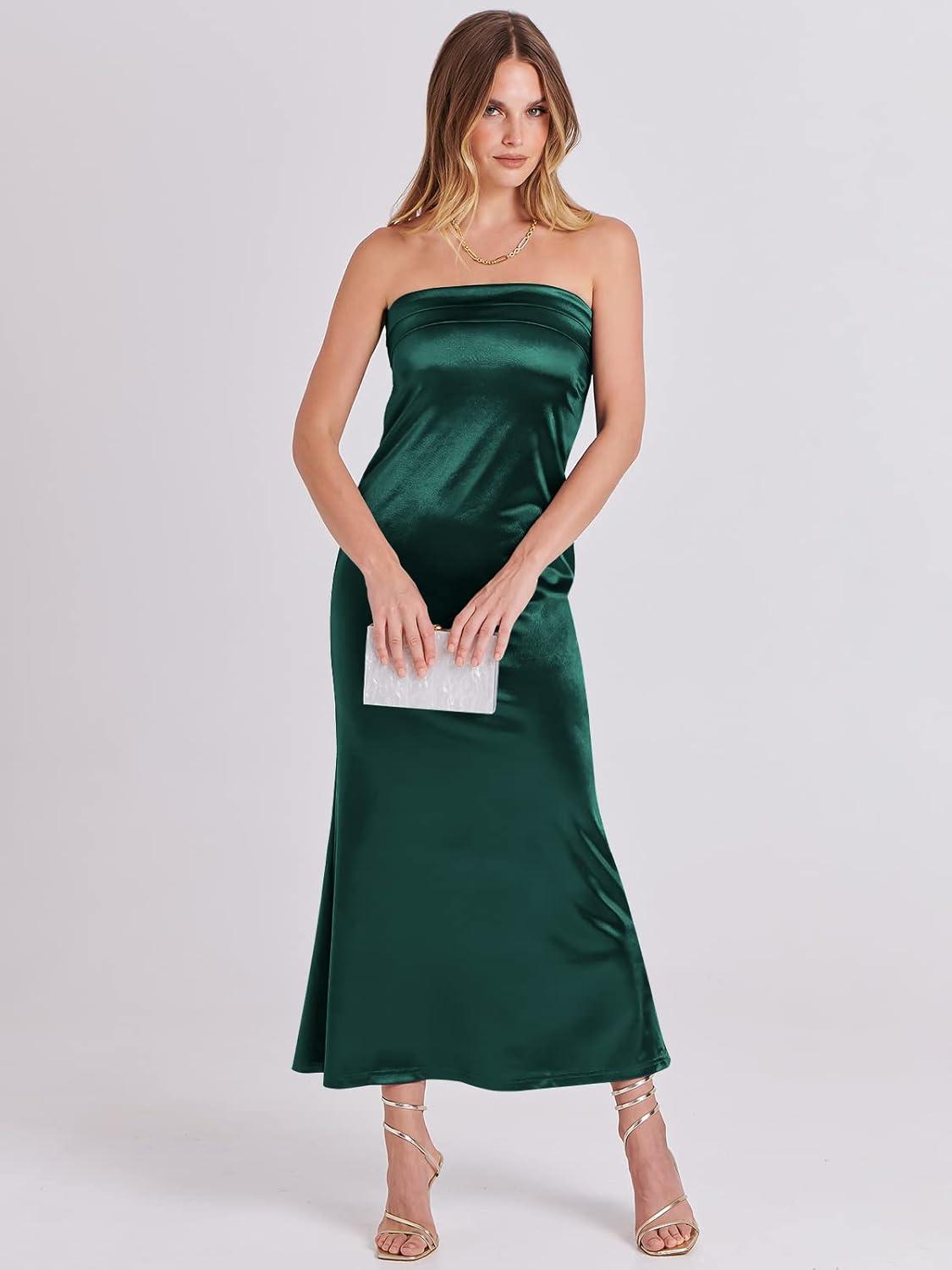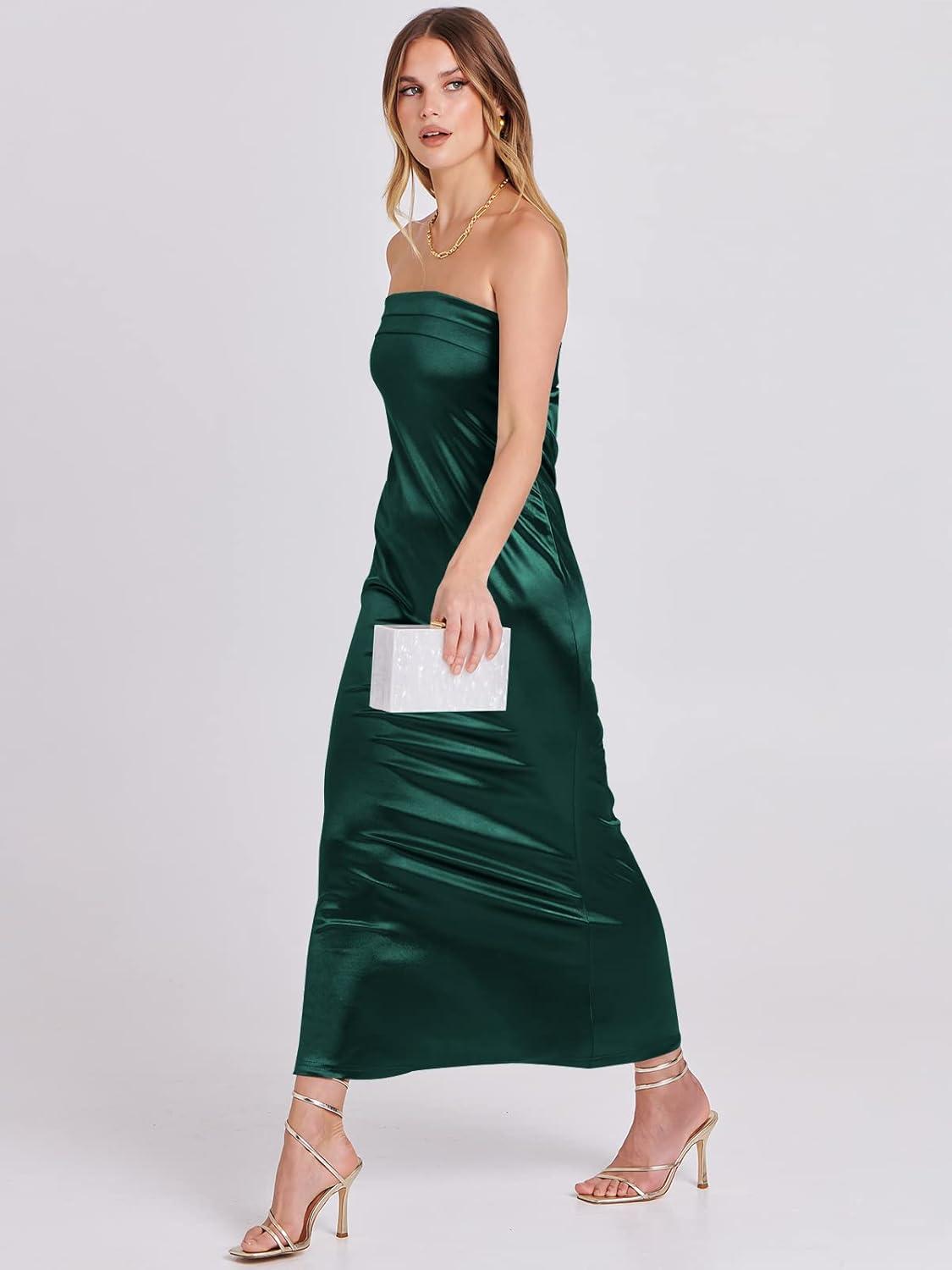 ANRABESS Women Wedding Guest Maxi Dress Strapless Satin Tube Bodycon Backless Cocktail Formal Dresses 2025 Fall(Deep Green)